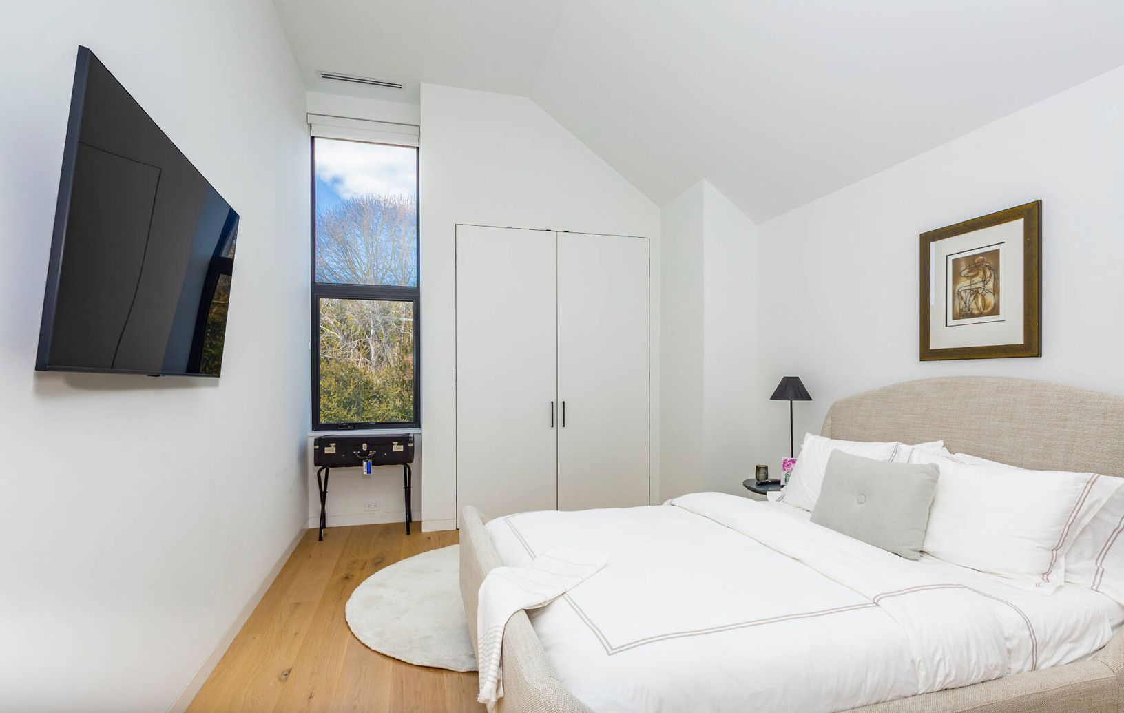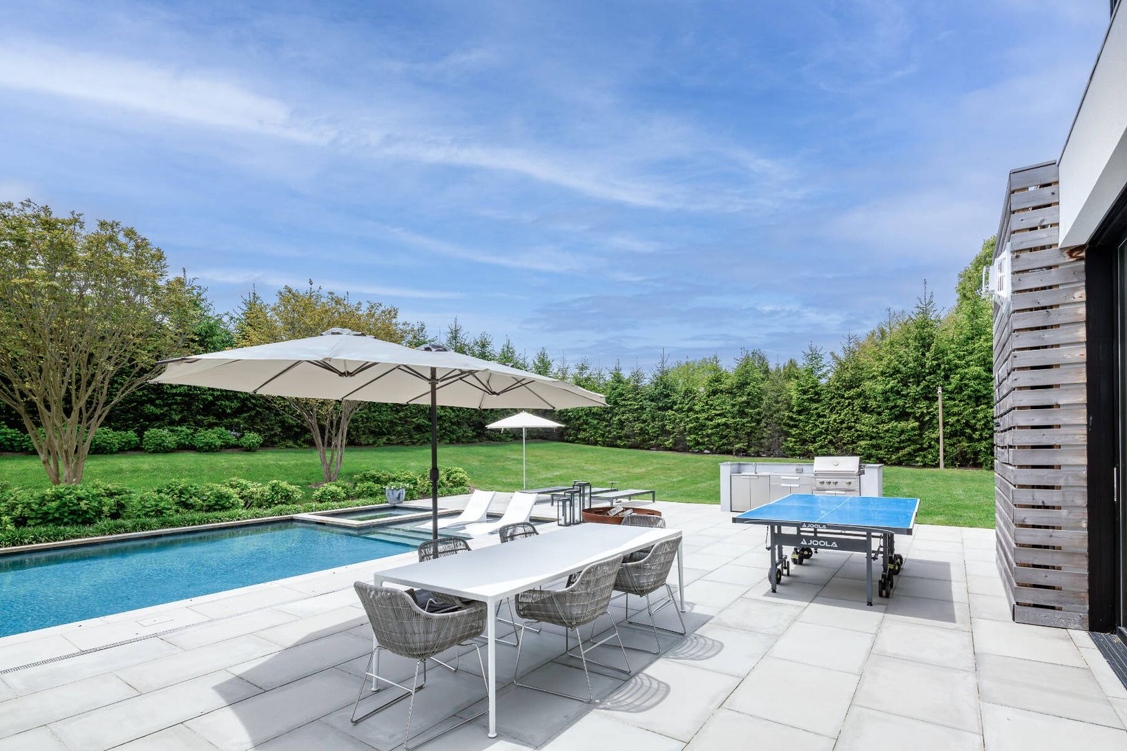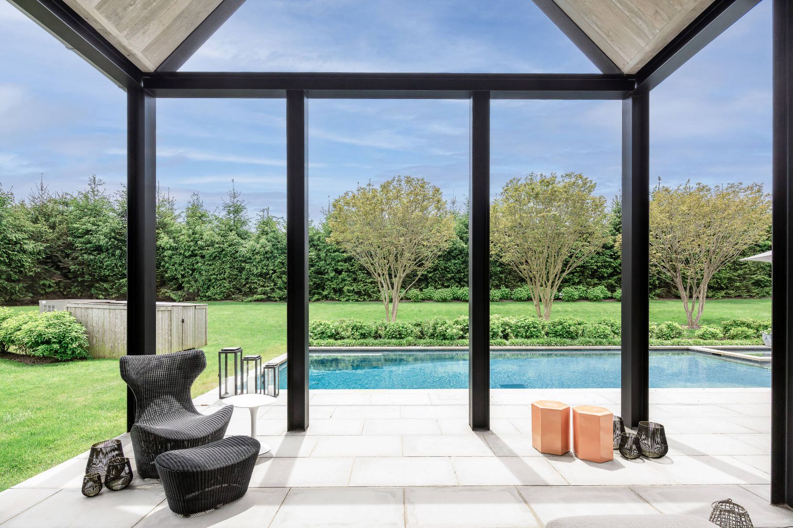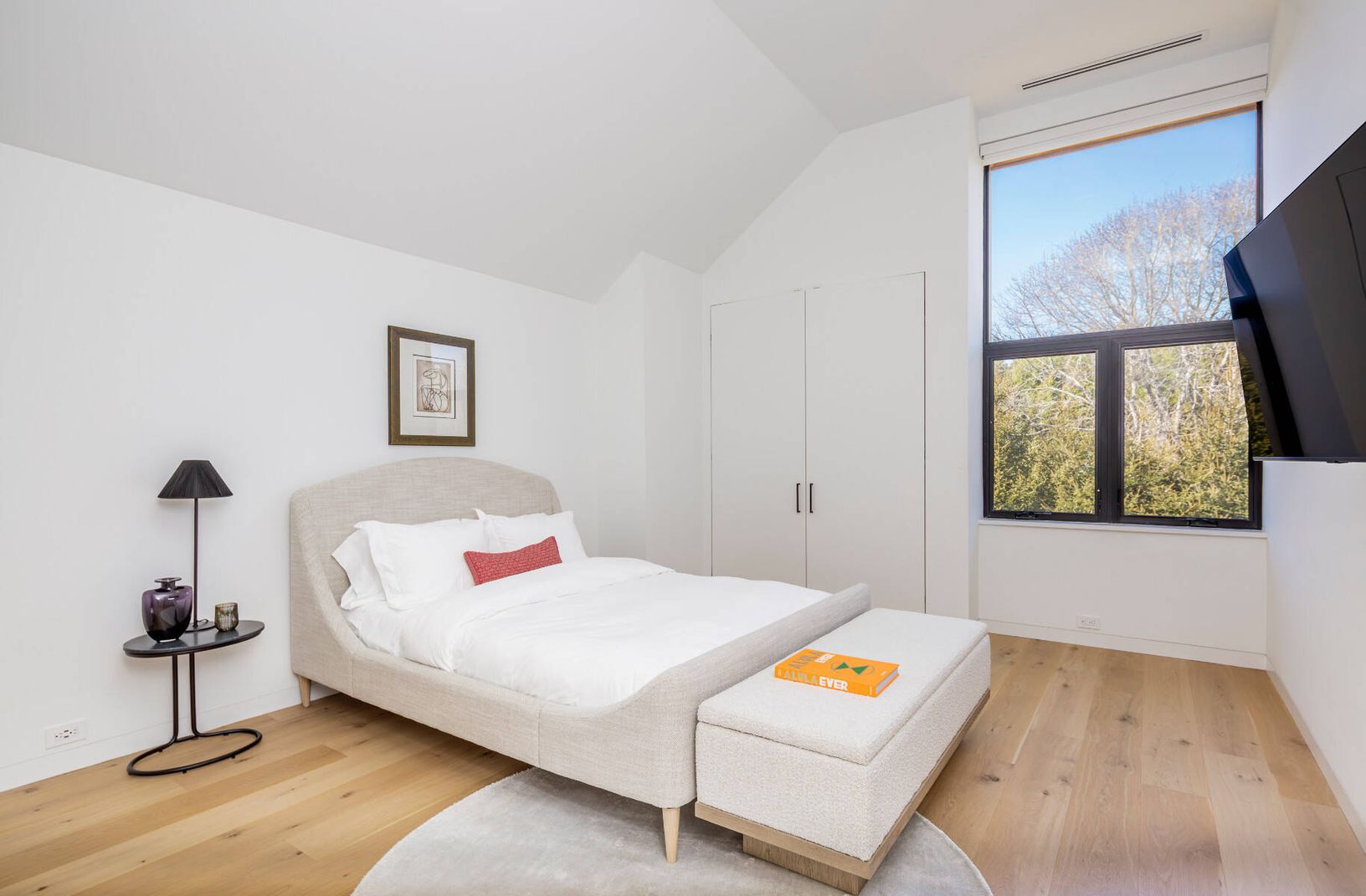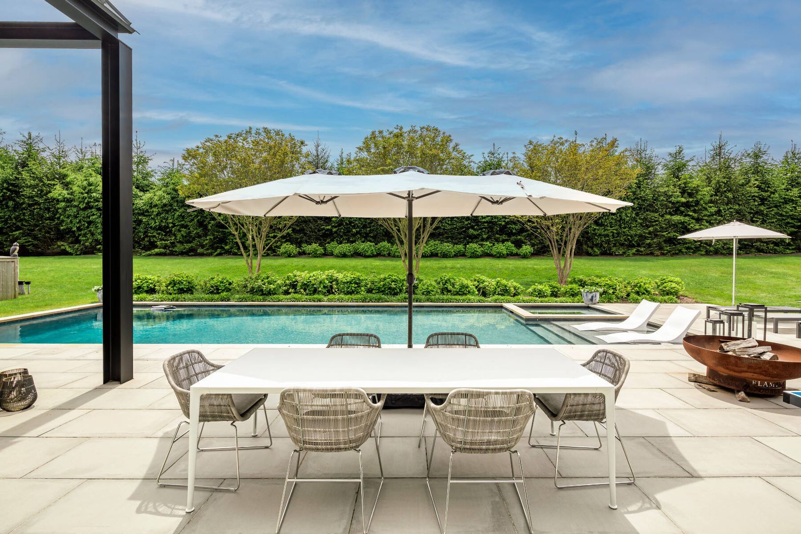 This stunning contemporary home offers 5,800± sq. ft. of impeccably designed living space with five bedrooms and six full baths. Thoughtfully designed for comfort and accessibility, the home is handicap-friendly, featuring wide entryways, an open layout, and a first-floor primary suite to ensure ease of movement throughout. Walls of glass, custom steel-framed doors, LaCantina sliders, and soaring ceilings fill the home with natural light. The