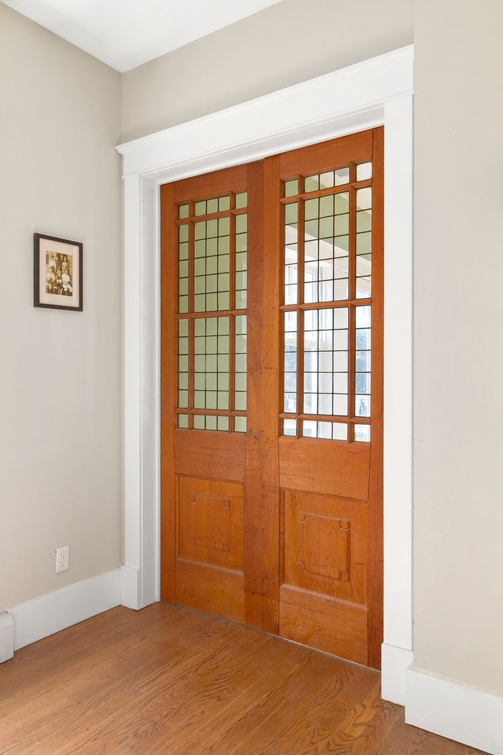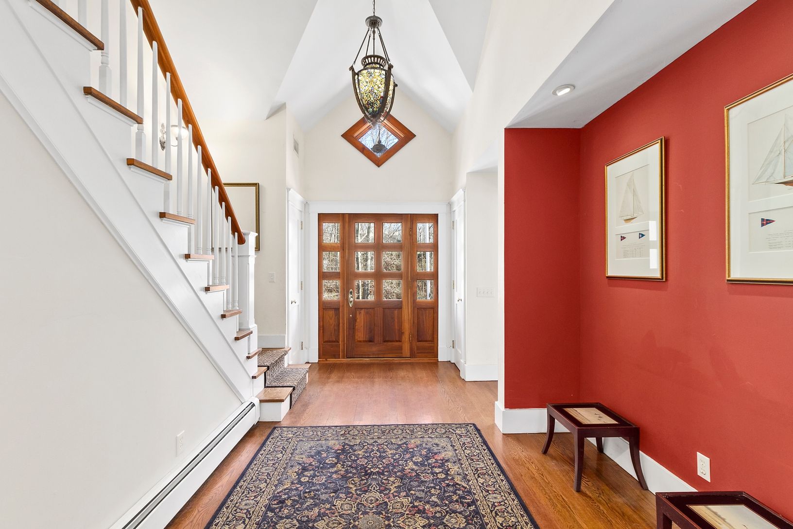 Custom traditional built in 2004 on 1.2 acres with deeded water access bordering Noyac Golf Course and County park land. Double height entrance leads to living room and dining room both with fireplace. Beautiful walnut and Savoy Hotel (London) doors complete the craftsmanship of the interior. Kitchen with butcher block counter tops, double sinks, gas range and center island. Three first floor bedrooms and one and one half baths, second floor m
