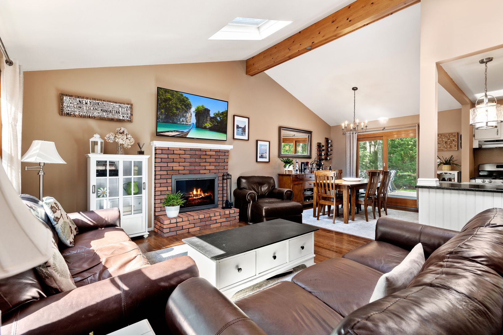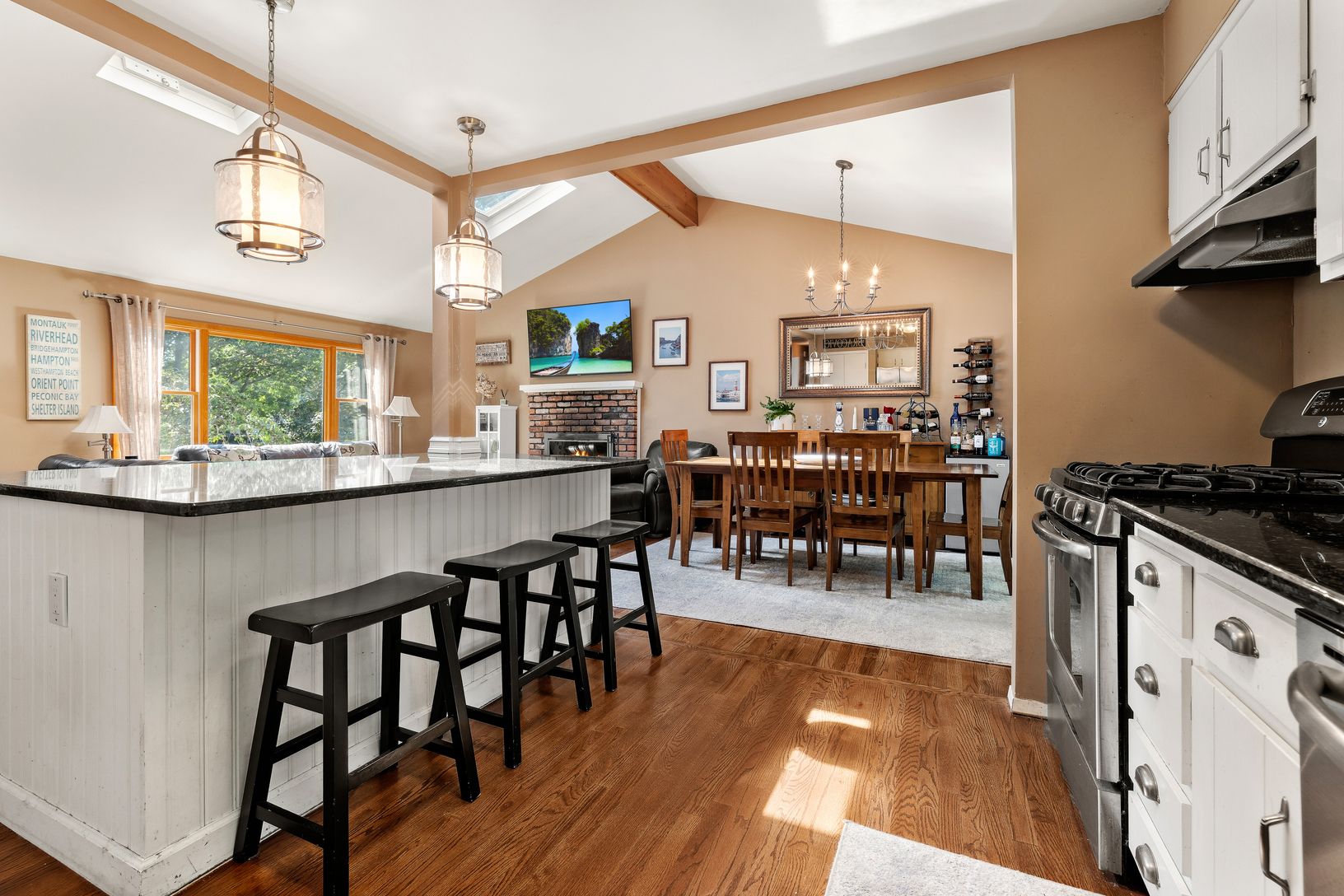 Welcome to 18 Evergreen Lane, a delightful blend of comfort and elegance, situated in the heart of East Quogue. Boasting three inviting bedrooms and one and a half bathrooms, this home encapsulates a modern open floor plan that exudes warmth and hospitality. The living room, accentuated by a cozy wood-burning fireplace, effortlessly flows into a dining space, making it perfect for hosting. The adjoining kitchen, equipped with a centre island,