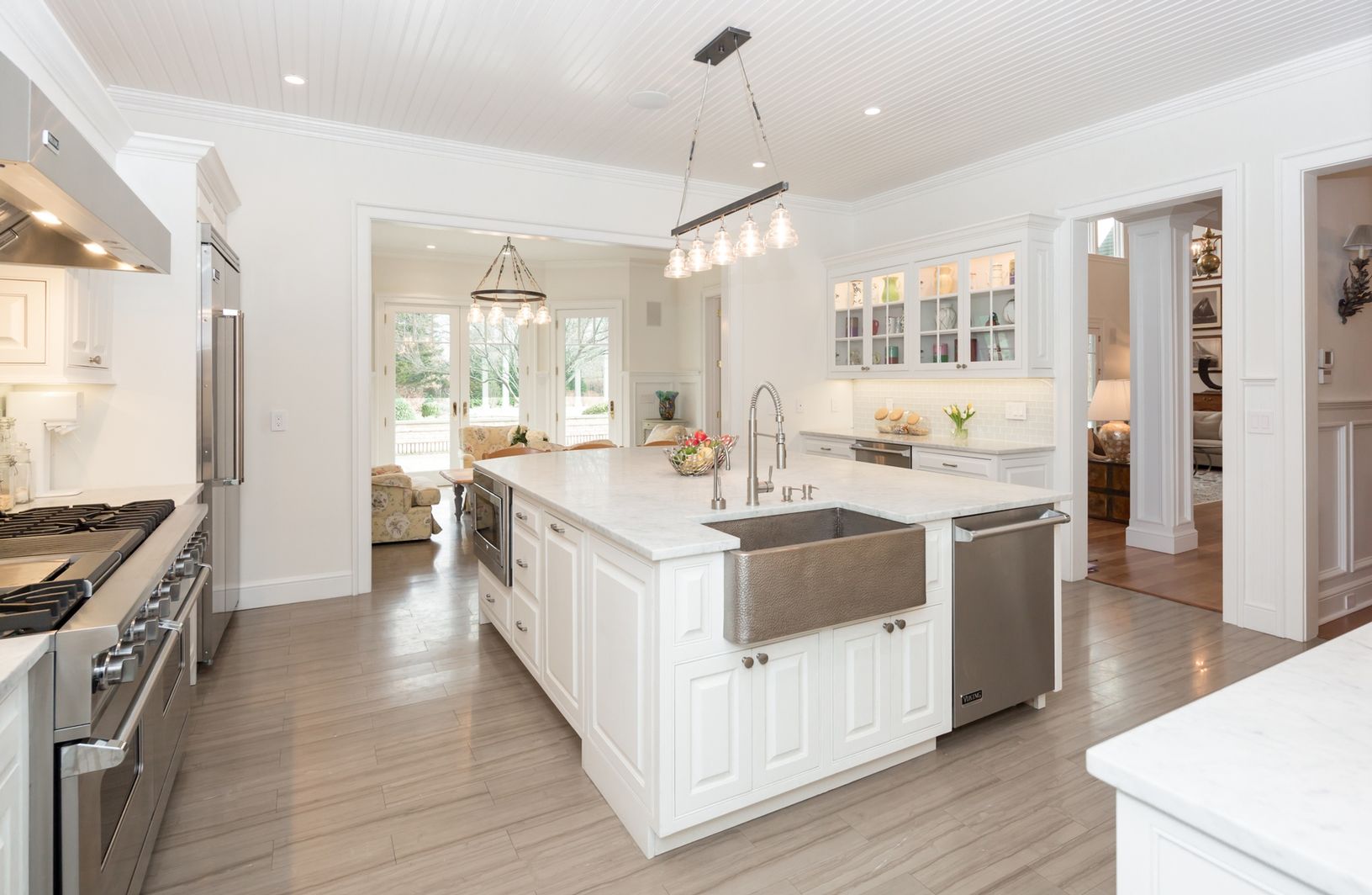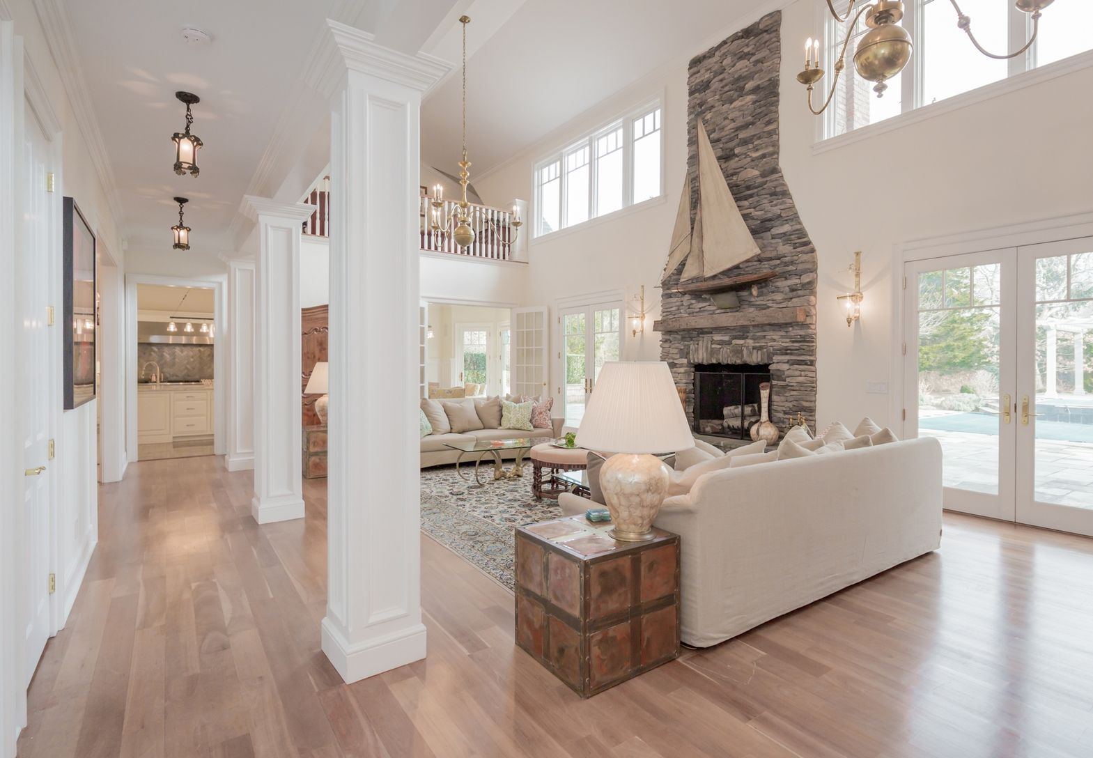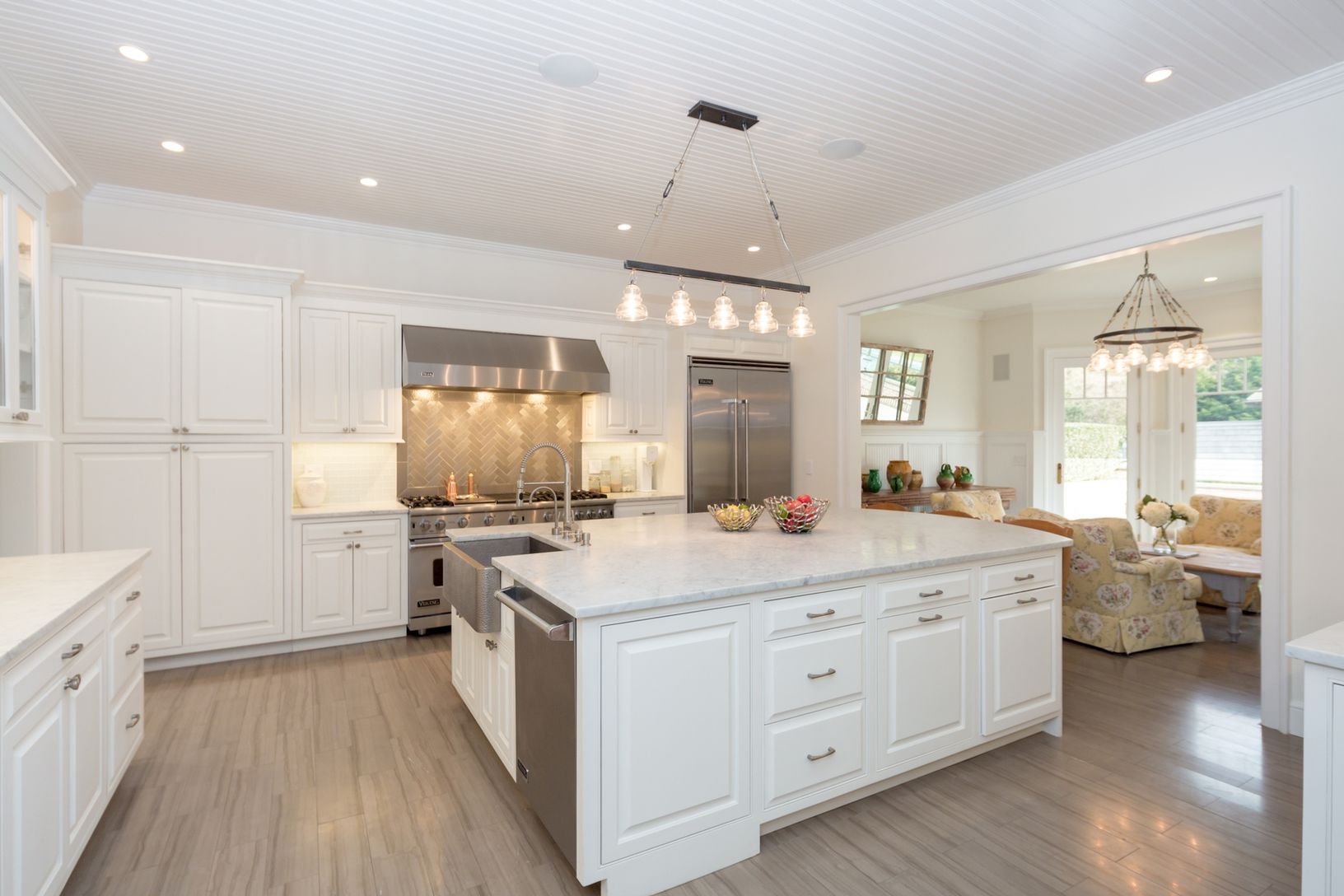 In a rarefied location off Further Lane less than a mile to both the beach and town, this recently renovated, 6 bedroom, 8,000+/- square foot traditional offers enviable indoor-outdoor flow with a wall of French doors leading to an expansive bluestone terrace with outdoor fireplace, 60' heated, gunite pool, spa with waterfall element, pool house, and verdant gardens on 1.5 acres. The home centers on the soaring great room with Cherry Oak hardw