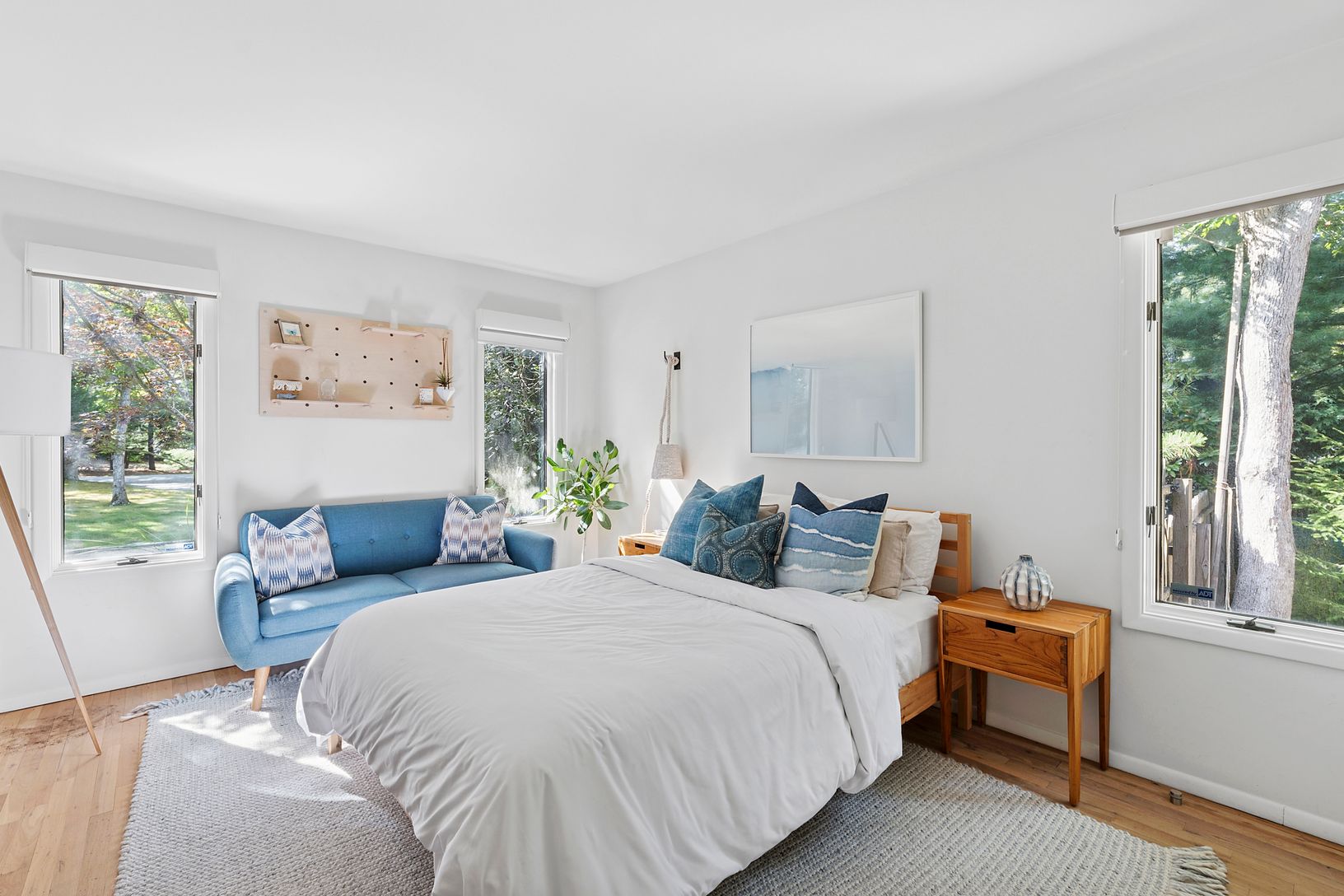 This beautiful East Hampton 3 bed, 2 bath contemporary is the ideal summer retreat. Located in a small harbor front community; enjoy privacy, serenity and easy access to all the Hamptons has to offer. Enter the home through the front porch to an open and bright living space. The double-height living room is open to the kitchen and dining rooms and has a large fireplace. This chic and stylish home has two large bedrooms downstairs and an expans