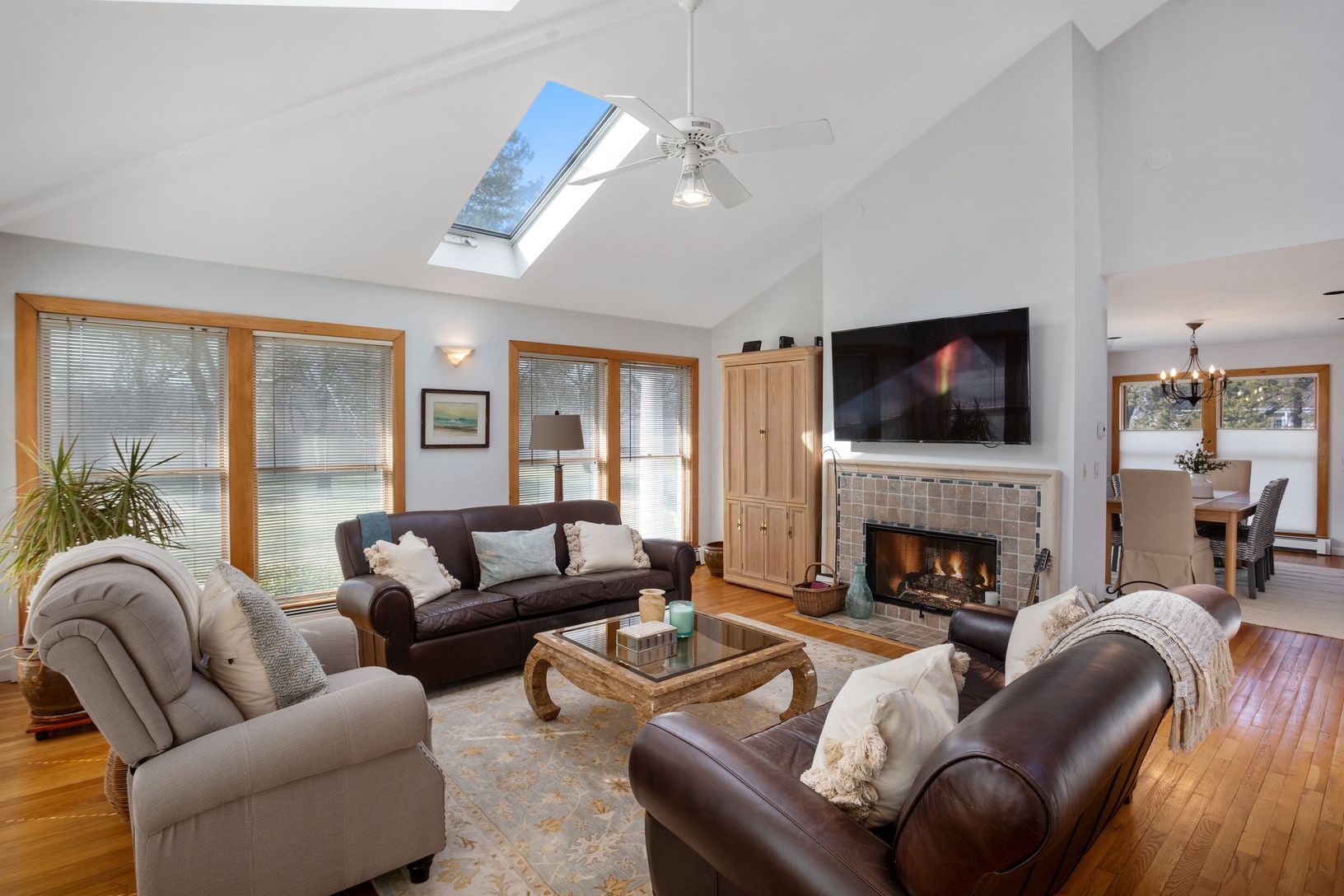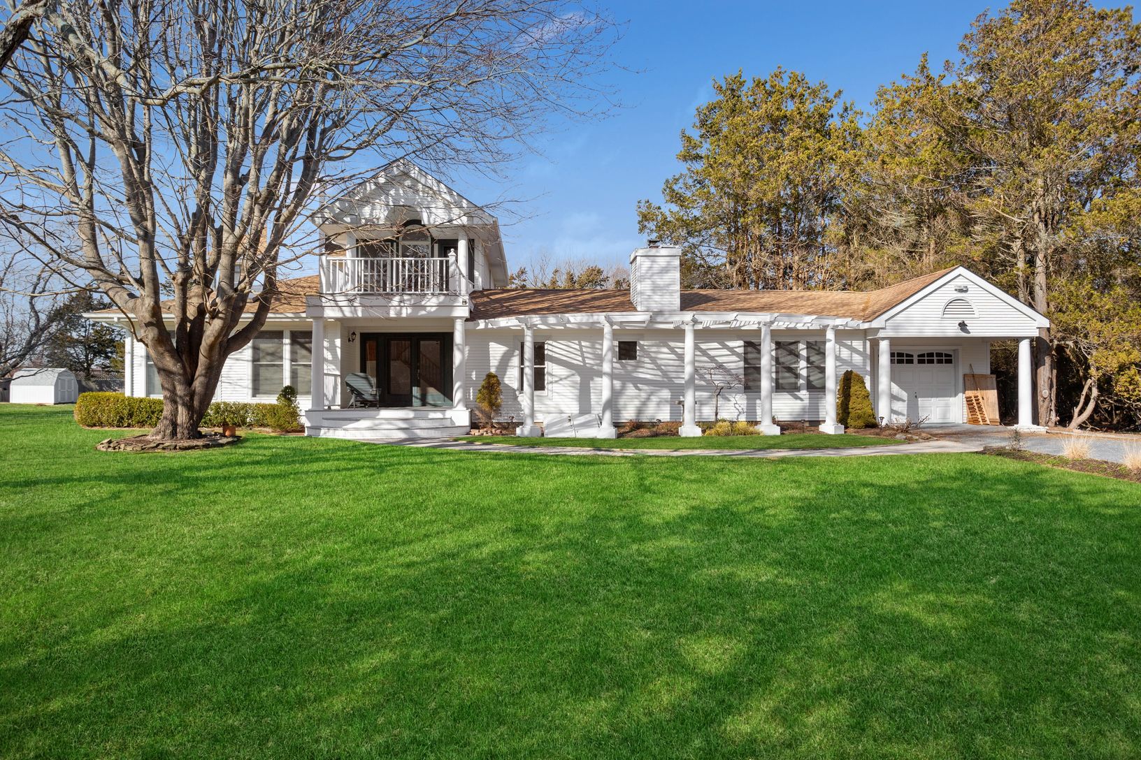 In East Moriches’s most desirable neighborhood, you’ll find this nearly 3000 square-foot postmodern home on a very private flag lot. Enter via a private gated drive into your own 1.2 acre fenced sanctuary. Natural wood abounds in this light filled, warm comfortable home. Everything has been updated and beautifully maintained. Eat in kitchen with stainless and Granite. Double sided fireplace between living room and formal dining room. Huge mast