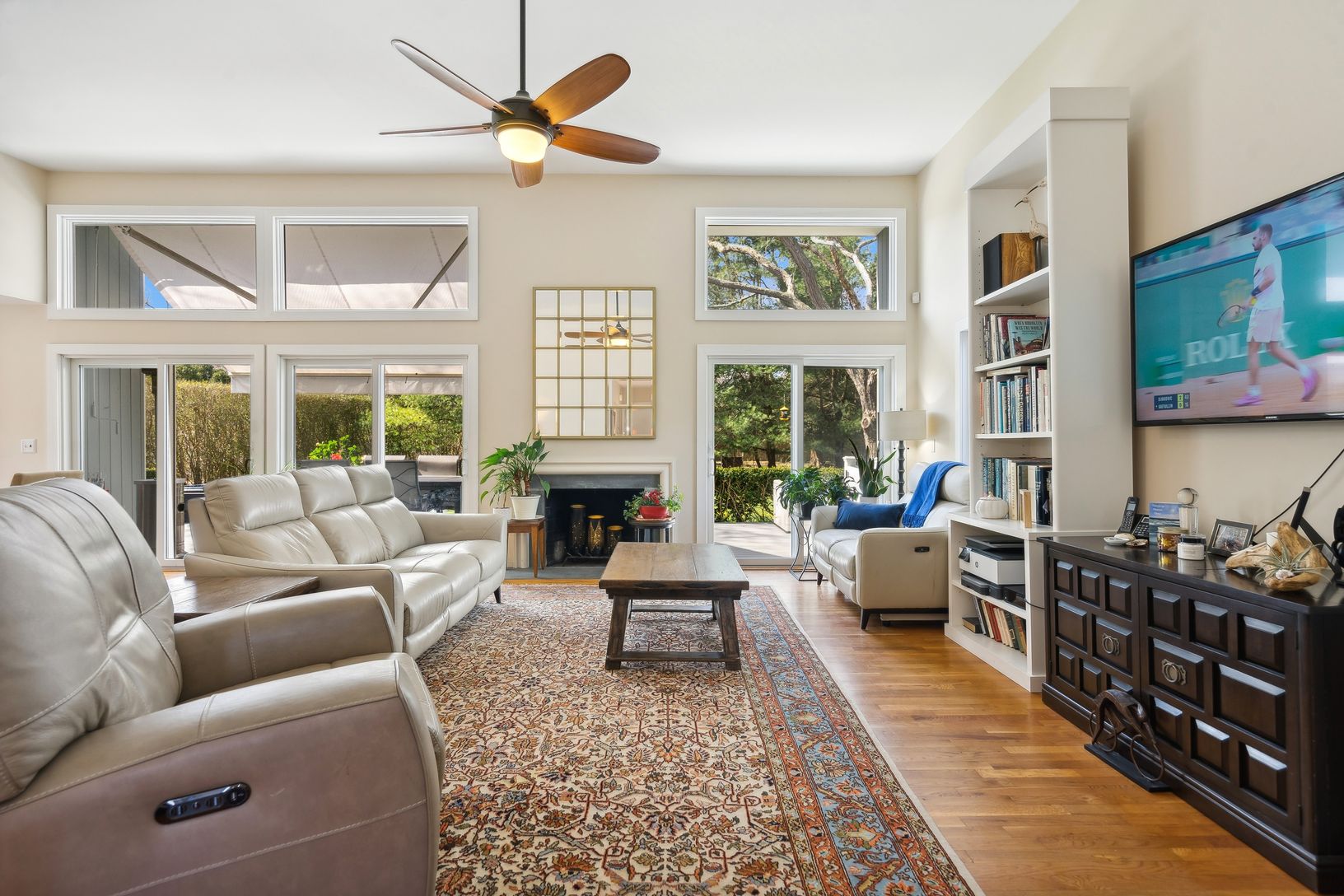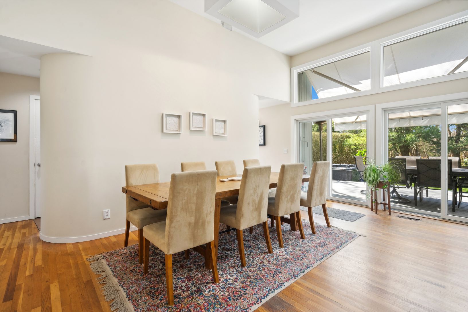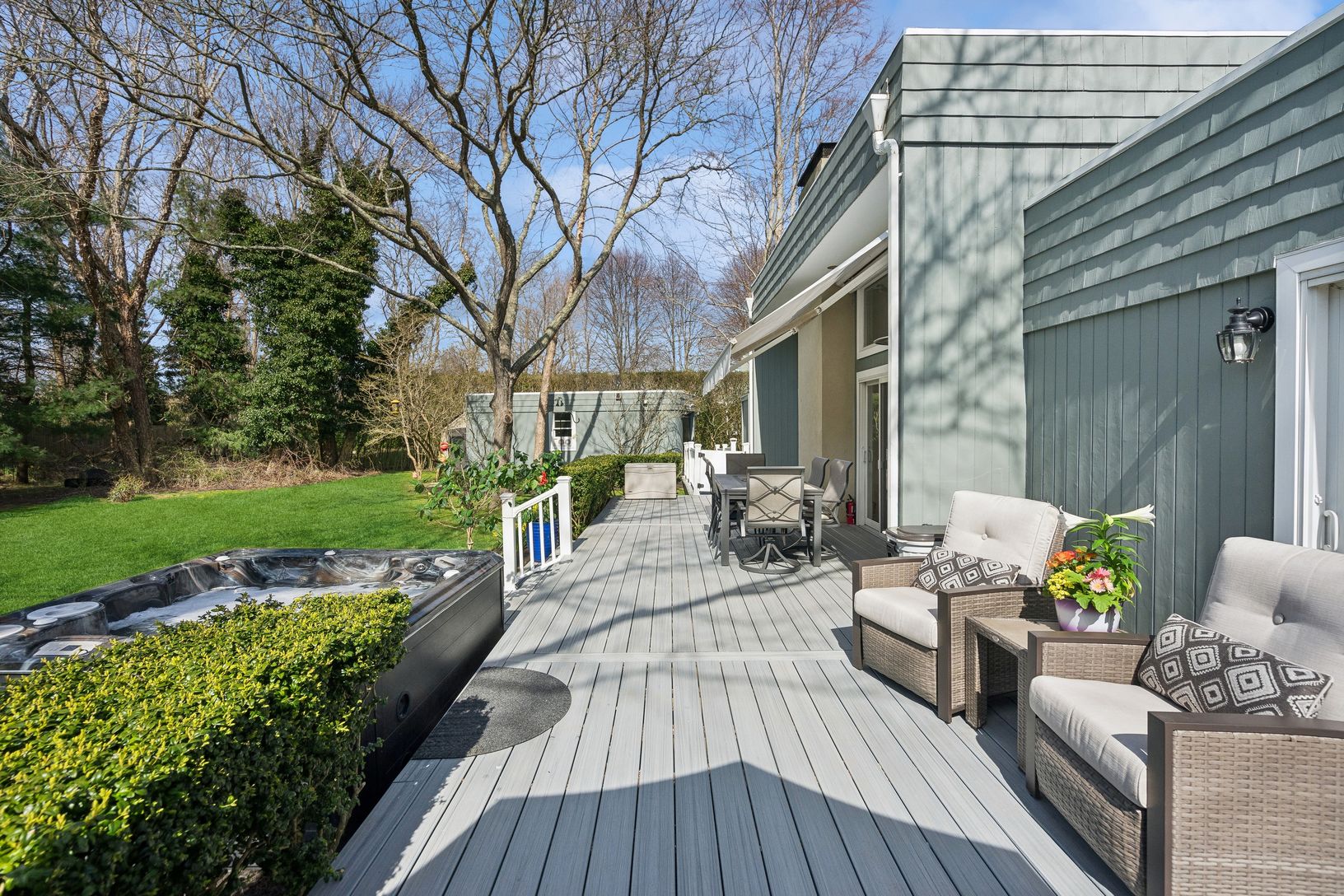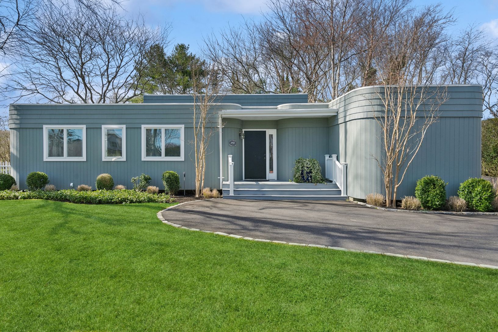 in Southampton Village and moments to all is this crisp clean and open one-level living post-modern home with three bedrooms and two baths and set on over a half acre facing west. As you enter the home there is a double-height living room with a fireplace, TV, and walls of sliders that lead to the outside, an eat-in kitchen that opens to the outside deck area, and two generous-sized bedrooms