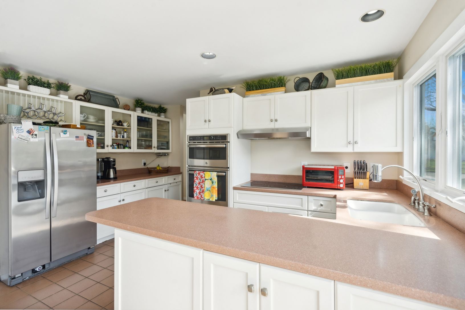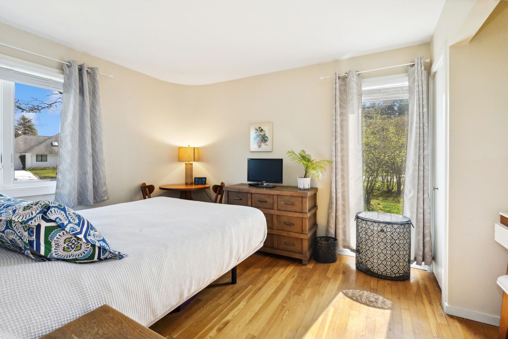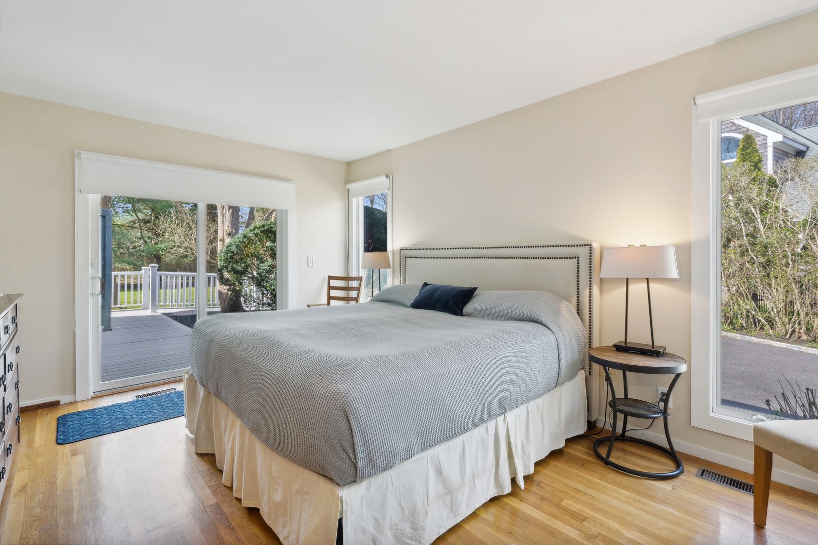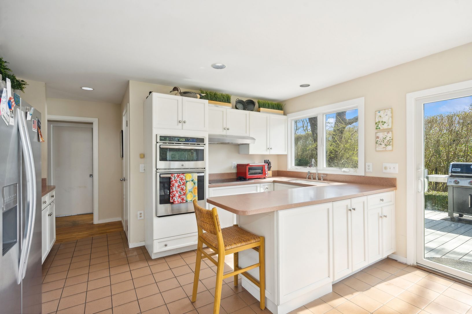 in Southampton Village and moments to all is this crisp clean and open one-level living post-modern home with three bedrooms and two baths and set on over a half acre facing west. As you enter the home there is a double-height living room with a fireplace, TV, and walls of sliders that lead to the outside, an eat-in kitchen that opens to the outside deck area, and two generous-sized bedrooms