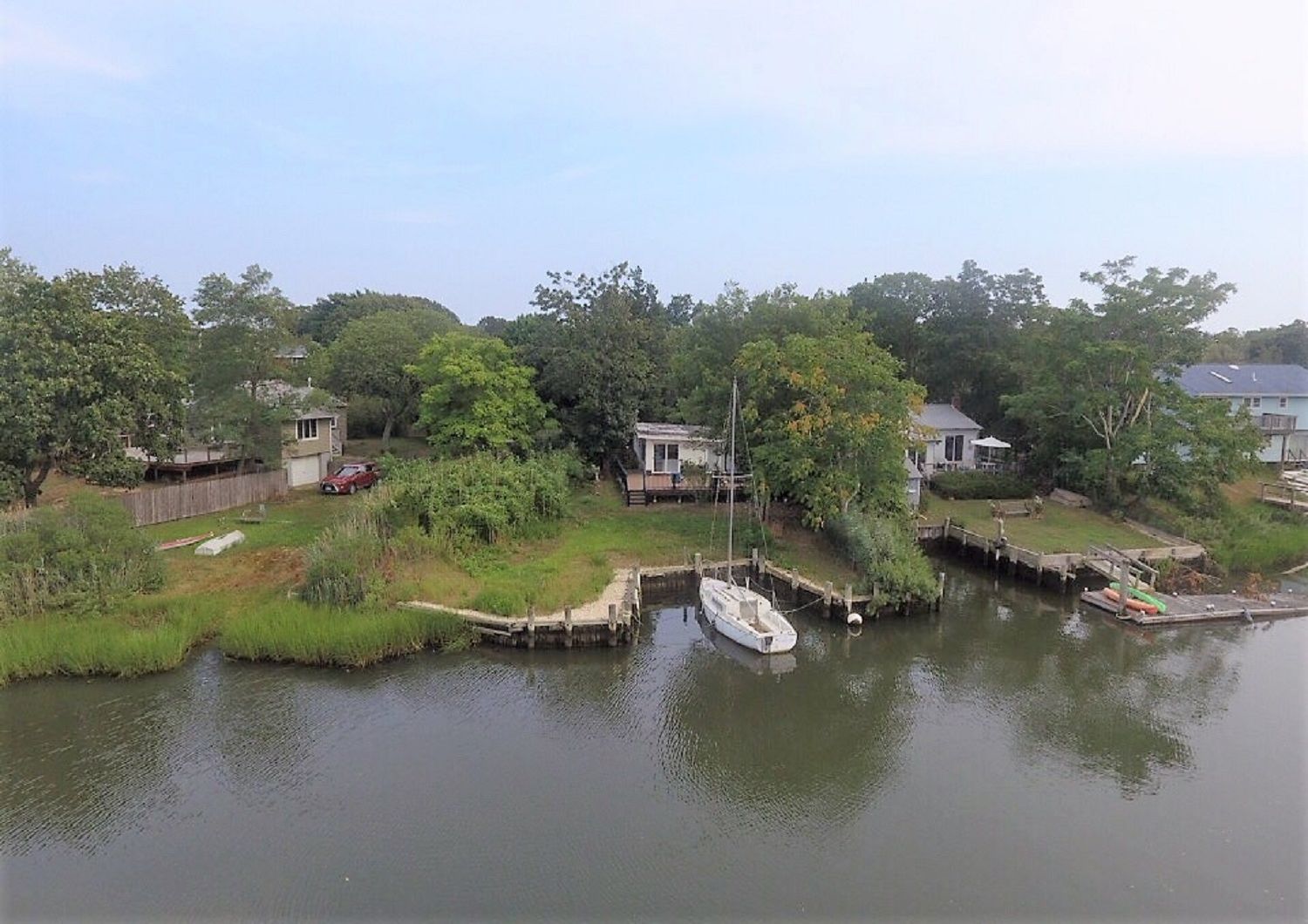 Sailor's delight or a fisherman's dream cottage on North Sea Creek with access to the Great Peconic Bay. There is 95 feet of bulkhead, a cottage of 2 bedrooms and a bath plus kitchen and living room total 850 sq ft with a new 689 sq ft deck. Possible expansion of a second level. There is an outdoor shower and new deck to enjoy the outdoors.