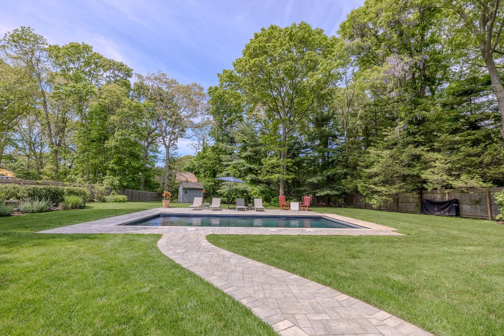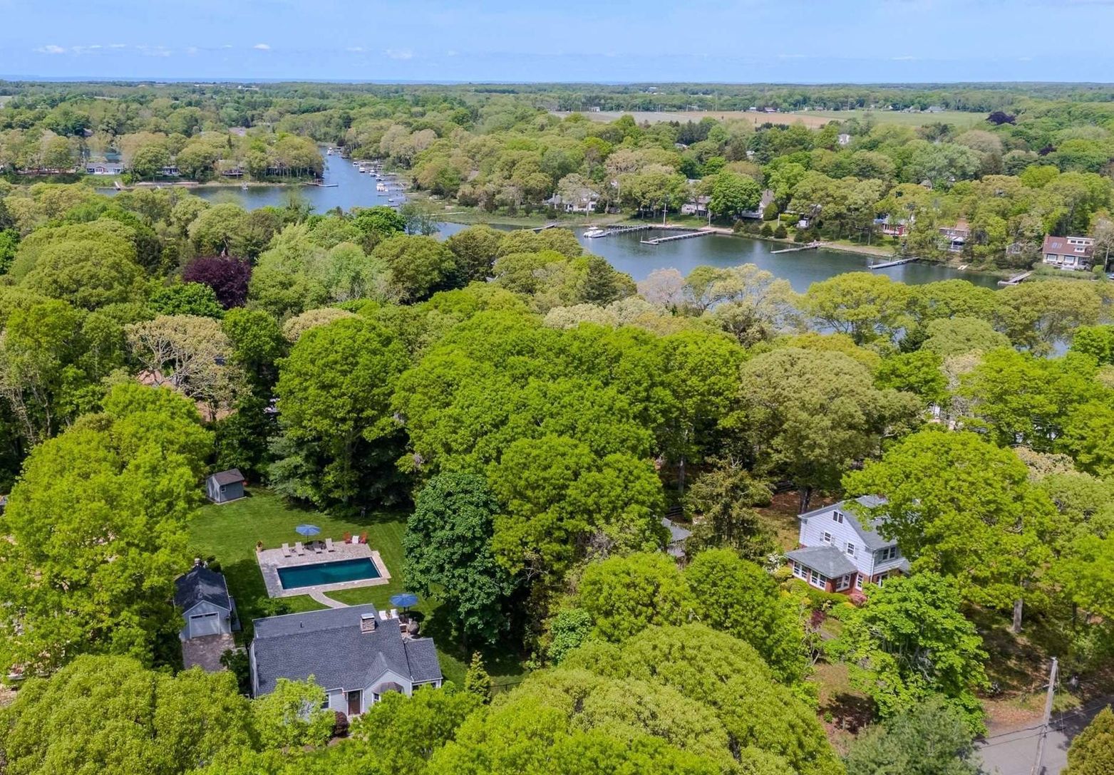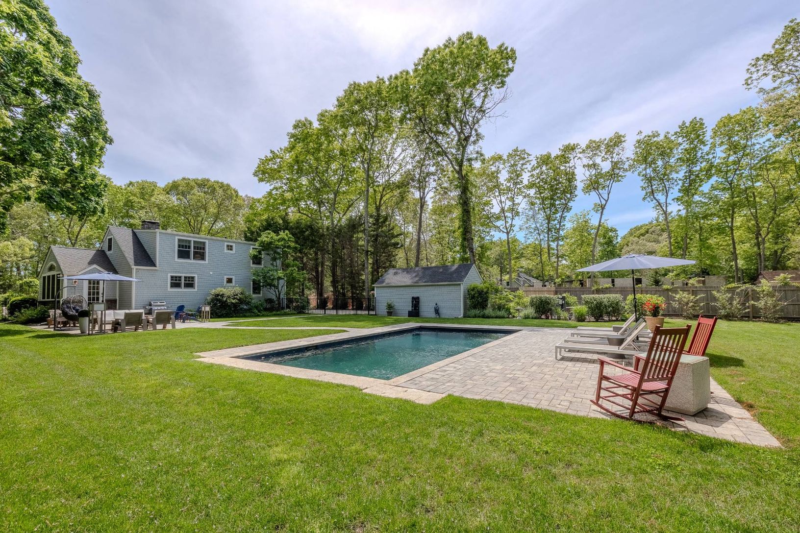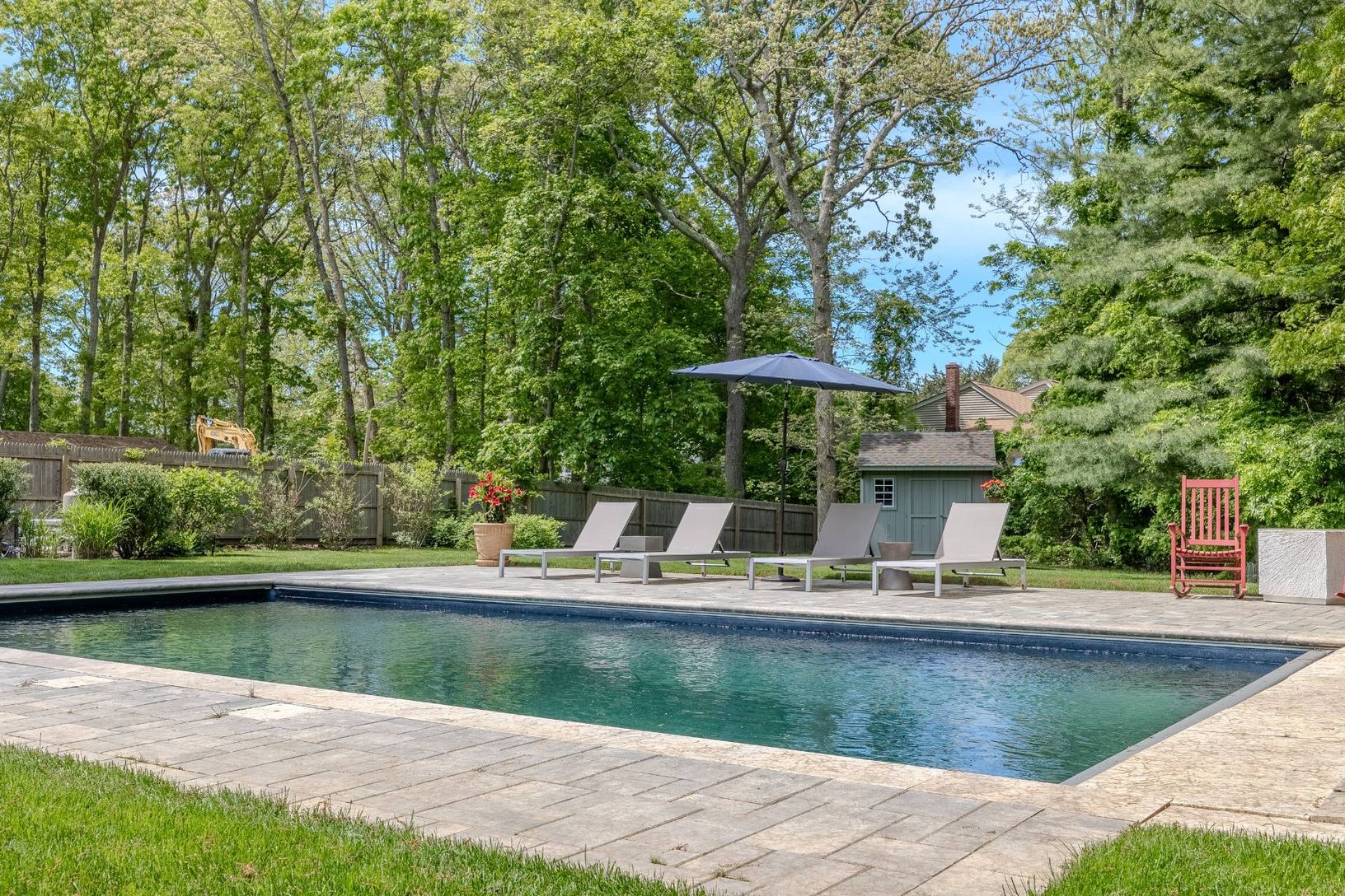 Mattituck, North Fork: Embrace the epitome of classic New England living with this stunning Cape by the Peconic Bay. Meticulously updated for today's lifestyle, this residence offers a lavish 16x32 heated, inground swimming pool and is adorned with designer touches throughout. Revel in the sunroom's radiant heat flooring, the grandeur of the real wood-burning fireplace in the large living room, and the culinary delights that await in the chef'