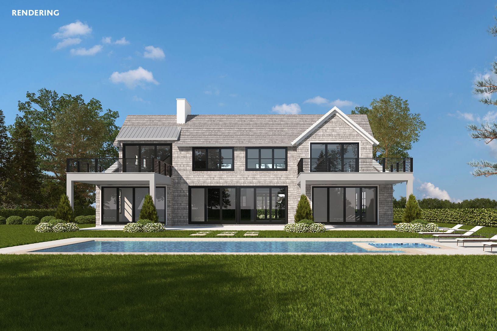 New construction modern farmhouse by Farrell Building Company on Halsey Lane in Bridgehampton is due for completion in 2020. Situated on .9+/- acre south of the highway with big open skies, the home offers 7,618+/- sq. ft. of living space, with seven bedrooms and 7.5 baths. Open living areas flow among a soaring great room, living room, formal dining room and eat-in kitchen with breakfast area, marble countertops, high end stainless steel appl