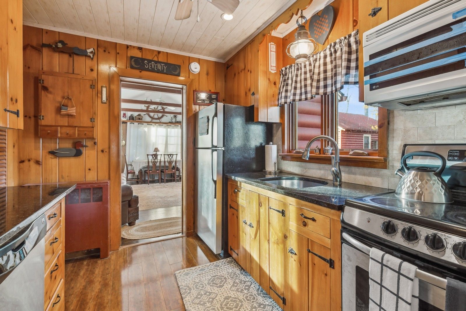 Nestled on half an acre of lush surroundings, this fully furnished cabin features three bedrooms and one bathroom, ideal for year-round living or weekend getaways. The spacious den adorned with warm, natura