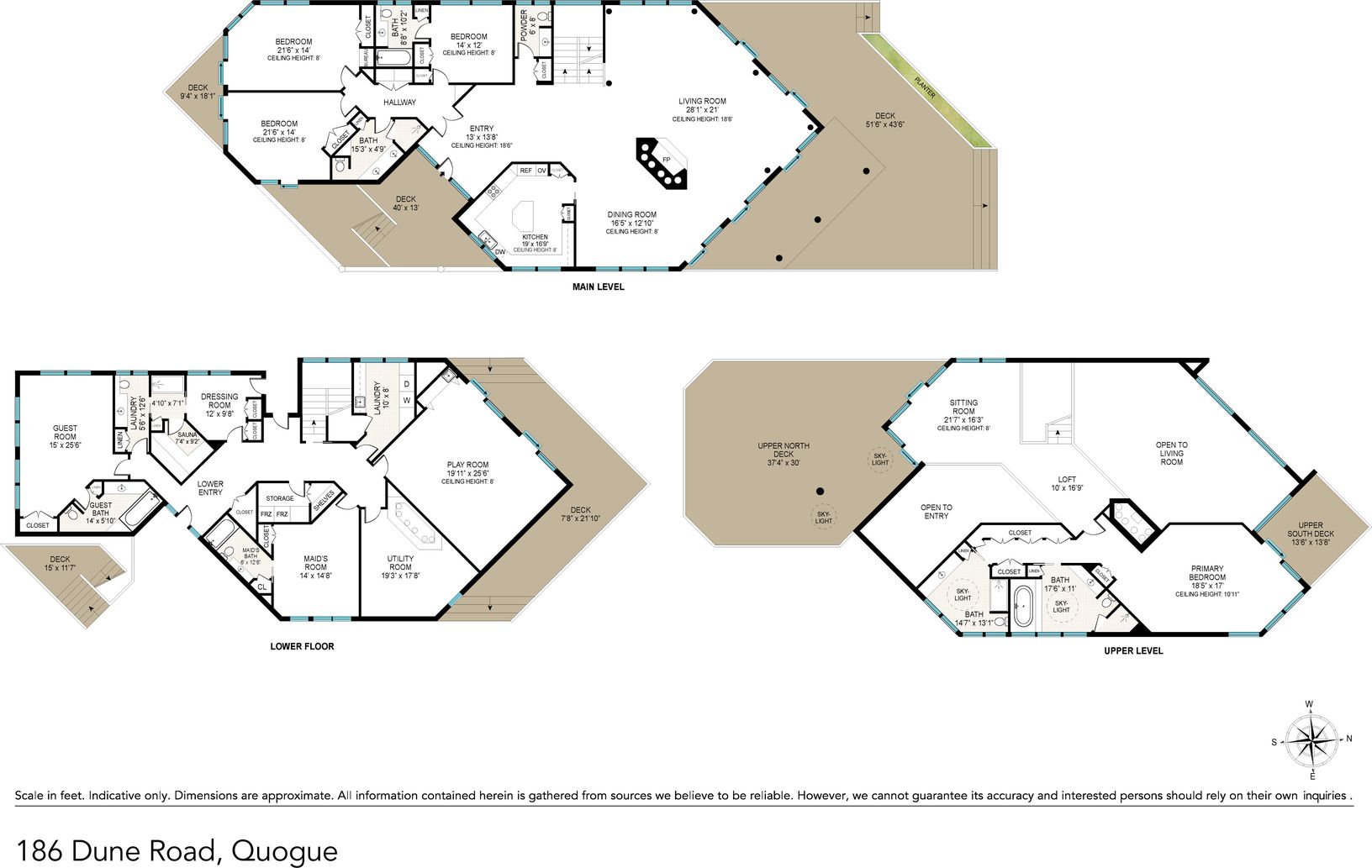 Ocean and Bay views abound at this 5.61+/- acre waterfront property. 186 Dune is the oceanfront home on 1.41+/- acres, and 189 Dune is 4.2+/- acres of bayfront land. The contemporary oceanfront is comprised of 3 floors all above ground level with 10' ceilings or higher throughout. The home features 8 guest bedrooms, 9 full and 1 half bathrooms, and over 10,000+/- sq. ft. The floor plan lends well to today's "open concept living." The double he