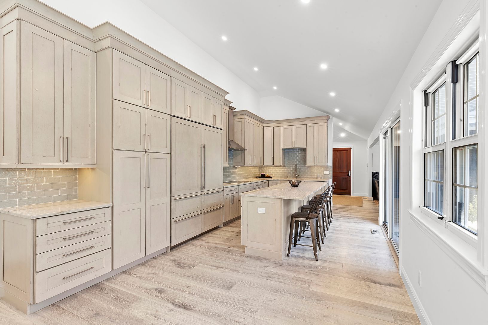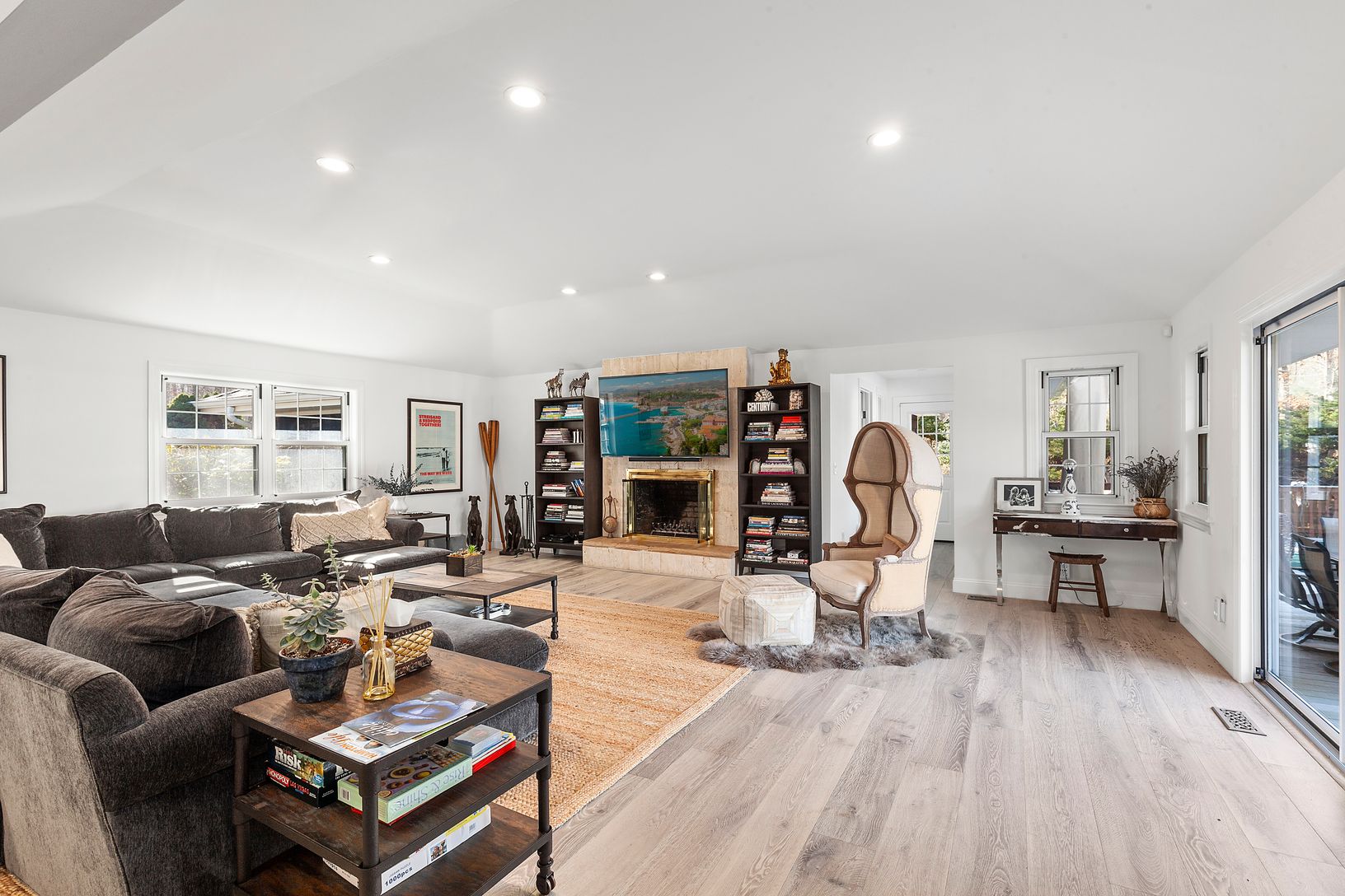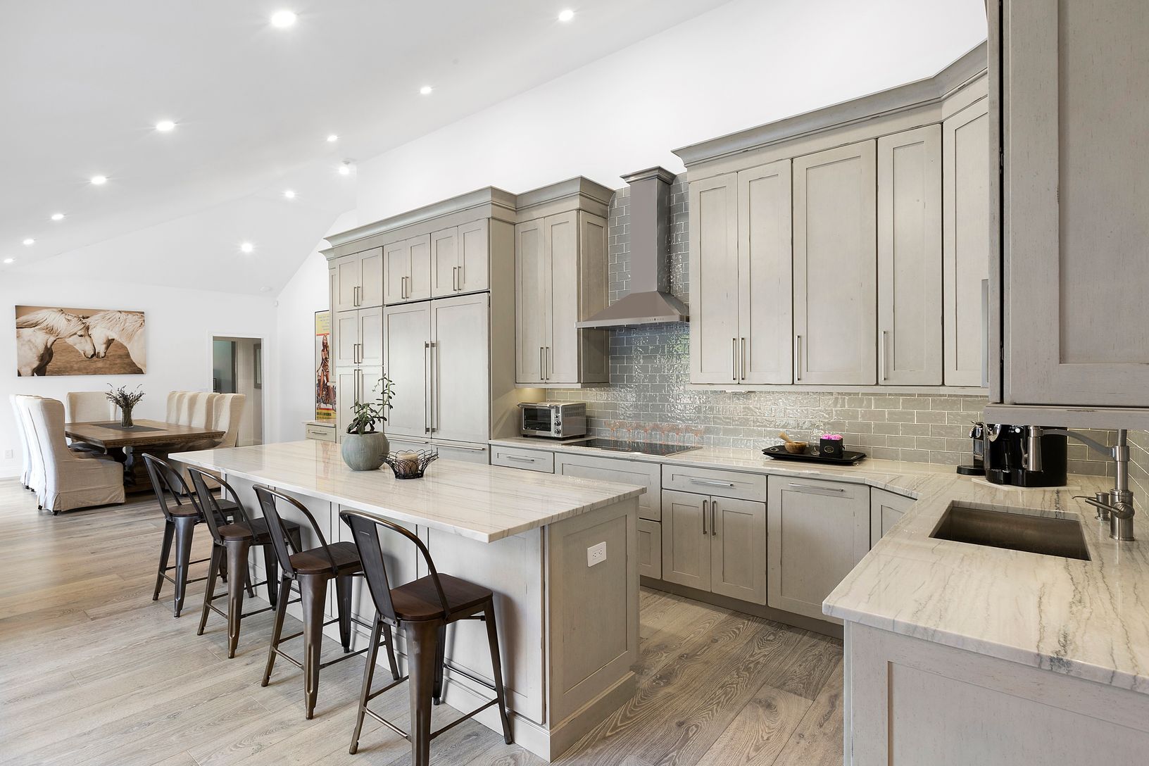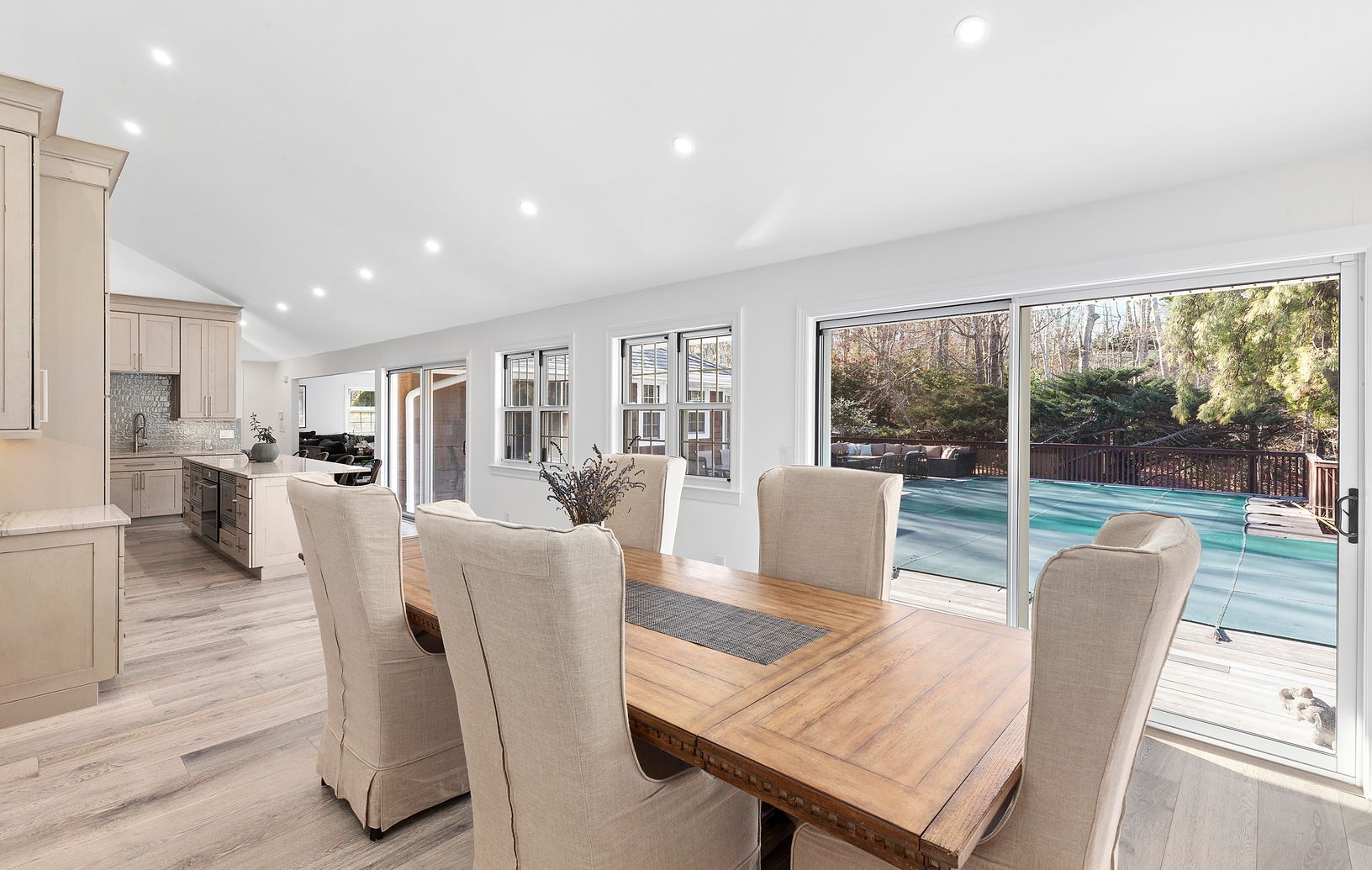 Tucked privately behind the elegant front gates sits this newly renovated in 2018 five bedroom, seven bath contemporary one story home on a secluded two +- acre setting. This home boasts an open living room with vaulted ceilings , open dining and gourmet chefs kitchen all with sliding glass doors leading to the large area of decking. The main floor master en-suite bedroom and three additional guest bedrooms, two en-suite with an additional be