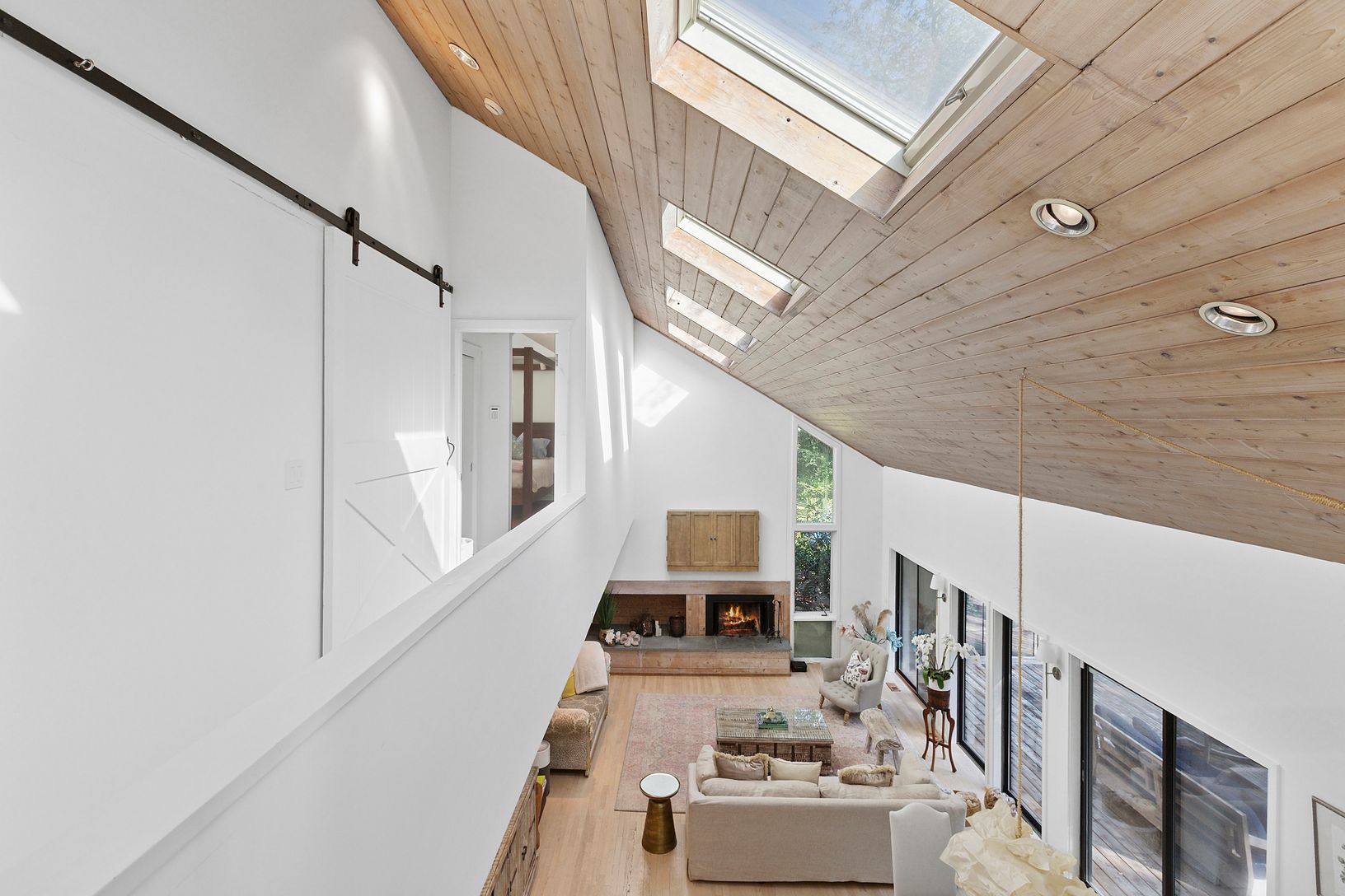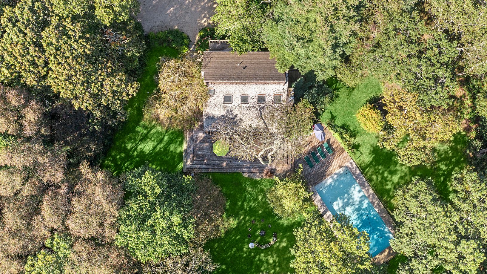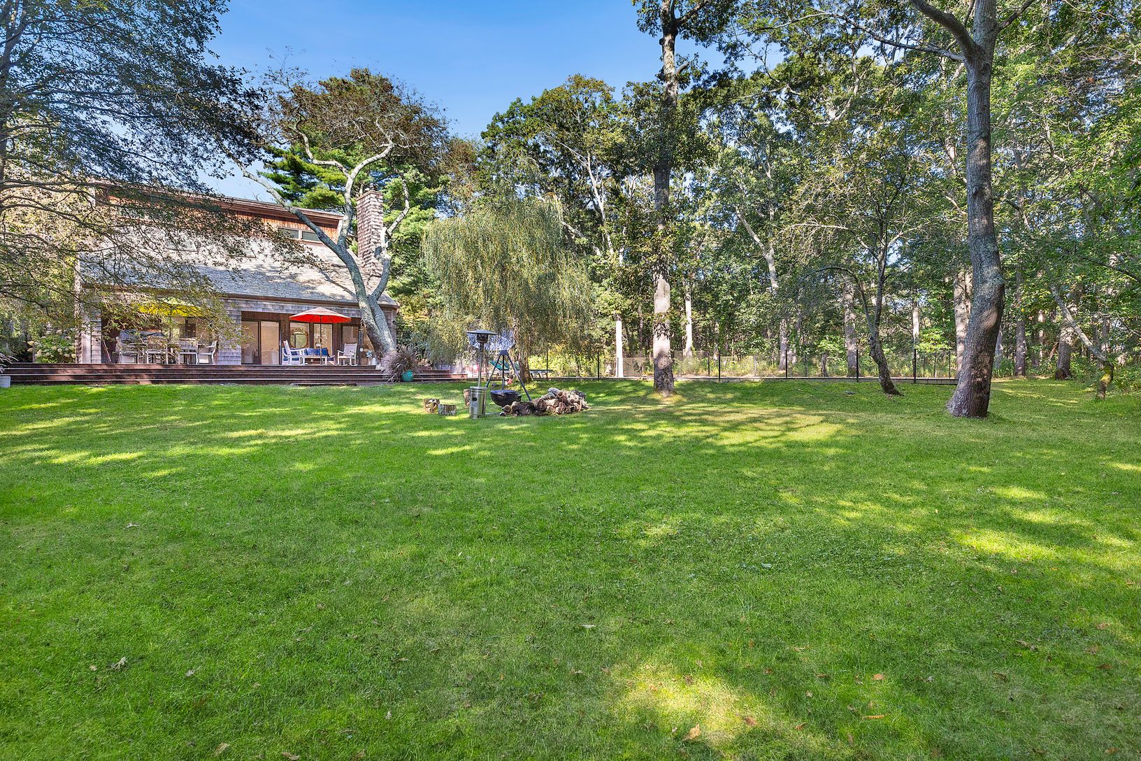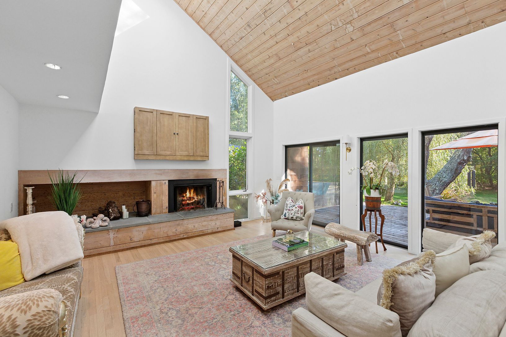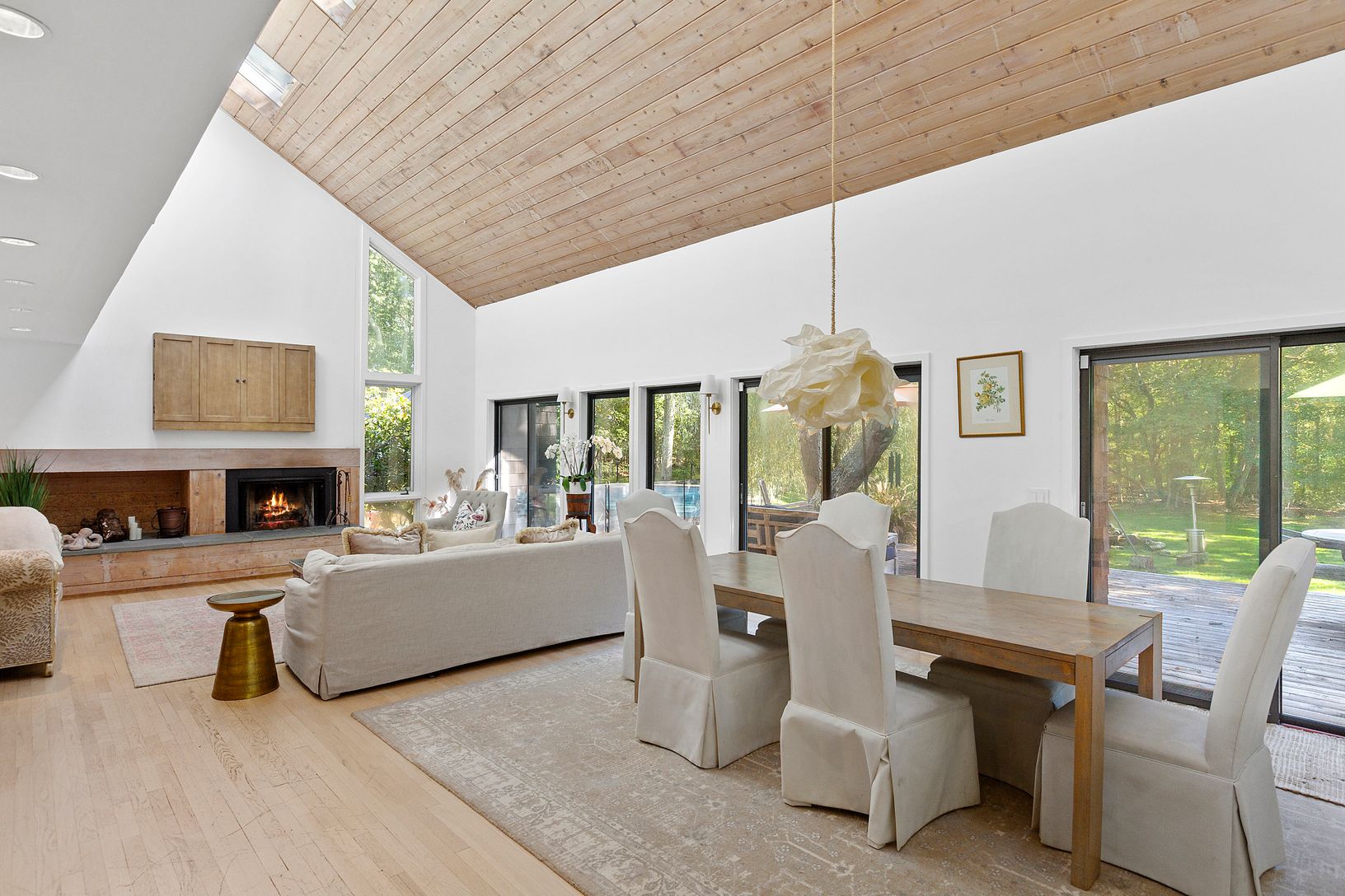 Conveniently located in the heart of Water Mill and set on 3.3 +/- acres of complete privacy, this 3-bedroom, 2-full bath, 2,290 +/- sqft. residence is filled with an abundance of natural light and located just a short distance to Southampton Village, Bridgehampton Village, and Ocean Beaches. As you enter the main level, the expansive open concept boasts a living and dining area with a fireplace, walls of sliding glass doors enhancing the home