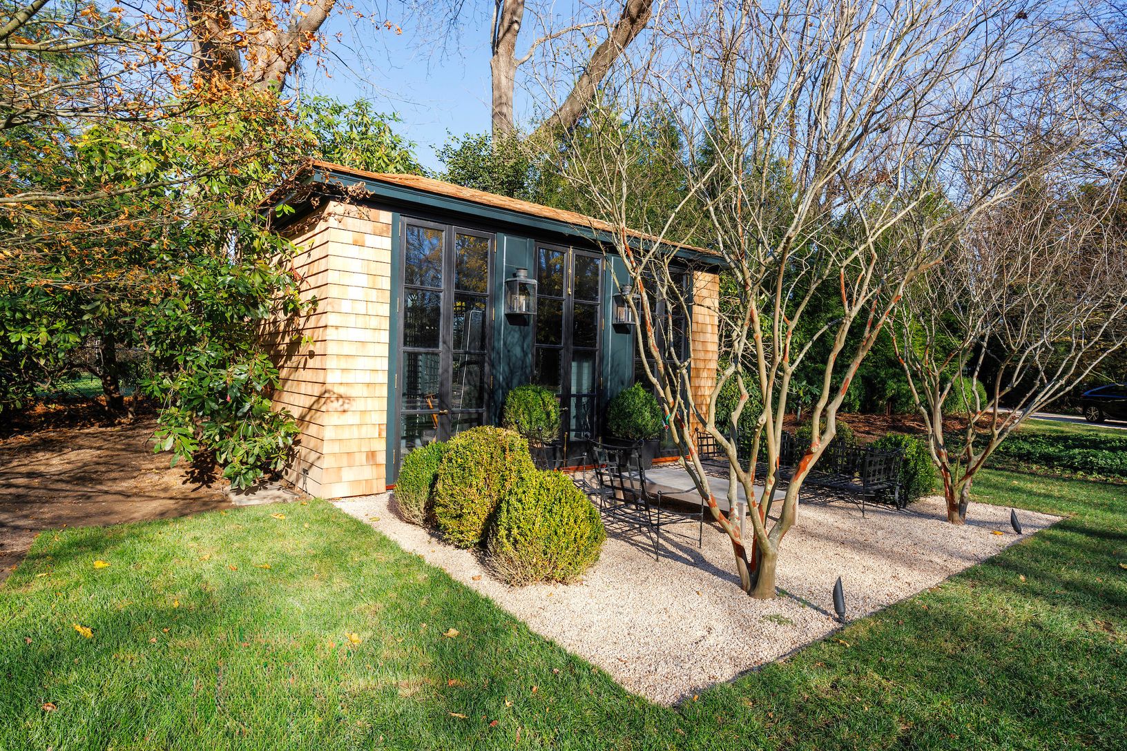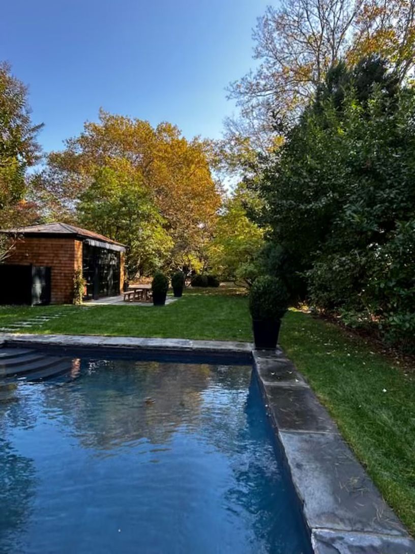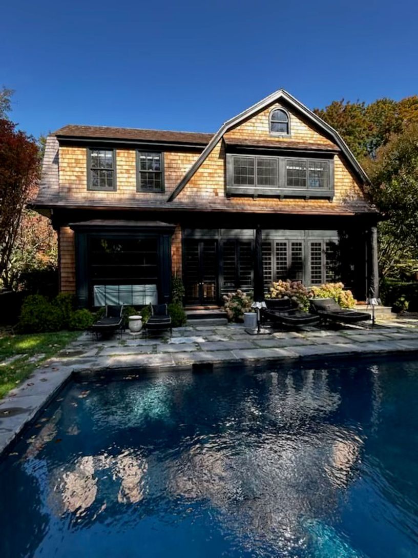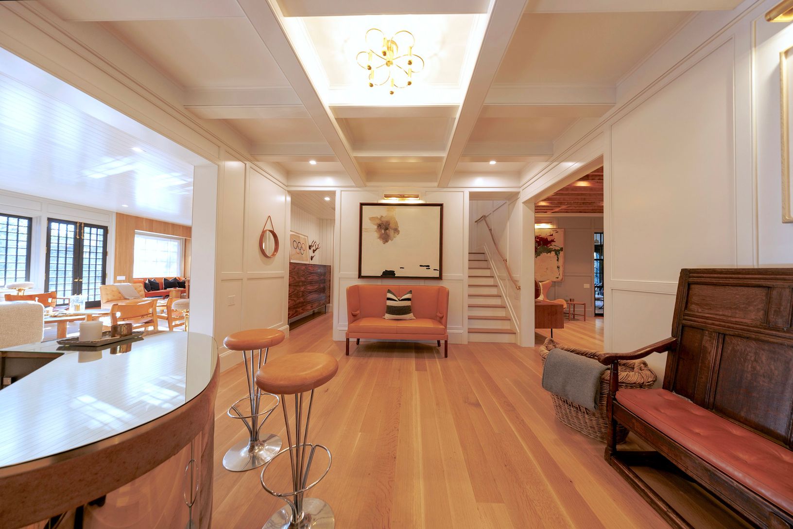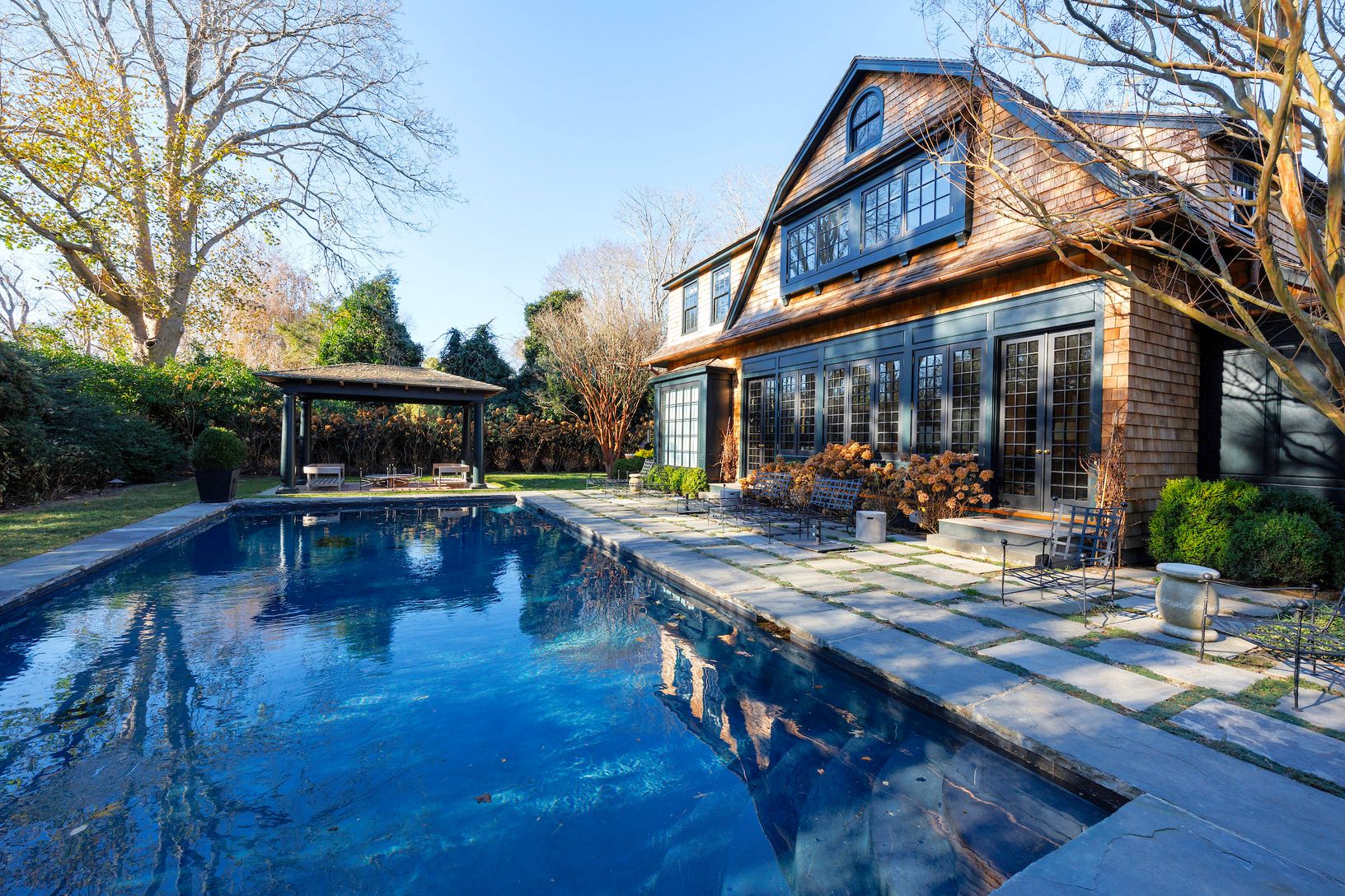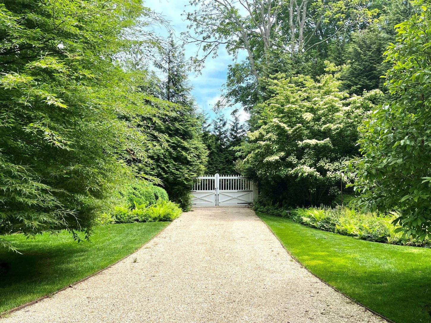 Newly rebuilt 1894 Carriage House hidden on an ultra-private 1.4 gated acre of gardens in prime East Hampton Village South estate location minutes to Ocean and Main Street. Chic stylish designer furnished featuring dramatic 25 ft x 25 ft beamed great room with 10 ft ceiling and fireplace, French doors to large sunporch, huge family room/dining/kitchen with custom cabinetry, marble counters, and wall of windows overlooking large heated pool wit