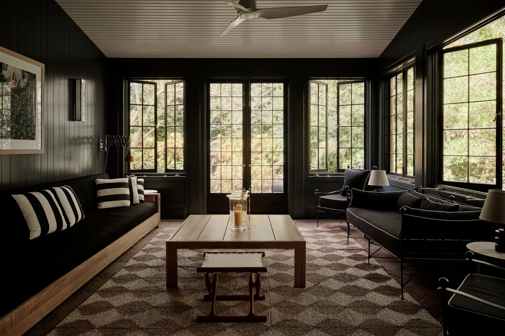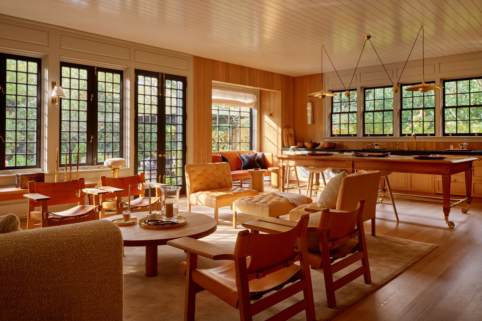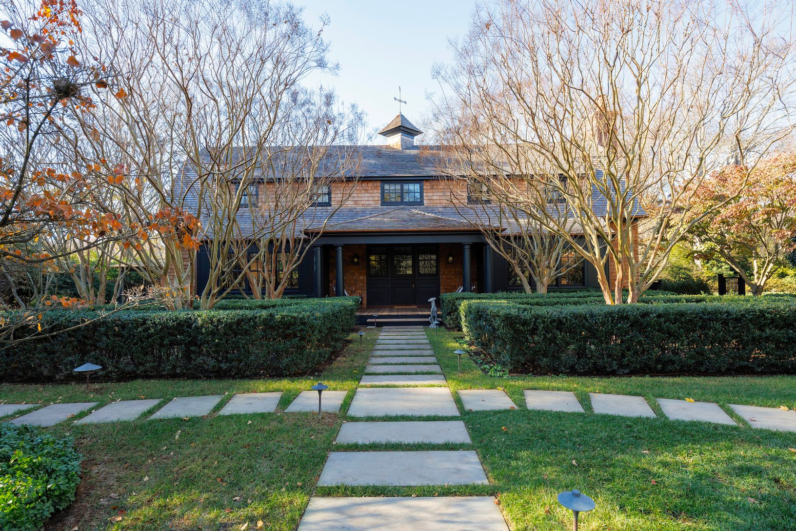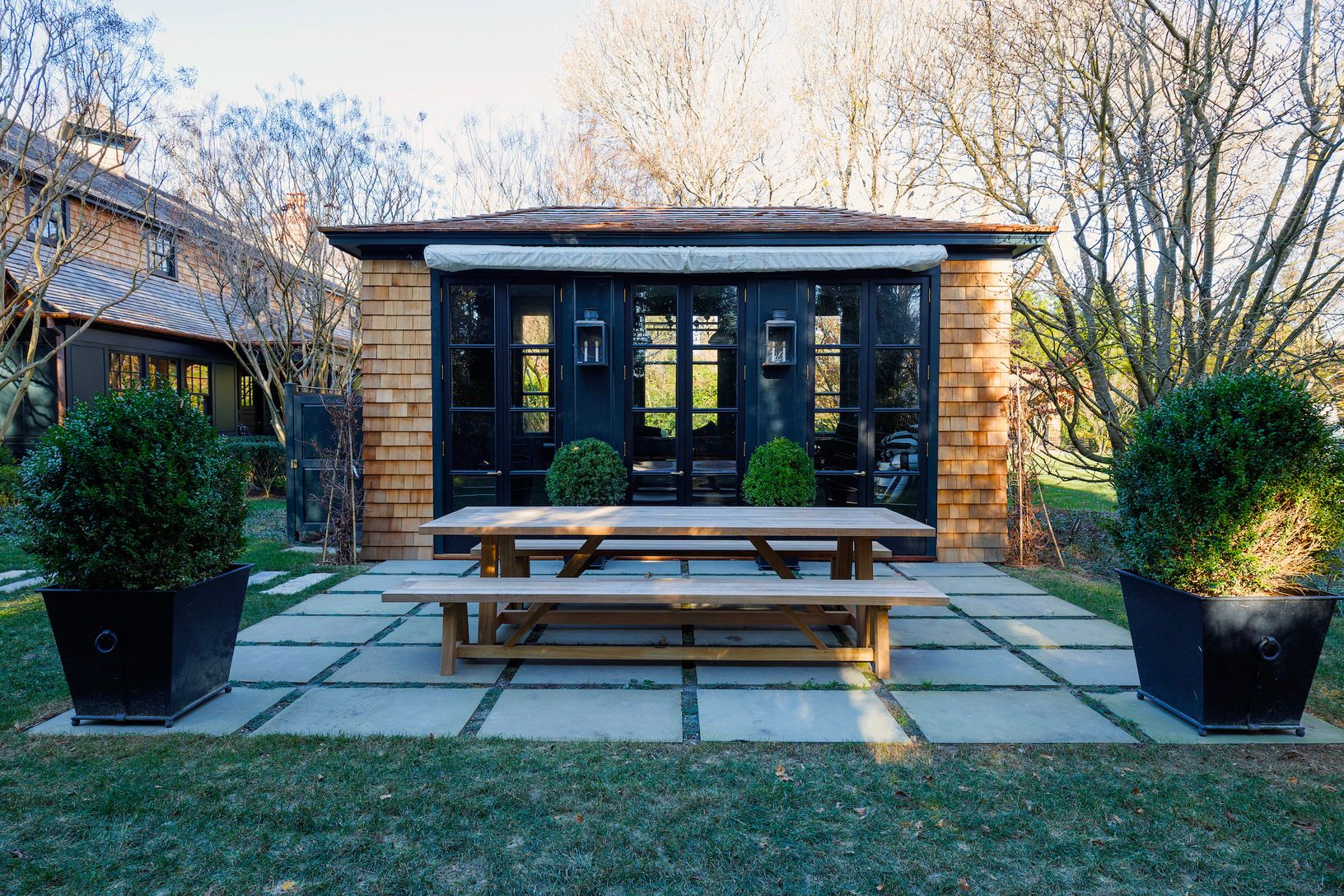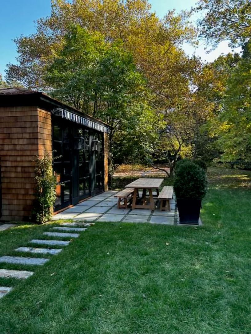 Newly rebuilt 1894 Carriage House hidden on an ultra-private 1.4 gated acre of gardens in prime East Hampton Village South estate location minutes to Ocean and Main Street. Chic stylish designer furnished featuring dramatic 25 ft x 25 ft beamed great room with 10 ft ceiling and fireplace, French doors to large sunporch, huge family room/dining/kitchen with custom cabinetry, marble counters, and wall of windows overlooking large heated pool wit