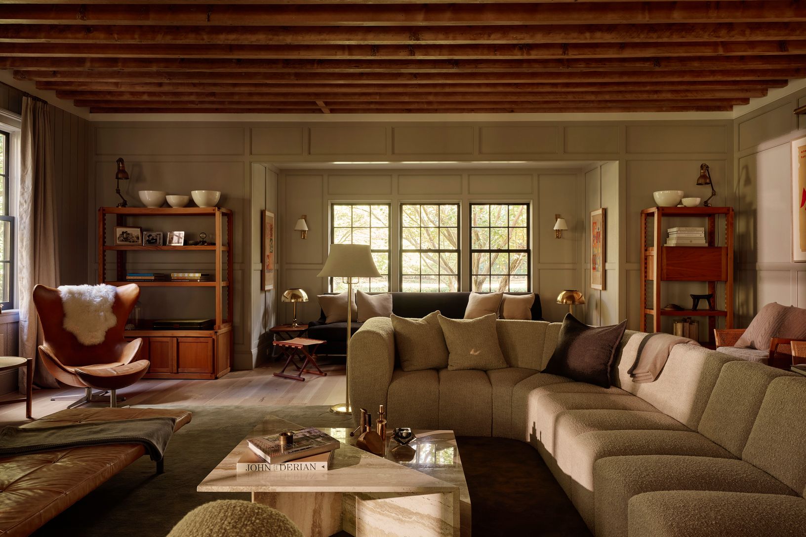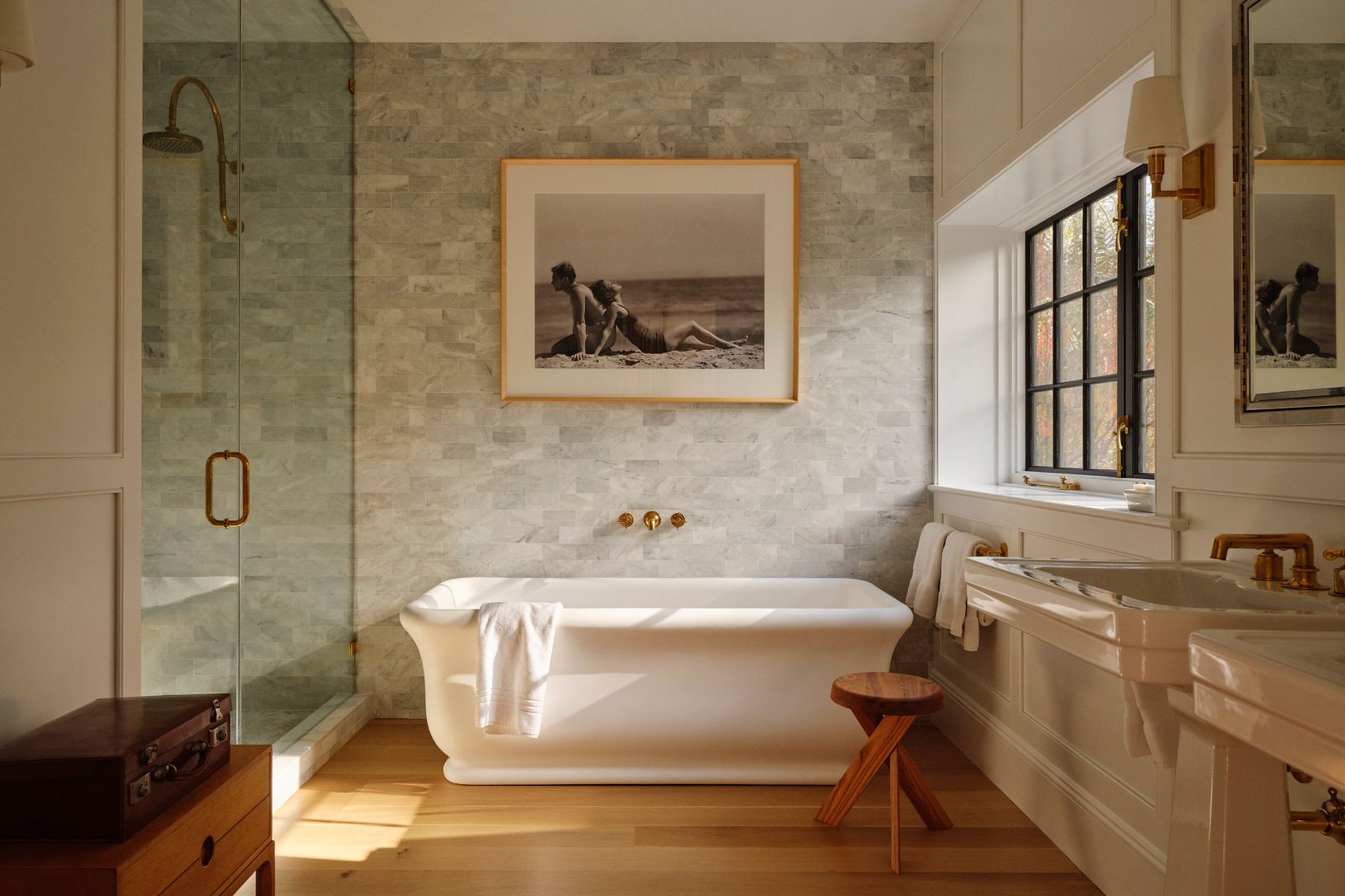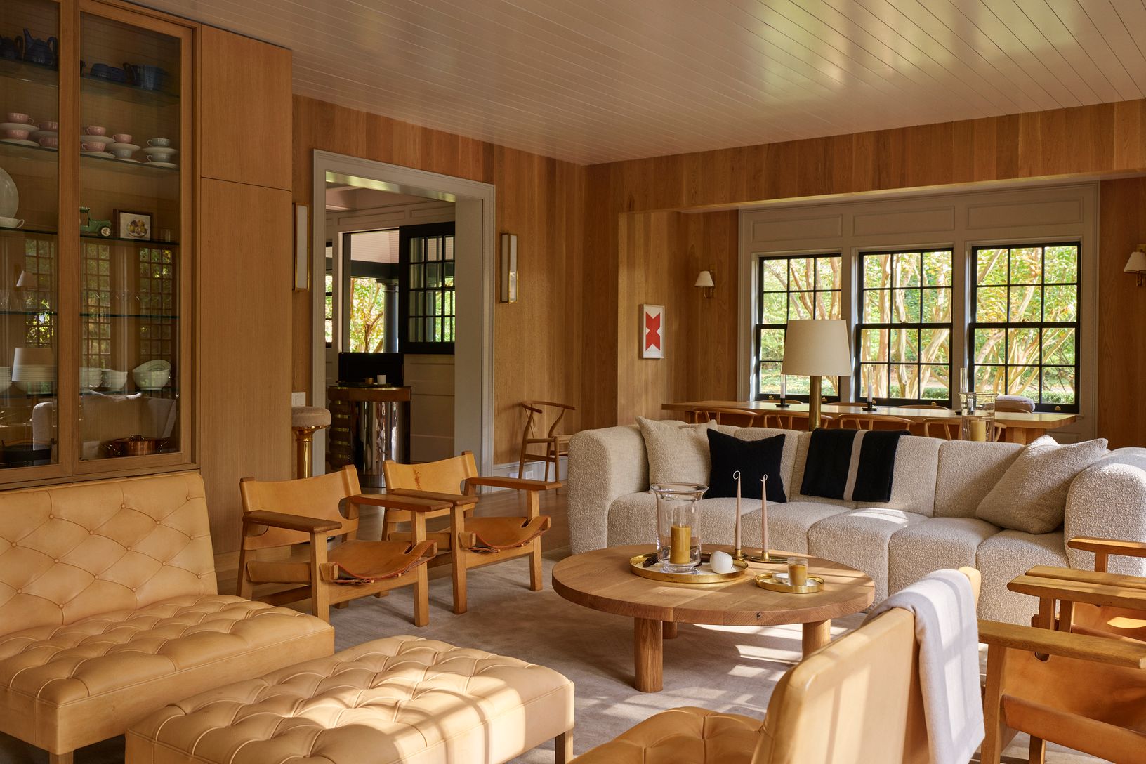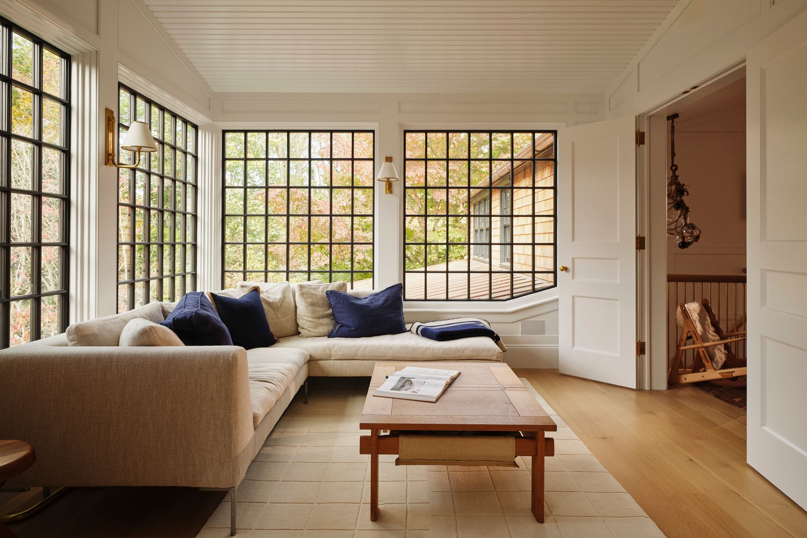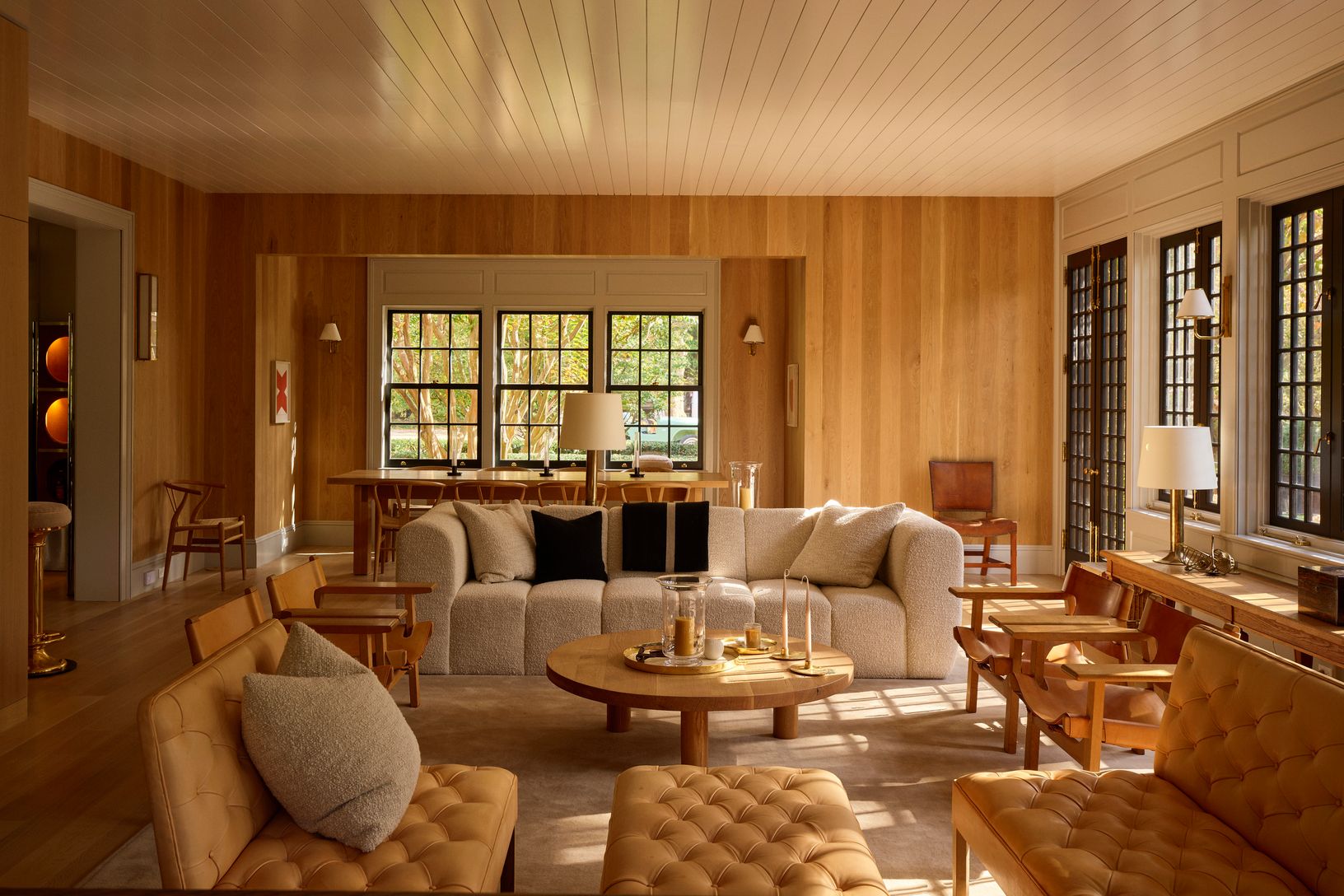 Newly rebuilt 1894 Carriage House hidden on an ultra-private 1.4 gated acre of gardens in prime East Hampton Village South estate location minutes to Ocean and Main Street. Chic stylish designer furnished featuring dramatic 25 ft x 25 ft beamed great room with 10 ft ceiling and fireplace, French doors to large sunporch, huge family room/dining/kitchen with custom cabinetry, marble counters, and wall of windows overlooking large heated pool wit