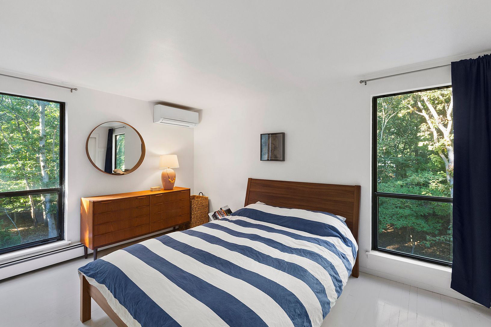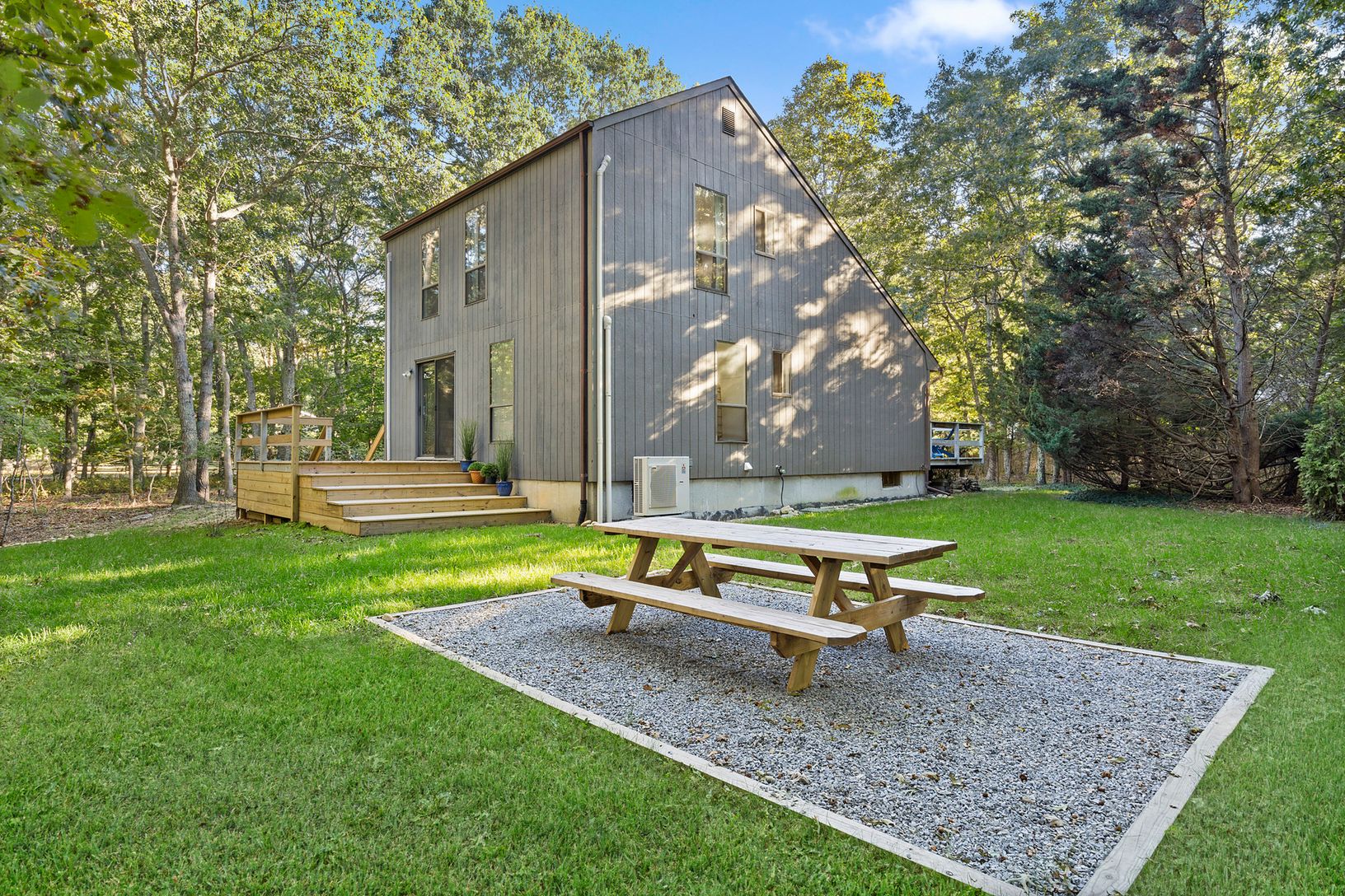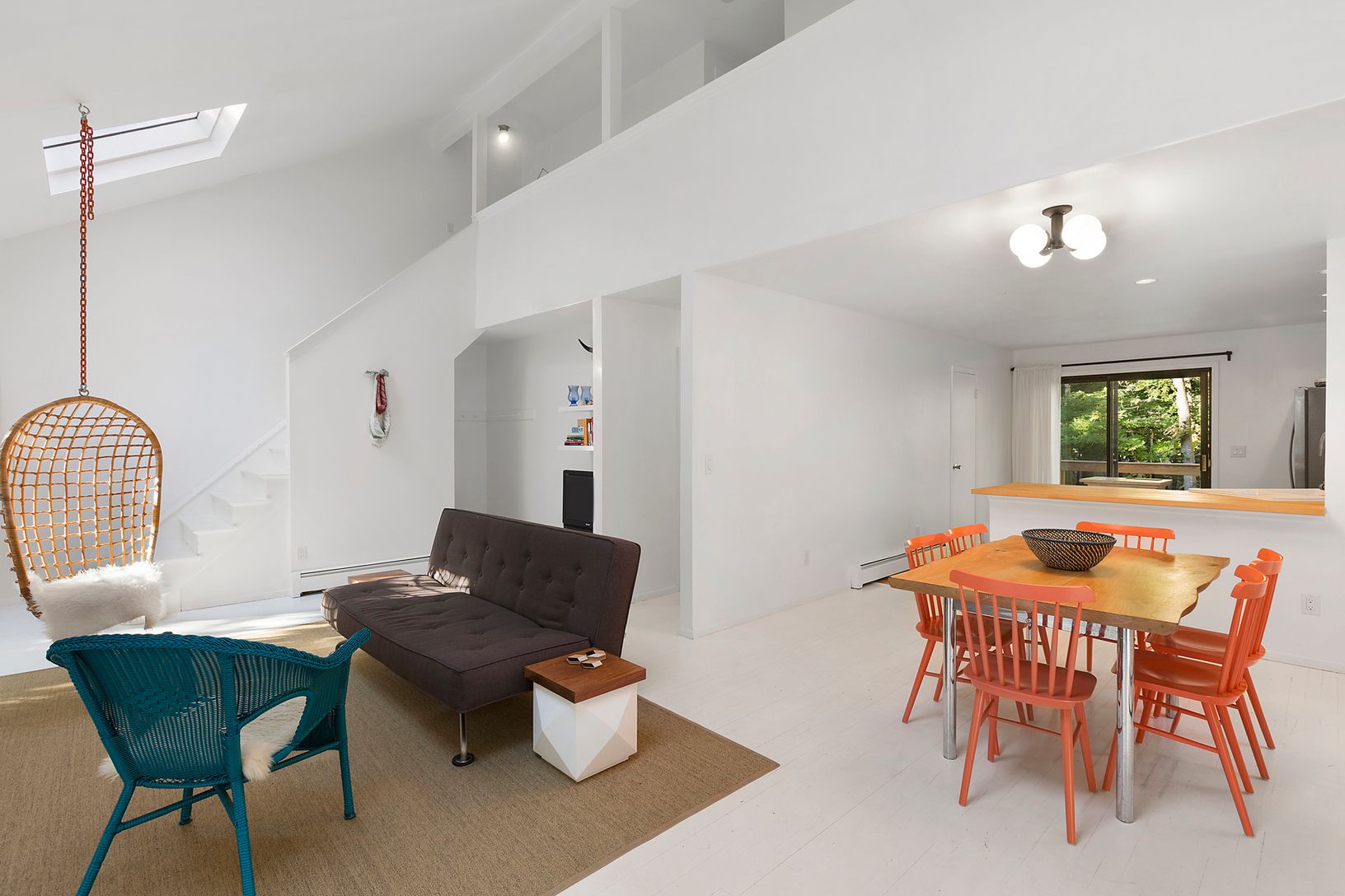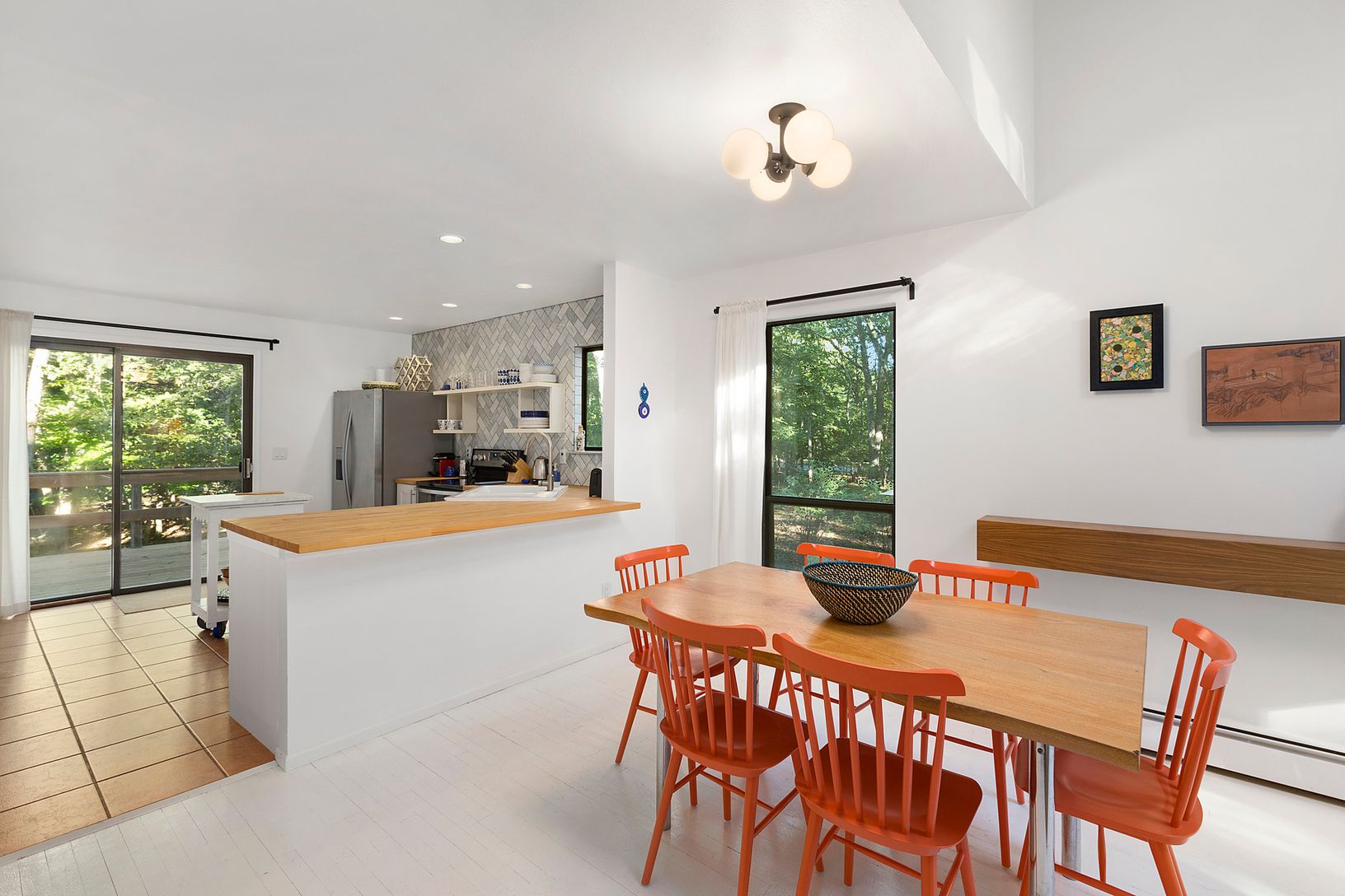 This well-maintained East Hampton Saltbox is situated on a private .62 acre property and offers 1600+ square feet of living space. Upon entering, you immediately are drawn to the soaring cathedral ceiling. A beautiful wood-burning fireplace along with massive windows allows for the perfect light-filled entertaining area. The first floor features one bedroom and a newly renovated bathroom, large dining area and inviting open kitchen. Two bedroo