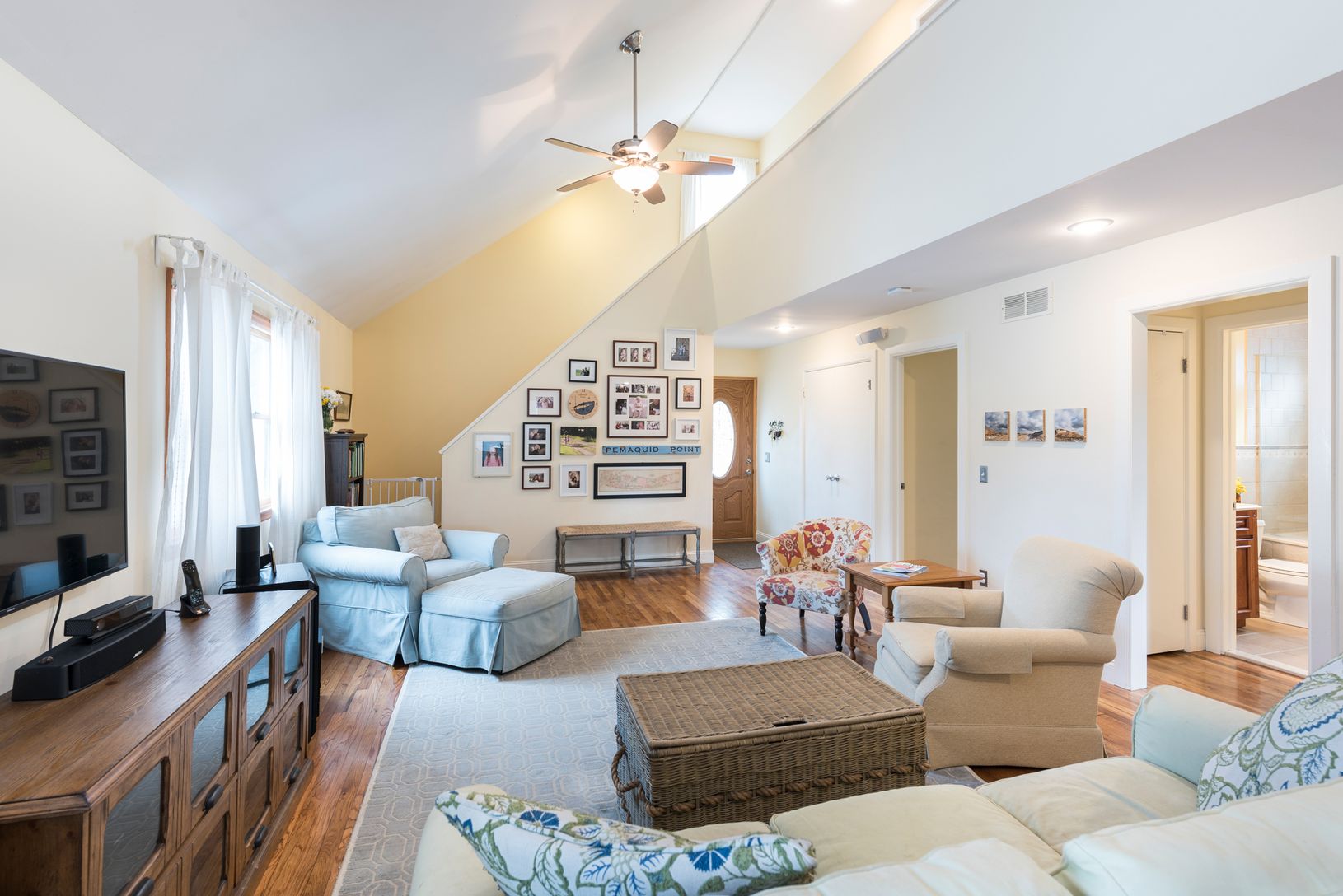 Come home to this four bedroom, two bath contemporary saltbox in the serene Southampton side of Eastport. Enter to a bright, open living and dining area where double-height ceilings make the space feel even larger. The spotless, renovated kitchen includes new appliances, quartz countertops and radiant heated flooring. Two bedrooms upstairs, along with a full bath, overlook the spacious living room, and two additional bedrooms and another full