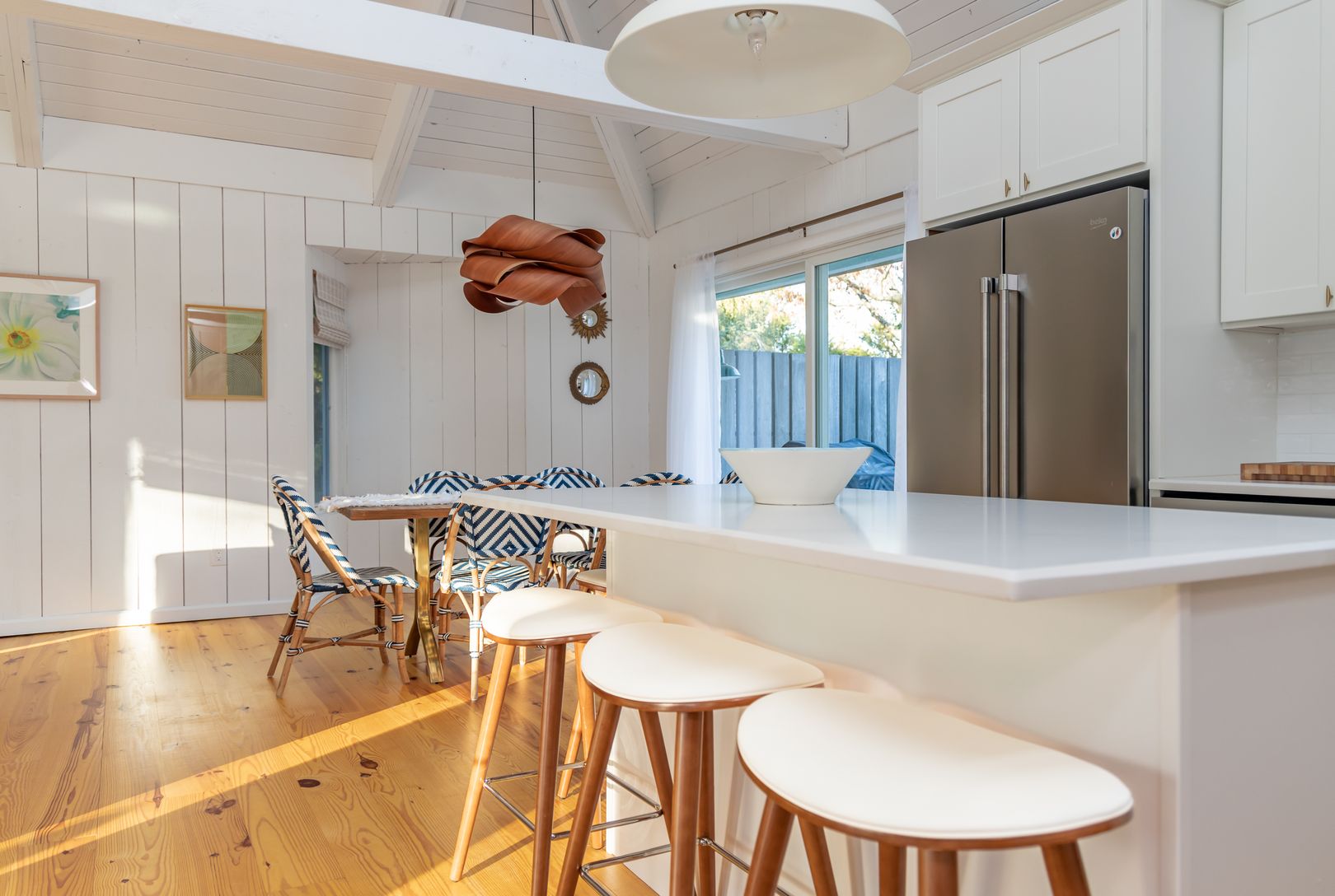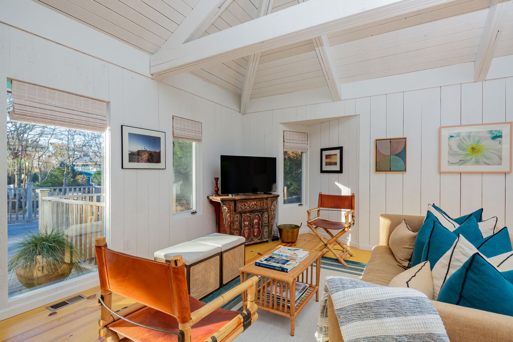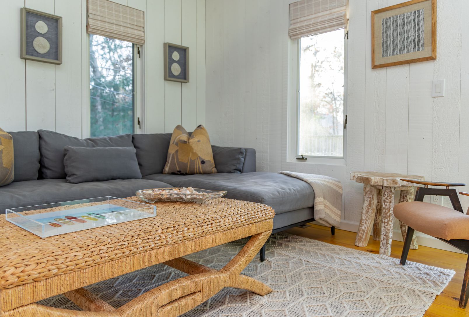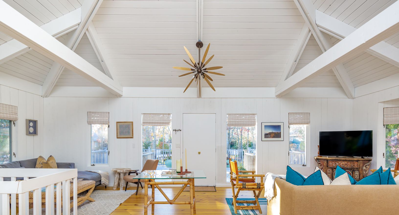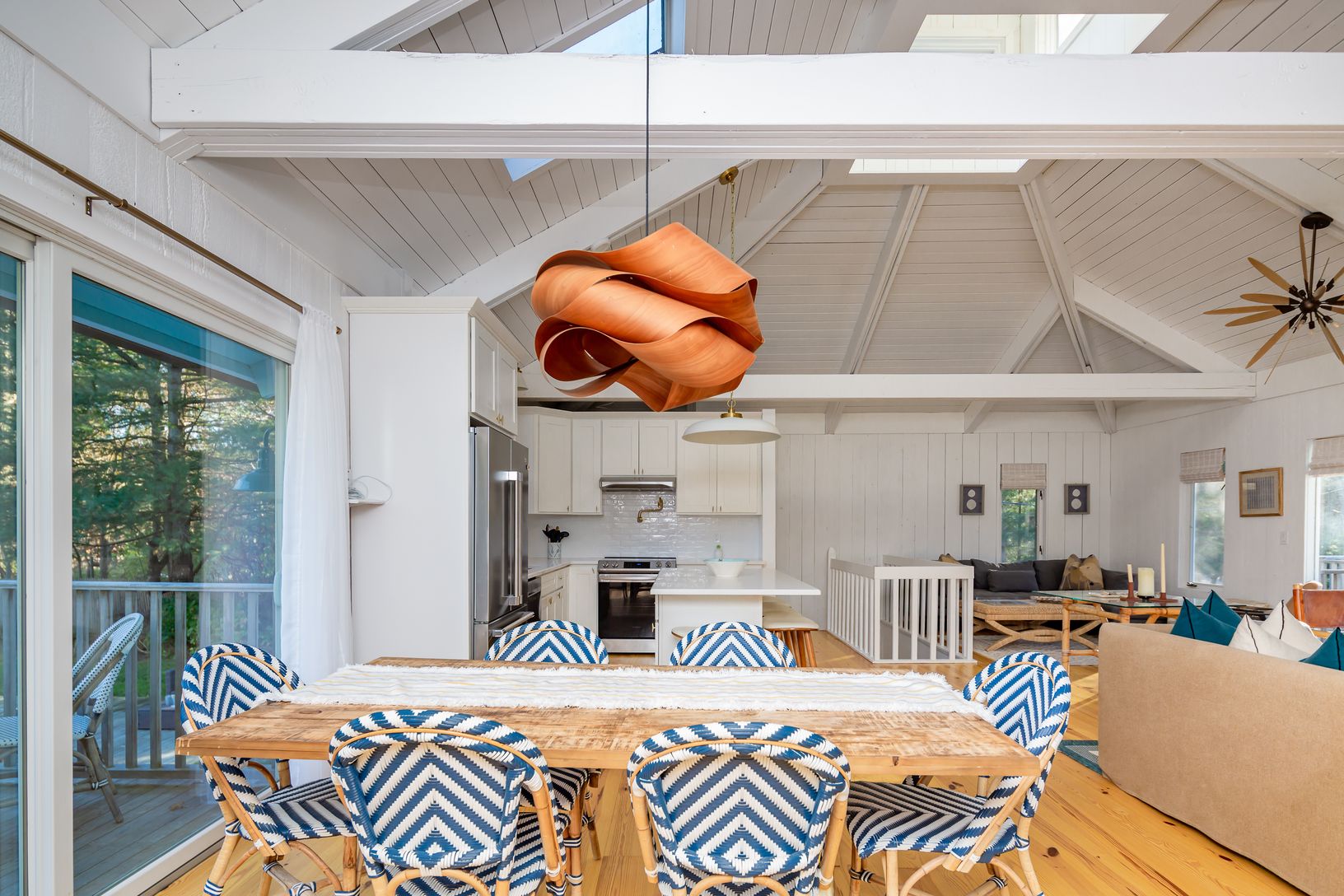 Chic, contemporary home steps to private Gardiner's Bay beach. Nestled in the coveted community of Lion Head Beach lies this recently renovated home exuding sophistication and charm. Thoughtfully imagined and impeccably designed, it features an open layout flooded with the illuminating, dreamy light of Springs. Soaring, open beamed ceilings reach to a windowed cupola and wide plank flooring rendering an artistic element throughout. The kitchen