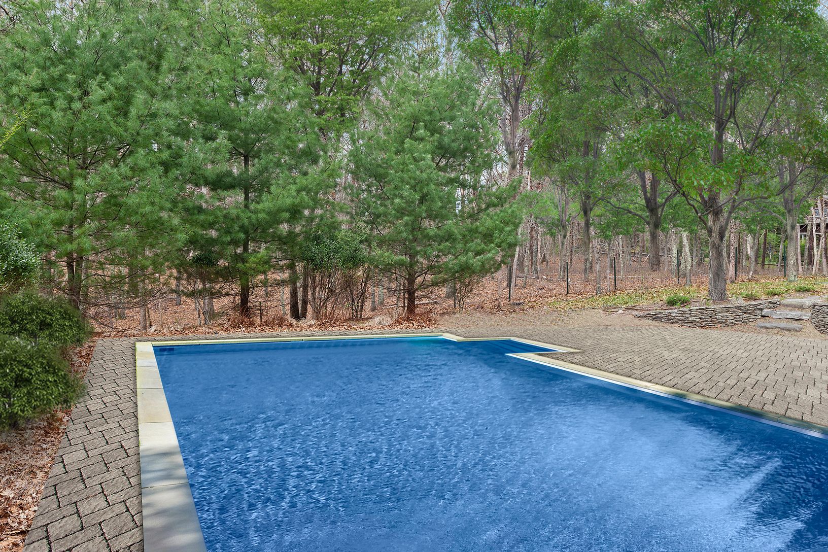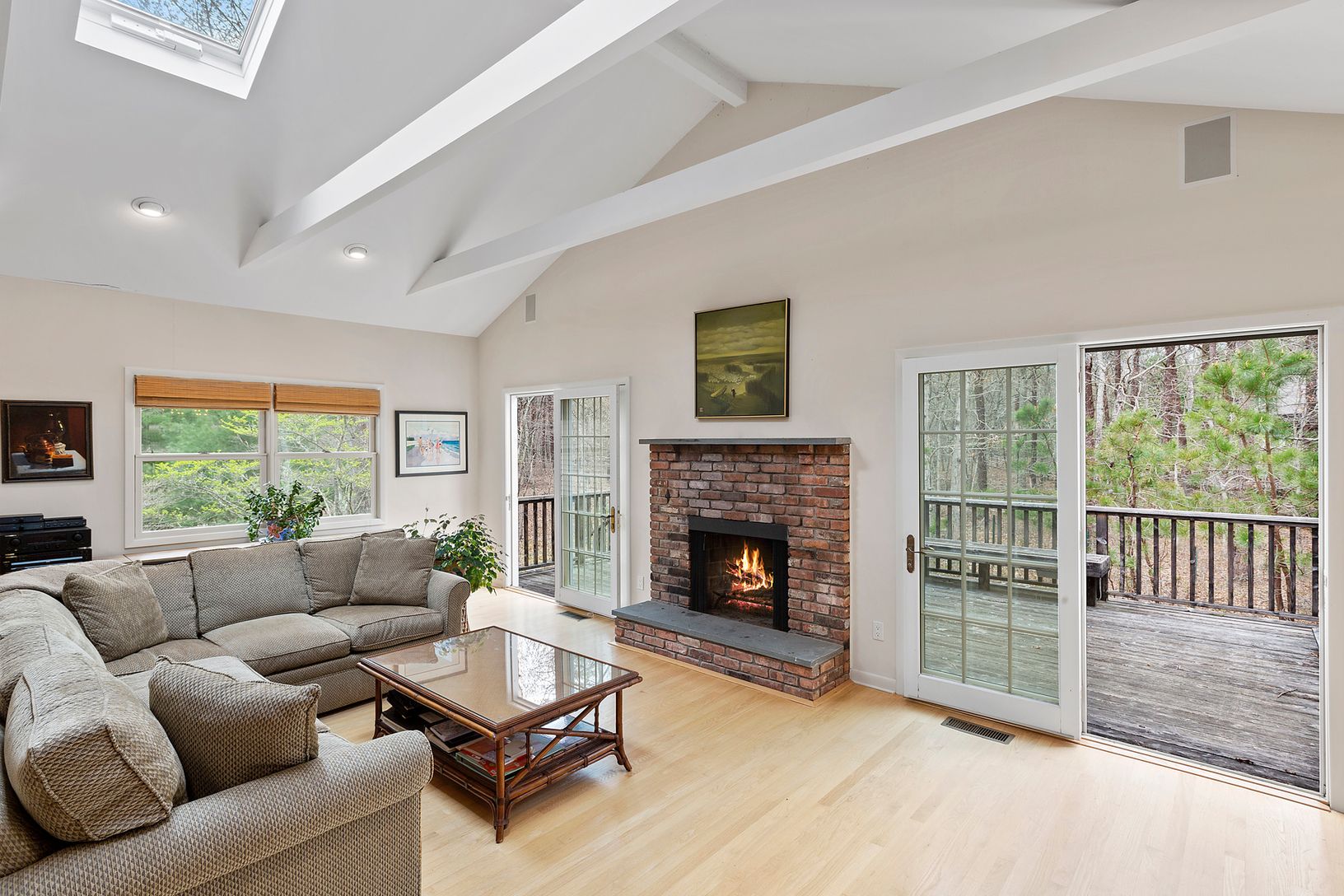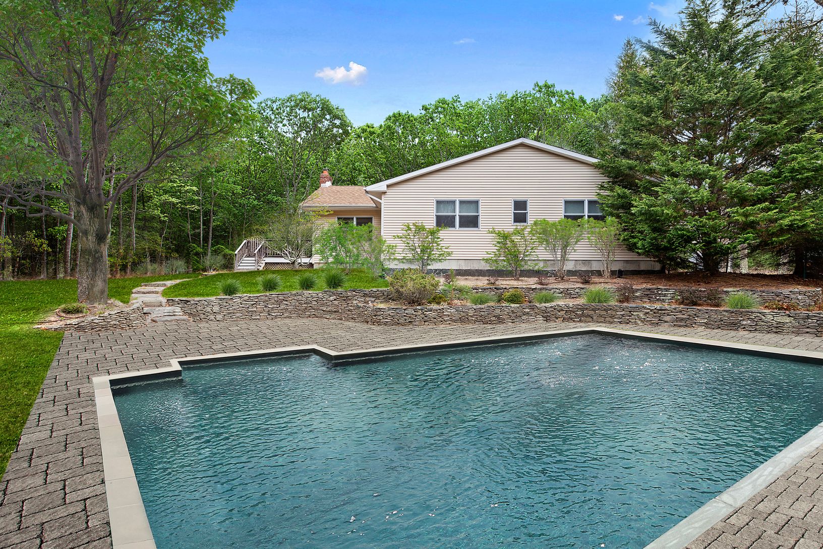 This open layout contemporary is centrally located in East Hampton and is situated at the end of a quiet cul-de-sac. With lofted ceilings, an open floor plan and a large fireplace the bright open feeling is also quaint and cozy. The backyard offers plenty of decking, and patio around the pool area. The interior has an eat-in kitchen, dining area, and mudroom area leading out to the backyard. Four nicely proportioned bedrooms with two and half