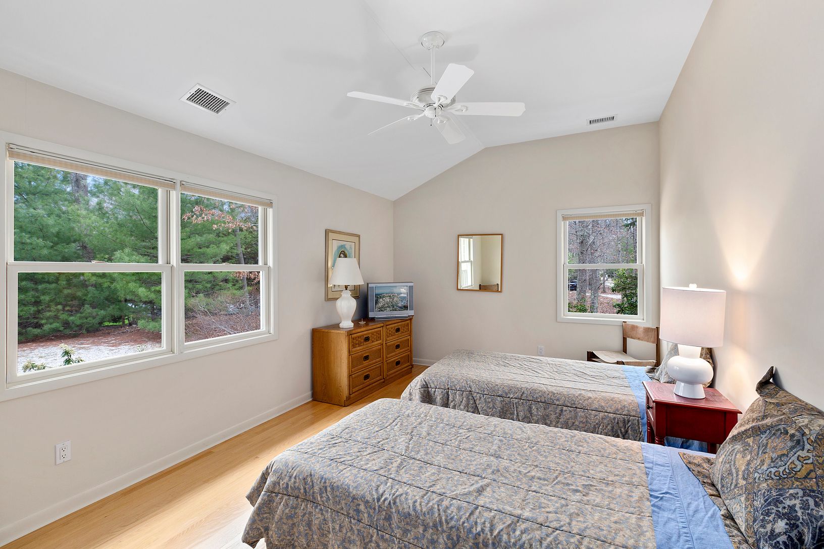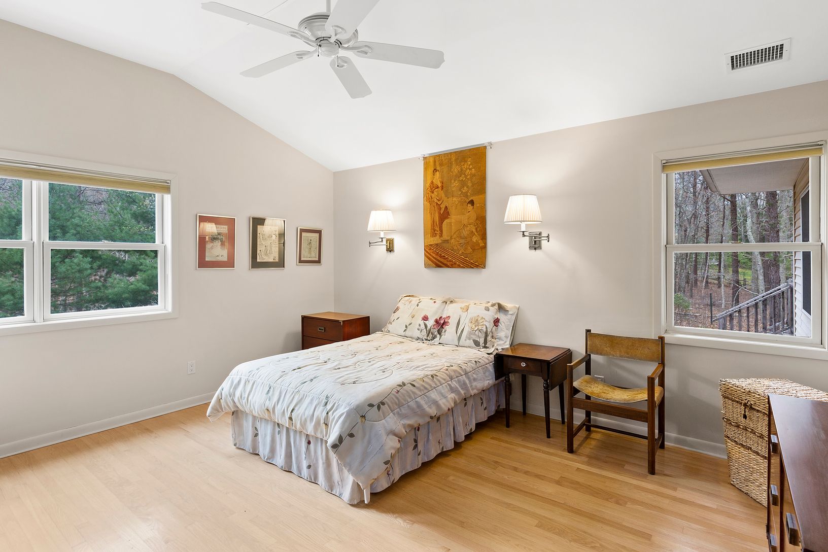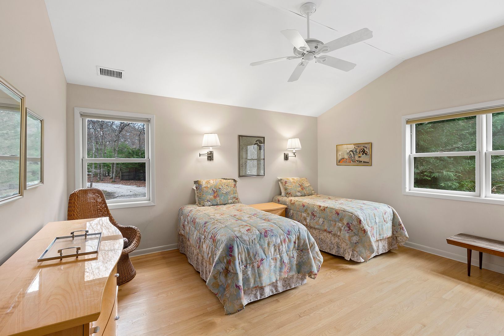 This open layout contemporary is centrally located in East Hampton and is situated at the end of a quiet cul-de-sac. With lofted ceilings, an open floor plan and a large fireplace the bright open feeling is also quaint and cozy. The backyard offers plenty of decking, and patio around the pool area. The interior has an eat-in kitchen, dining area, and mudroom area leading out to the backyard. Four nicely proportioned bedrooms with two and half