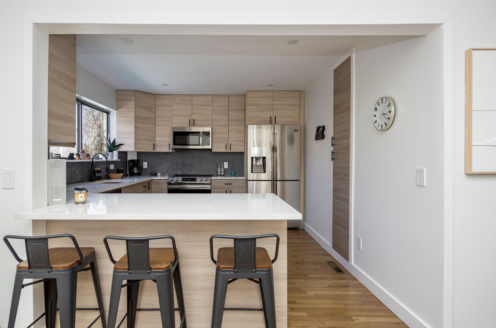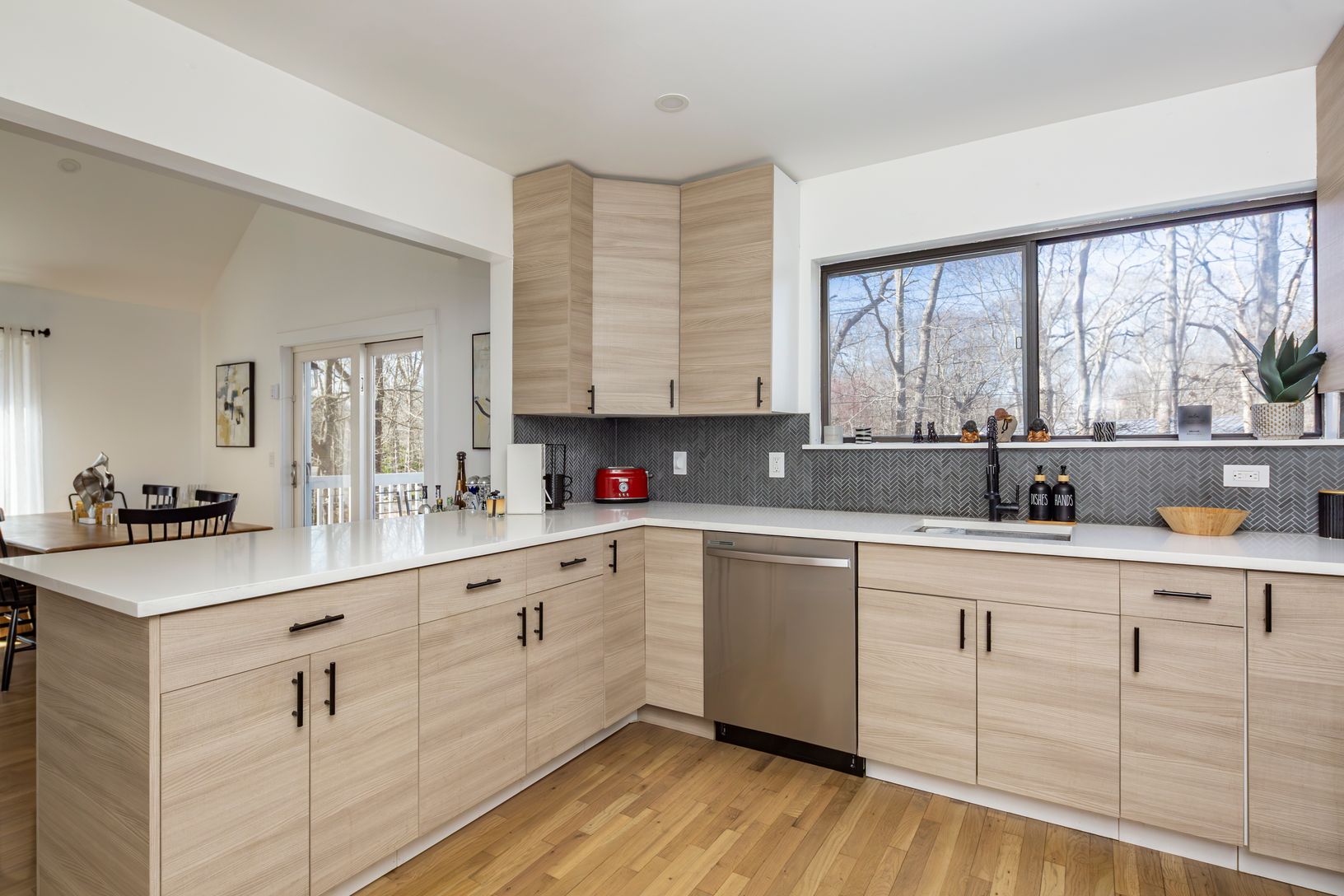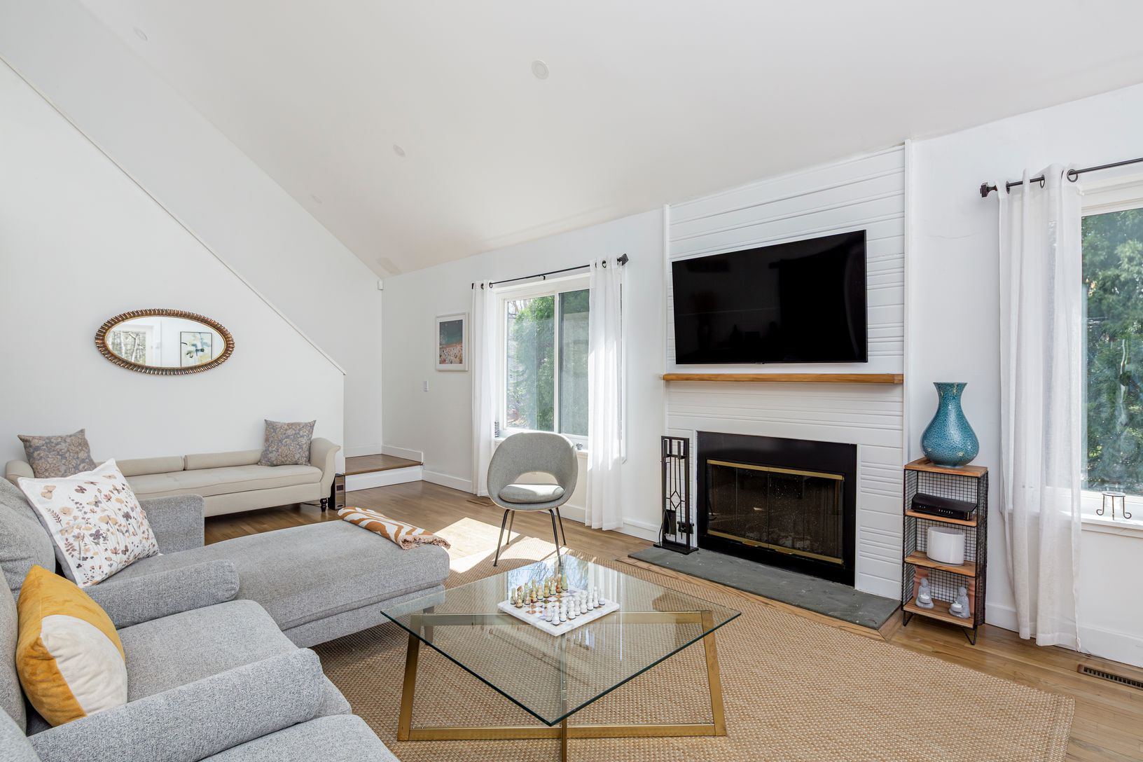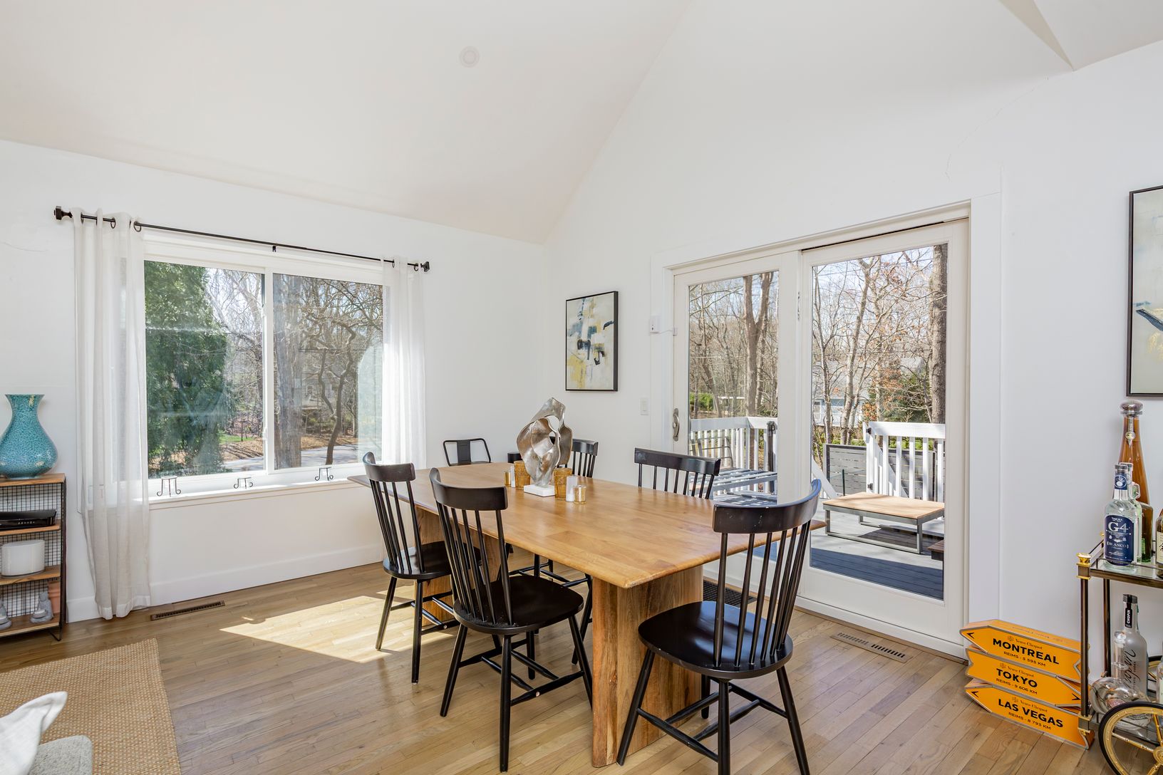 This charming 3-bedroom, 2-bathroom home is a perfect blend of contemporary design and relaxed comfort. The great room features soaring ceilings, creating a welcoming space for gatherings and relaxation. The newly upgraded gourmet kitchen, equipped with stainless steel appliances and quartz countertops, flows seamlessly into a dining area with sliding doors that open onto an inviting deck. Completing the main floor, you'll find a private bedro