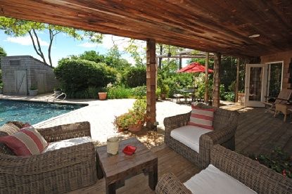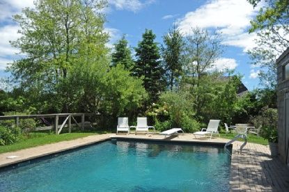 Understated summertime living is just as it should be at this original Futterman designed south of the highway contemporary beach cottage on Sagg Pond in Bridgehampton. Adjacent to a 14 acre farm reserve, features of this home include four bedrooms, three and one-half baths, an open floor plan with mid-century decor, pops of color and a garden room. Dine en plein air on a patio or enjoy the gunite pool. With 55 feet of frontage on the pond, th