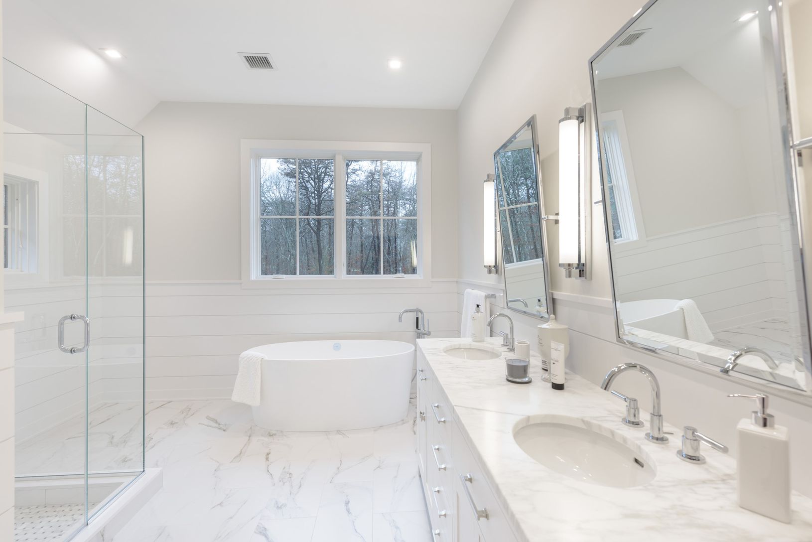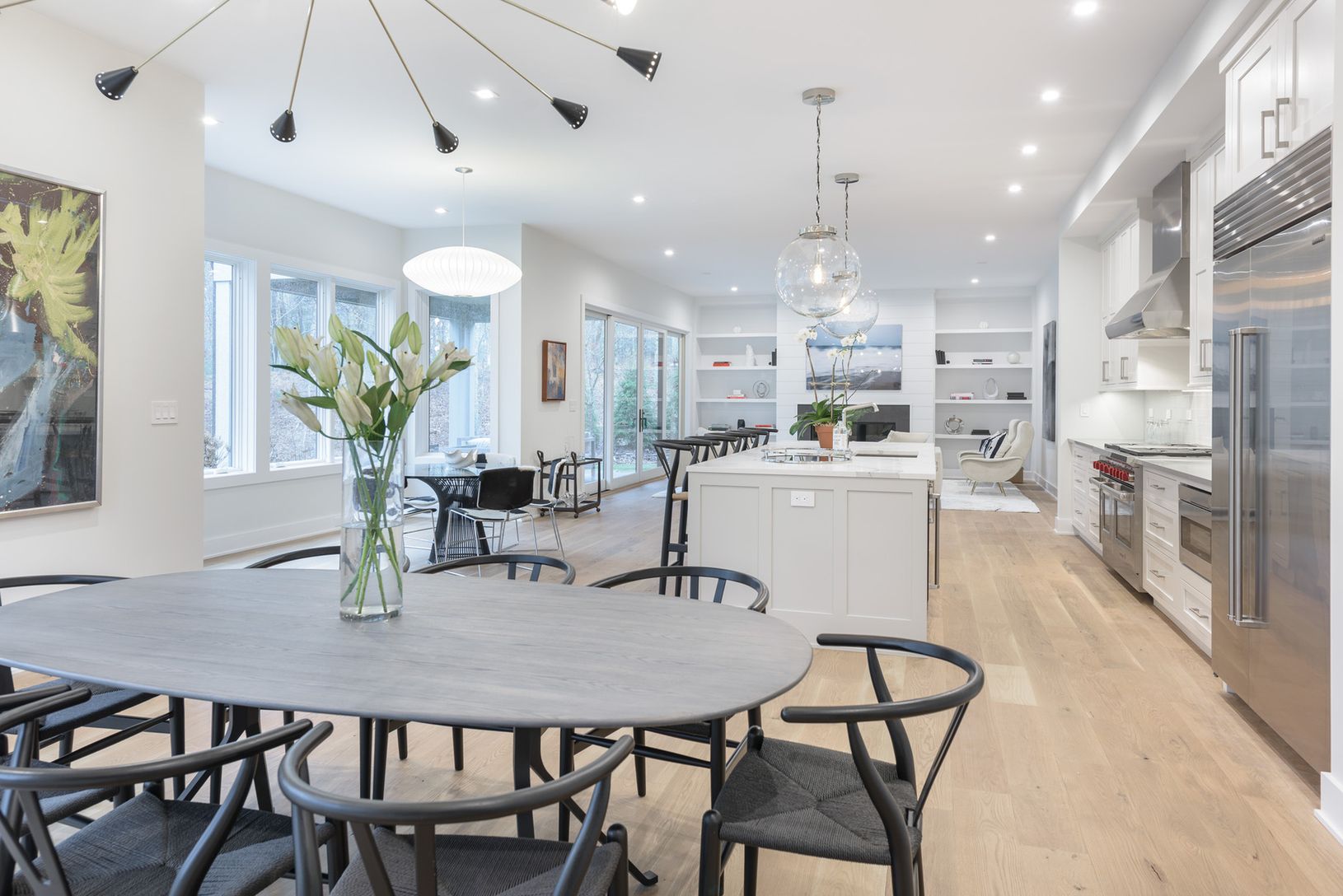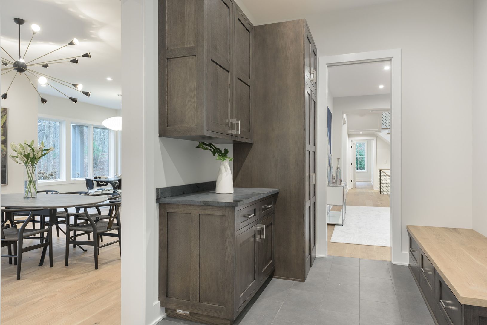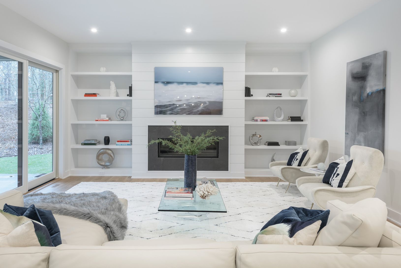 Only 2 miles from the center of East Hampton village on 1.5+/- acres stands the latest in high-end construction from Bluefin General Contracting, known for their fine quality and close attention to detail. This newly completed transitional-style home, with traditional cedar shingle exterior and modern interior spaces, melds the best elements from previous builds into a home that's perfect for a quiet escape yet just a short jaunt to village sh
