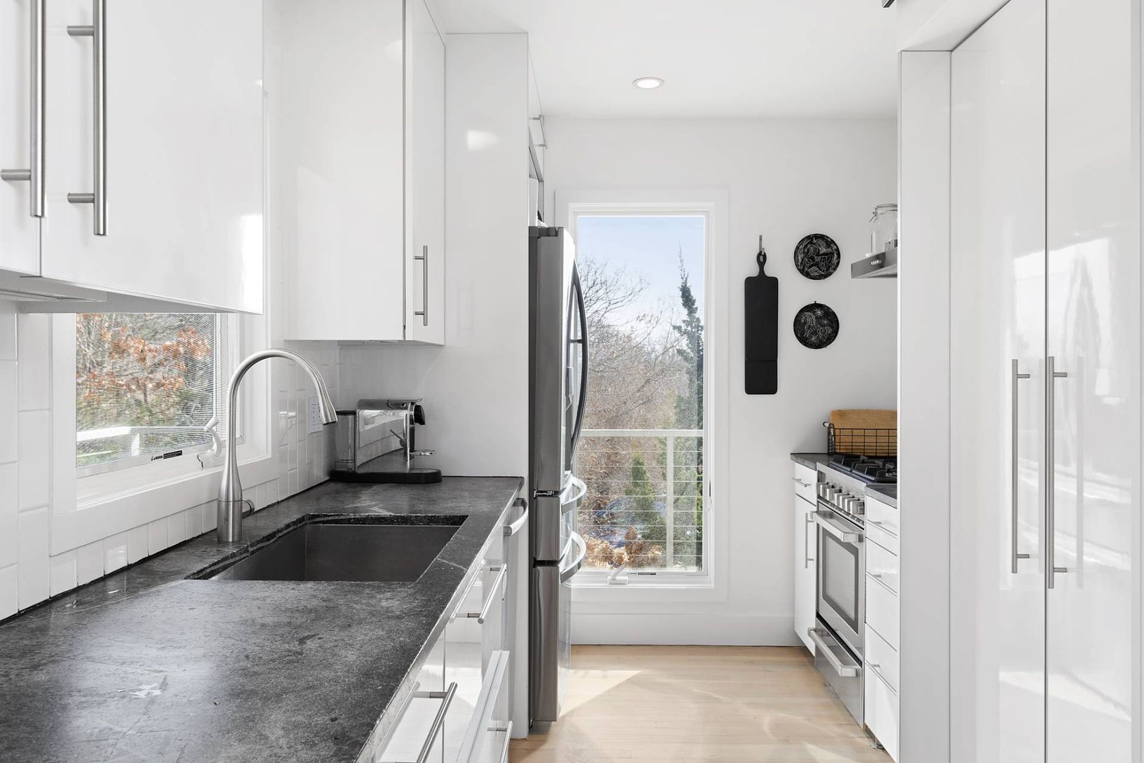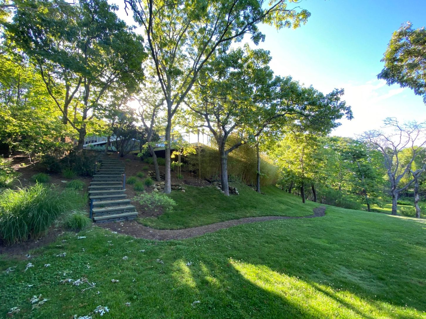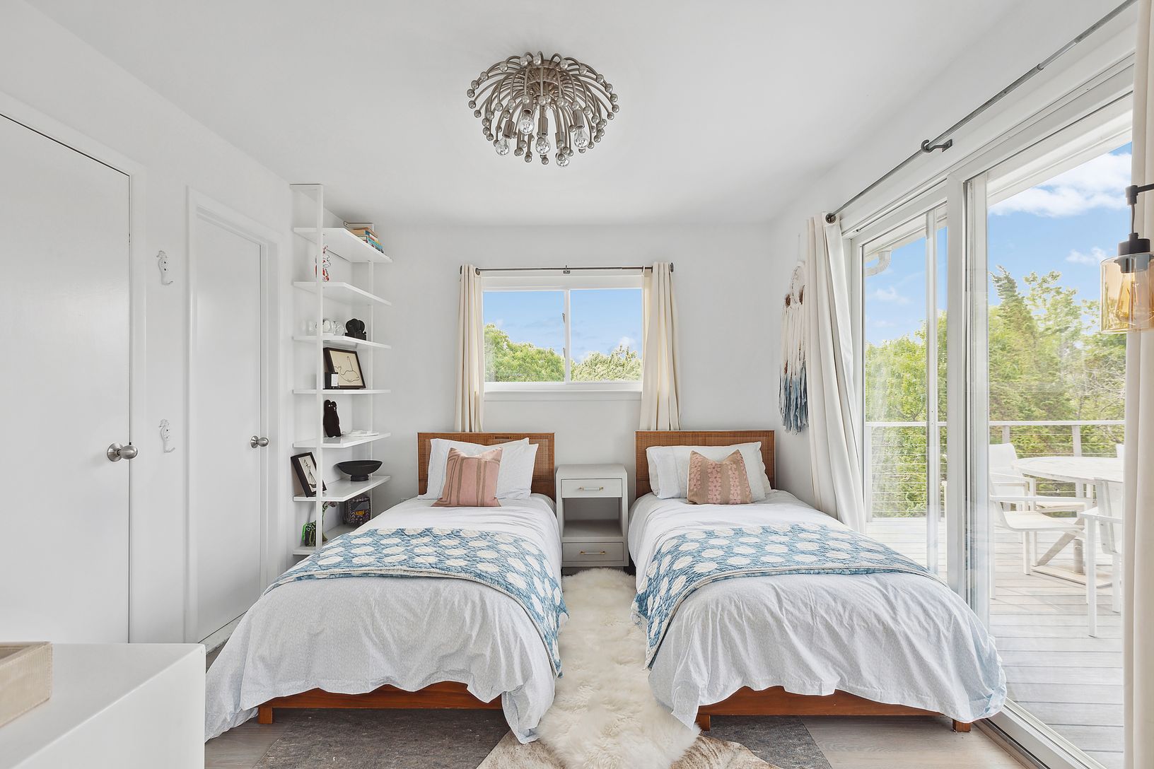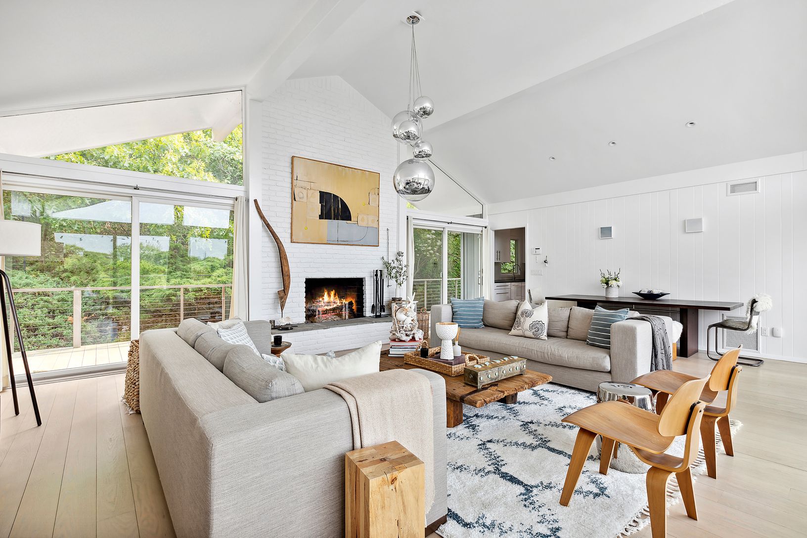 Turn key and situated in one of the most coveted Montauk locations, this chic modern A-frame is sited on over an acre with peeking ocean views. The interior features a spacious living room with a wall of glass facing south and a woodburning fireplace while kitchen has been updated with stainless steel appliances. A guest bedroom and the primary bedroom located on this level each have their own baths and sliders to the expansive deck overlookin