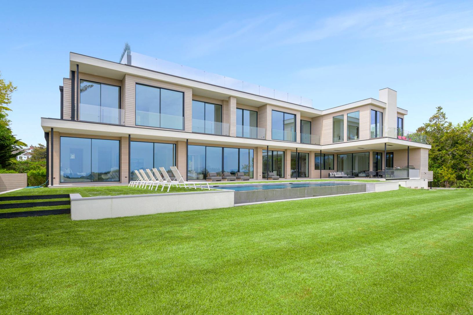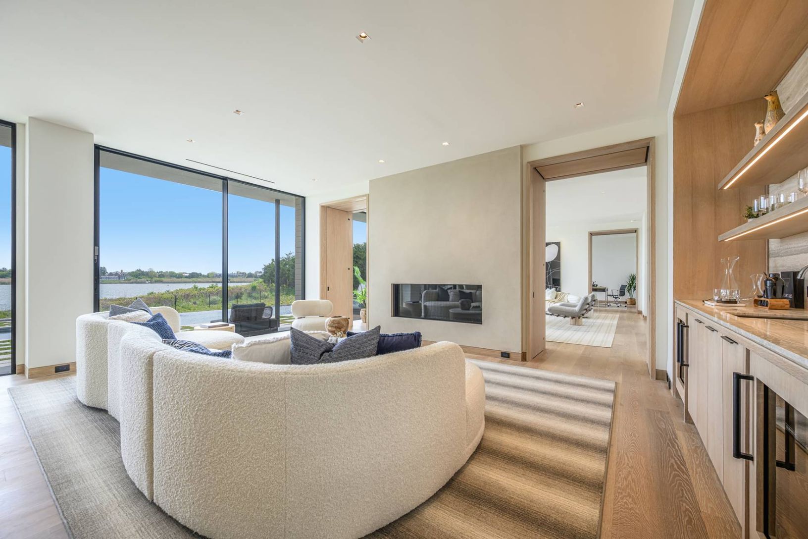 New from the renowned Hamptons Development Group, 199 Georgian Lane is an inspiration in and of every sense, with luxurious design and material quality to mirror the natural beauty of Mecox Bay. Sited on 1+/- acre, this expansive estate has 9,000 +/- sq. ft. of luxury living space with 8 total ensuite bedrooms, 9 full baths and 2 powder rooms, 2-car garage, waterfront Infinity pool with spa, rooftop lounge with entertainment kitchen, boat slip