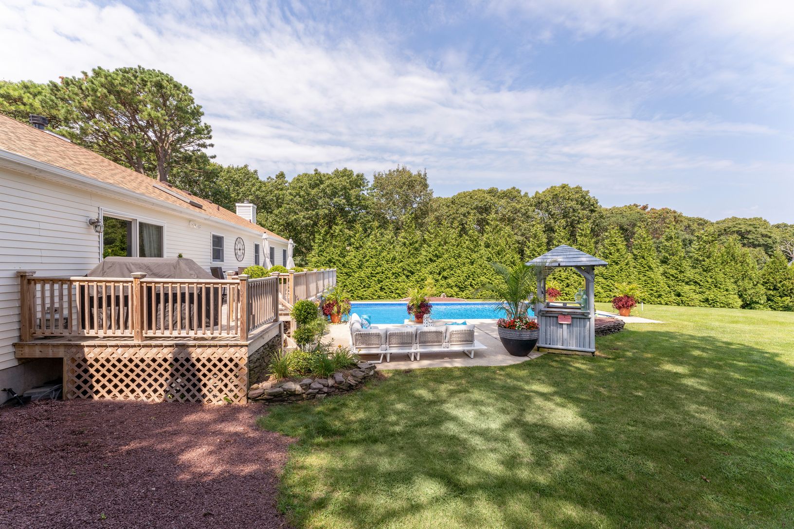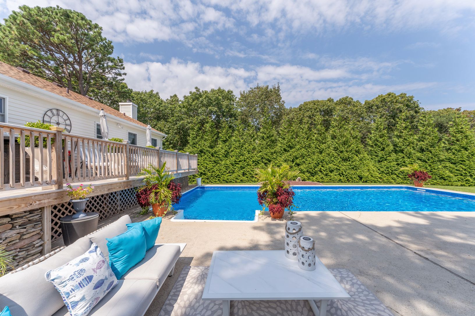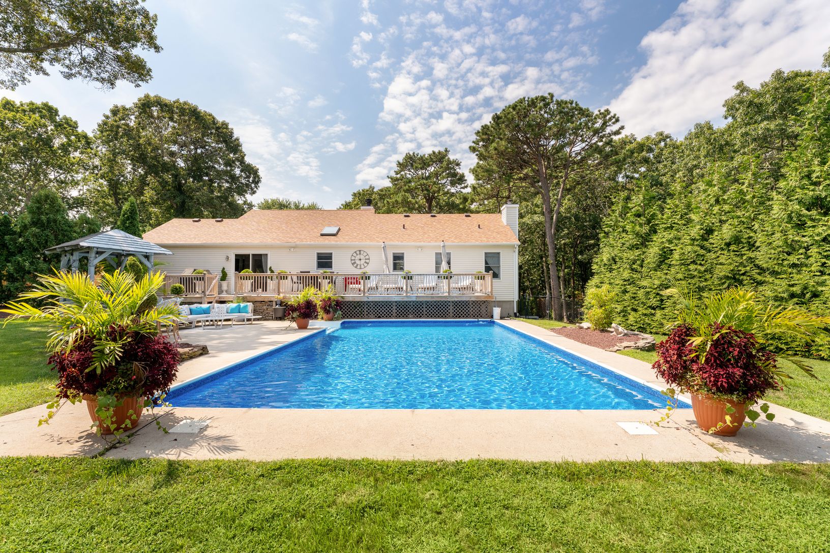 Beautiful One Story Home on .67 Private Beautifully Landscaped & Maintained Acres on Cul-de-sac. Cathedral Ceiling Spacious Living Room with Fireplace and Oak Floors Through Out. Large Skylit Eat-In Kitchen with Granite Countertops, Stainless Appliances, and granite Dining Area. Master Bedroom with en suite Private Full Bathroom. Two additional bedrooms and One Hallway Full Bathroom. Large Sundeck Overlooking Inground Pool. One Car At