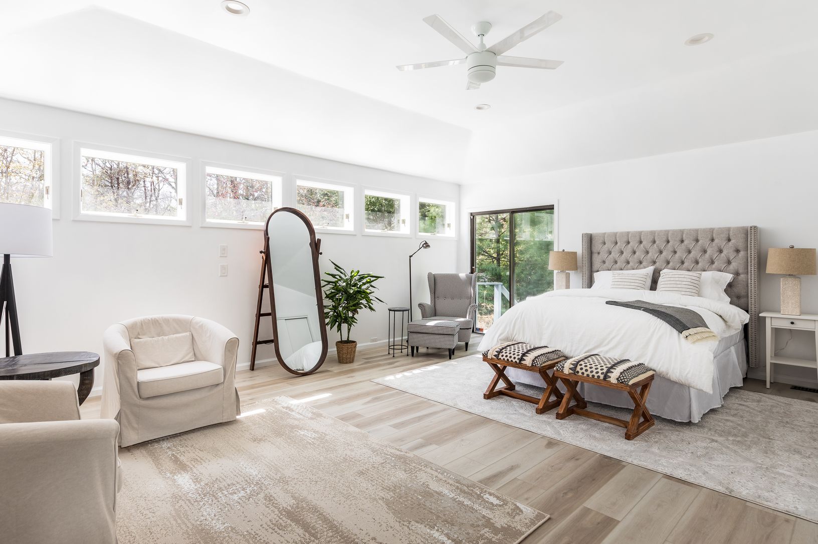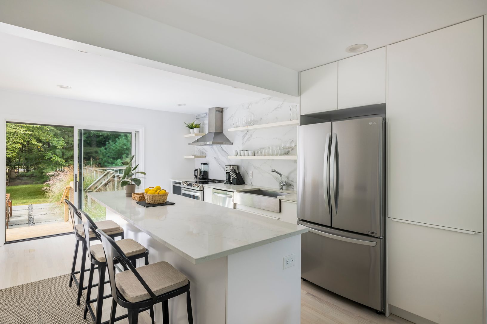 This fully renovated and stylish four bedroom, three bathroom home is less than 2 miles from both Amagansett and East Hampton. Beautifully furnished and designed for easy summer living, the home features a bright and airy open floor plan with high ceilings, french doors, and working fireplace. The sleek modern kitchen is equipped with stainless steel appliances, and provides everything you'll need to cook and entertain. Adjacent to the kitchen