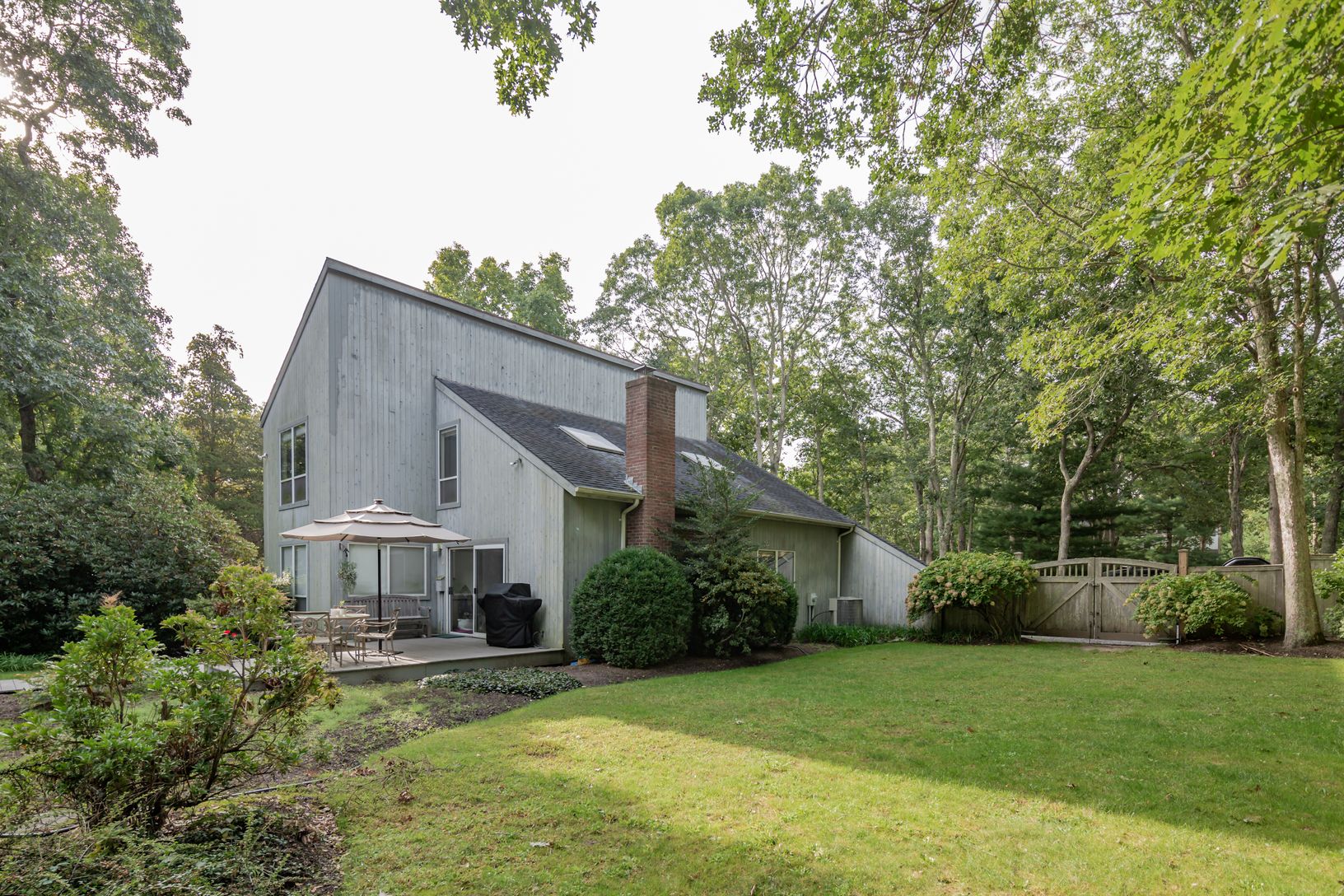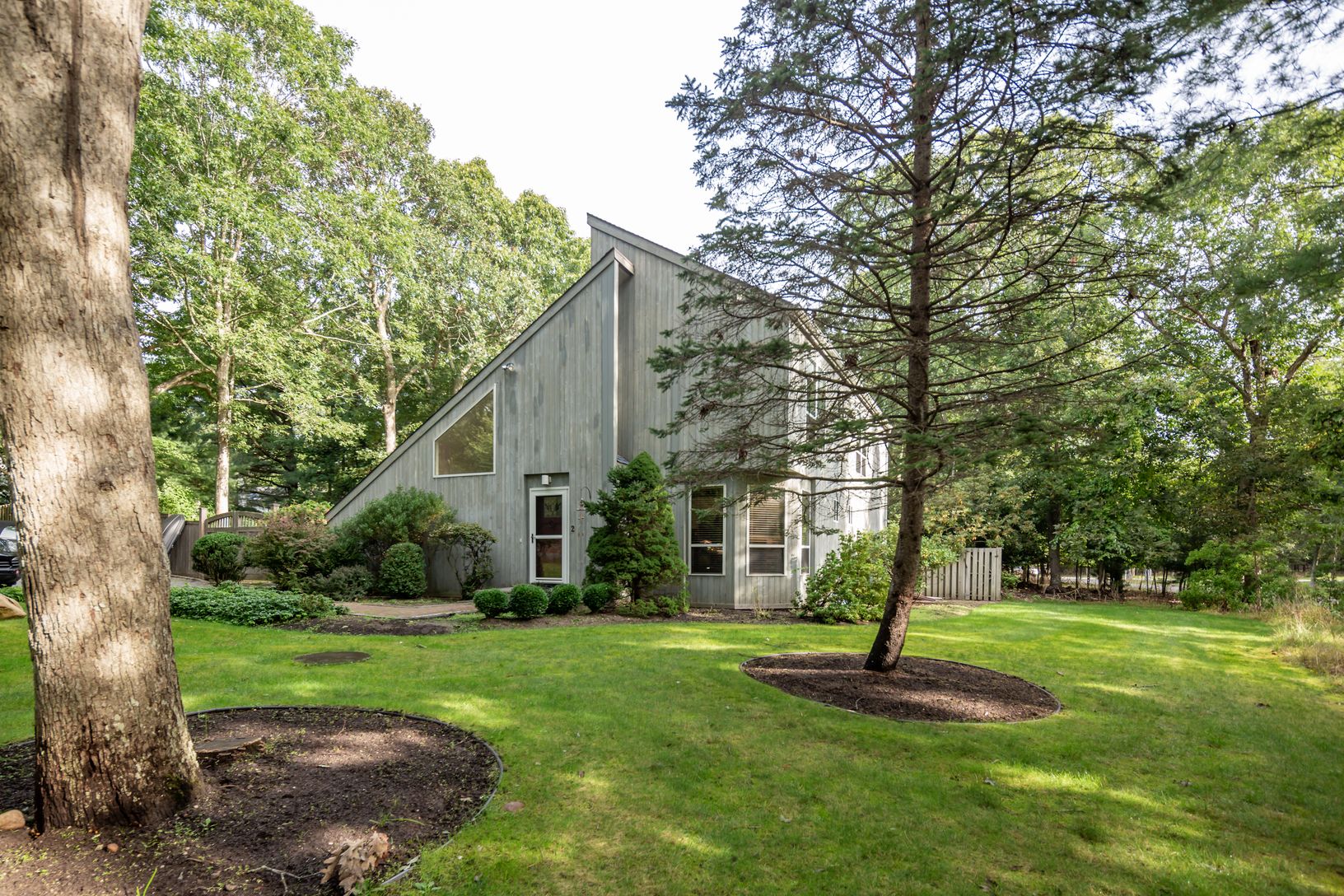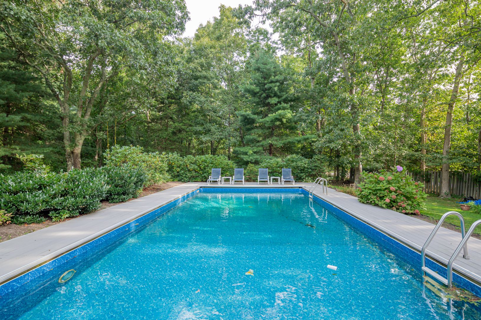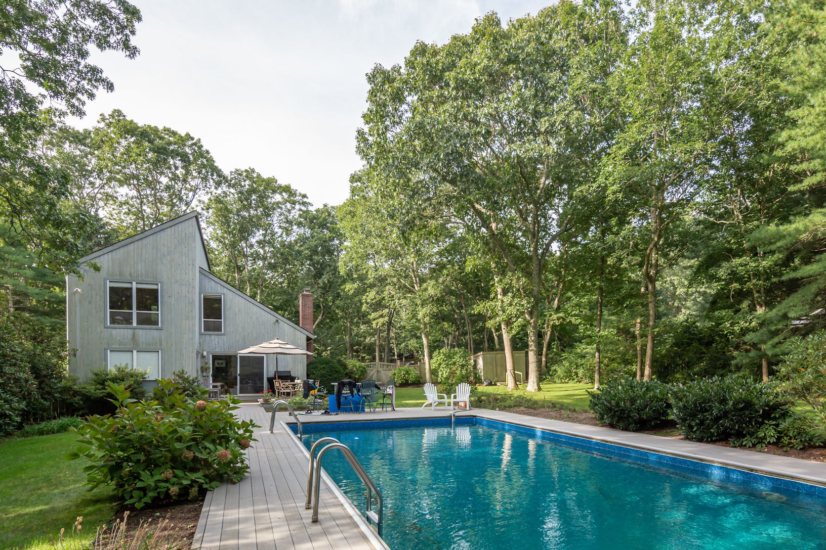 Here's the perfect home for year-round living or summer enjoyment! Sited on a beautifully landscaped 1+/- acre in the Northwest Woods that's convenient to East Hampton Village and bay beaches, this lovely property boasts 4 bedrooms, 2.5 baths, and much more. The living room and dining area with cathedral ceilings and skylights create a bright and airy space with wood burning fireplace and glass doors opening to the heated pool and entertainin