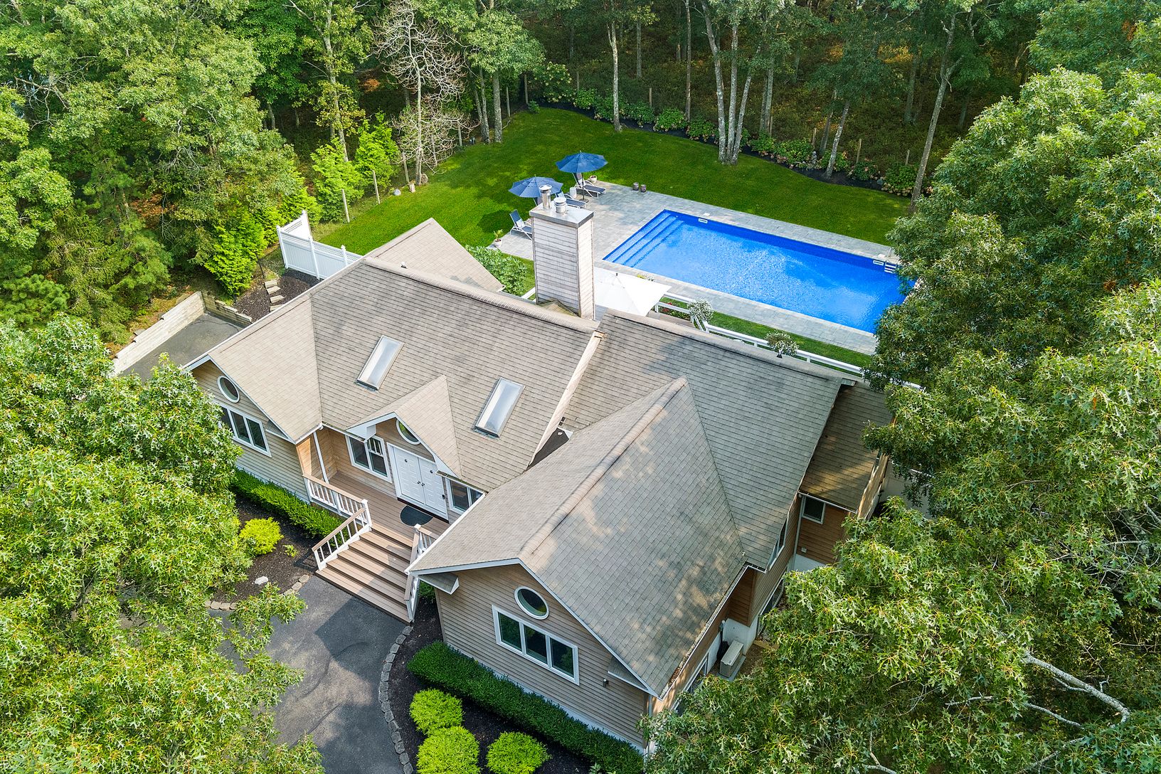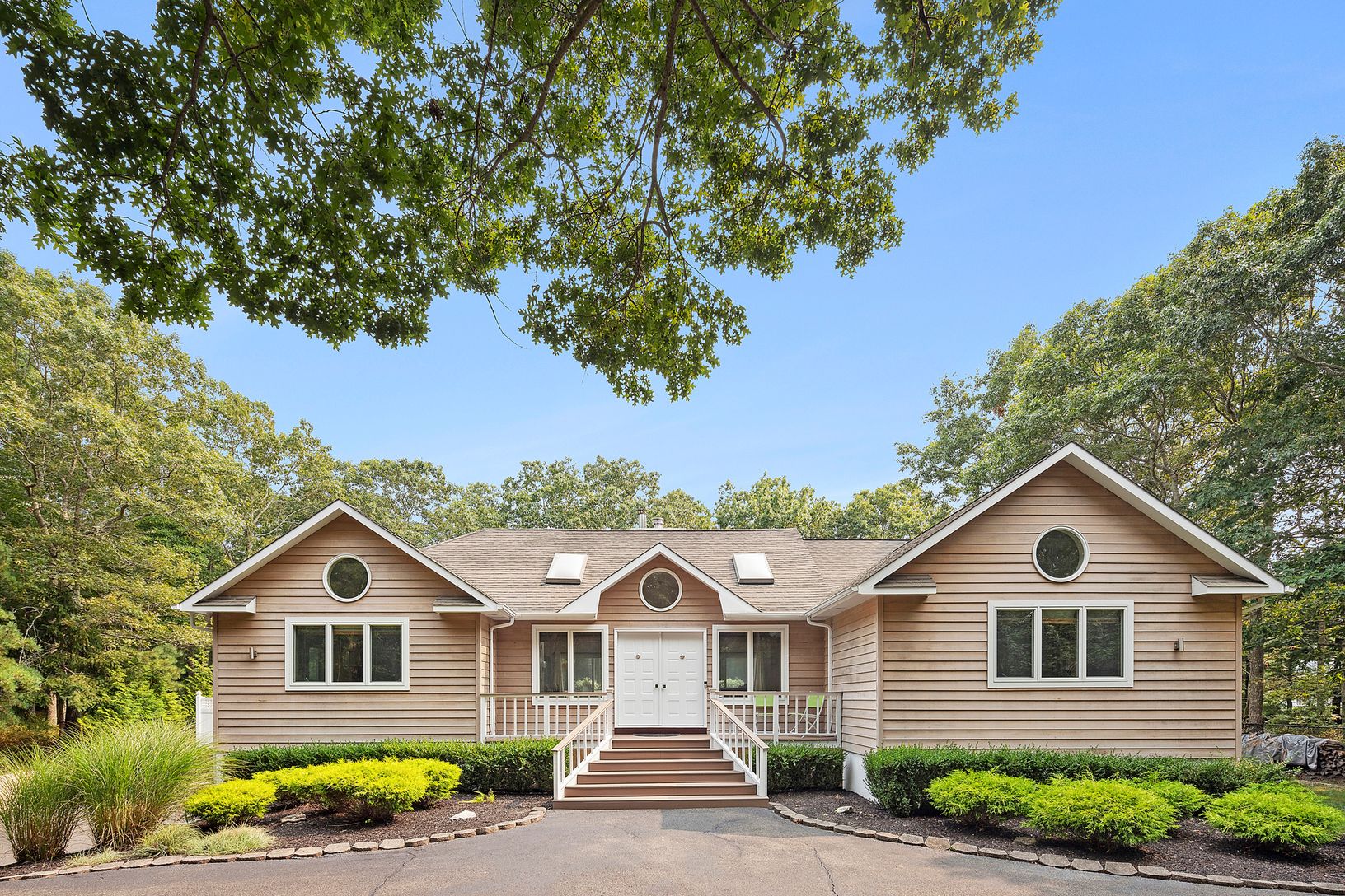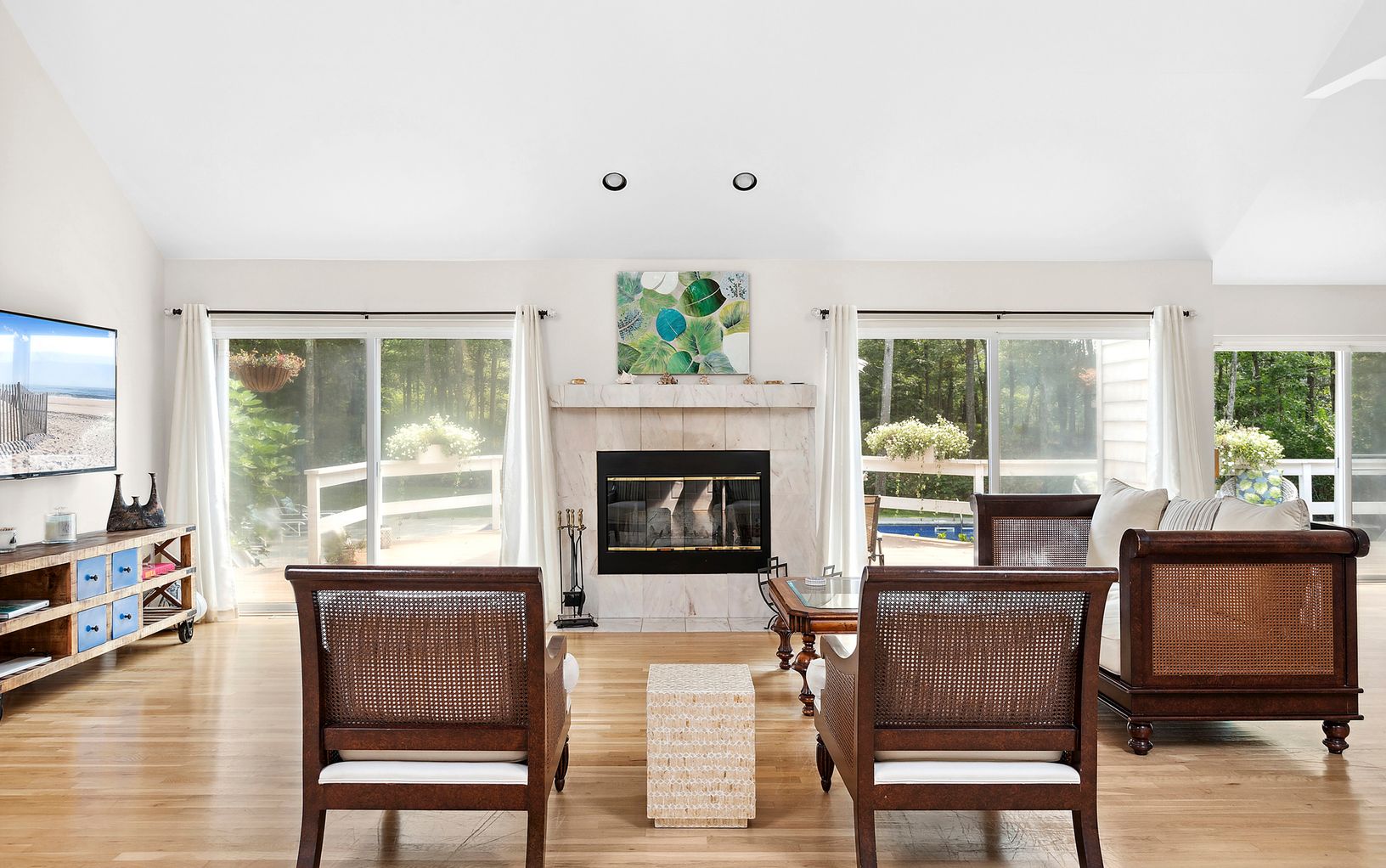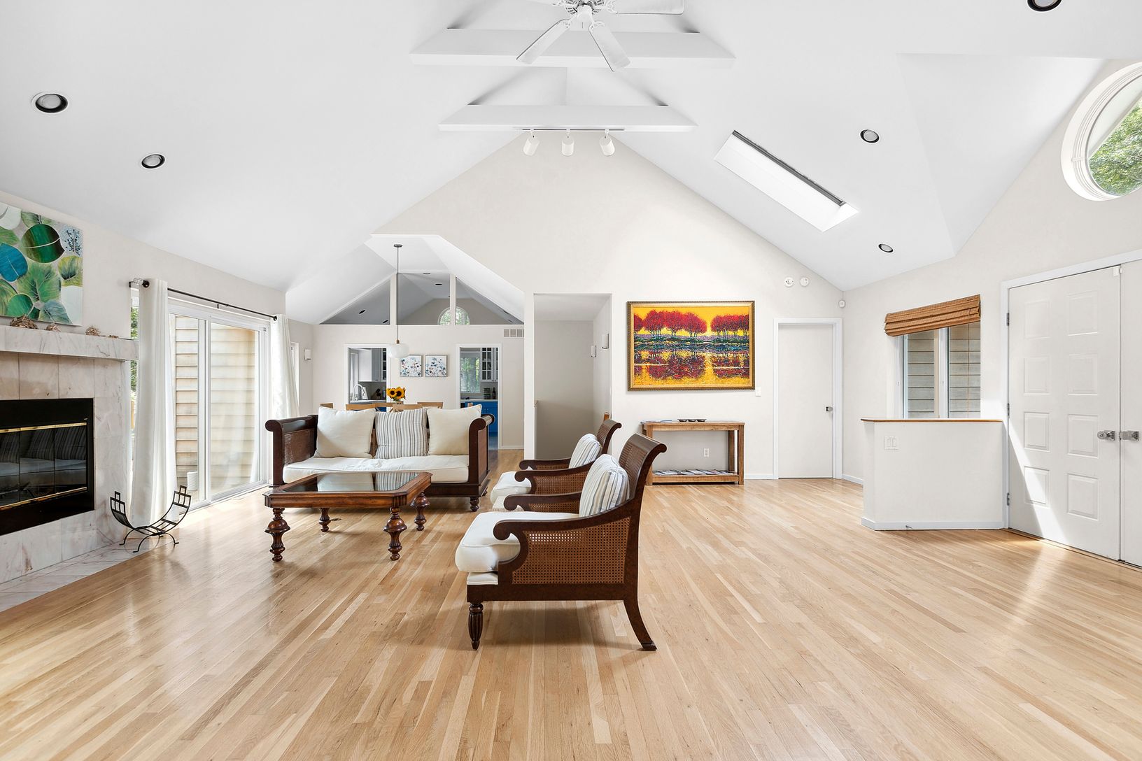 From the vast circular driveway, a charming front porch greets guests. Through the double doors, you are introduced to a great room with soaring 16-foot ceilings and skylights. A wood-burning fireplace flanked by glass sliders c