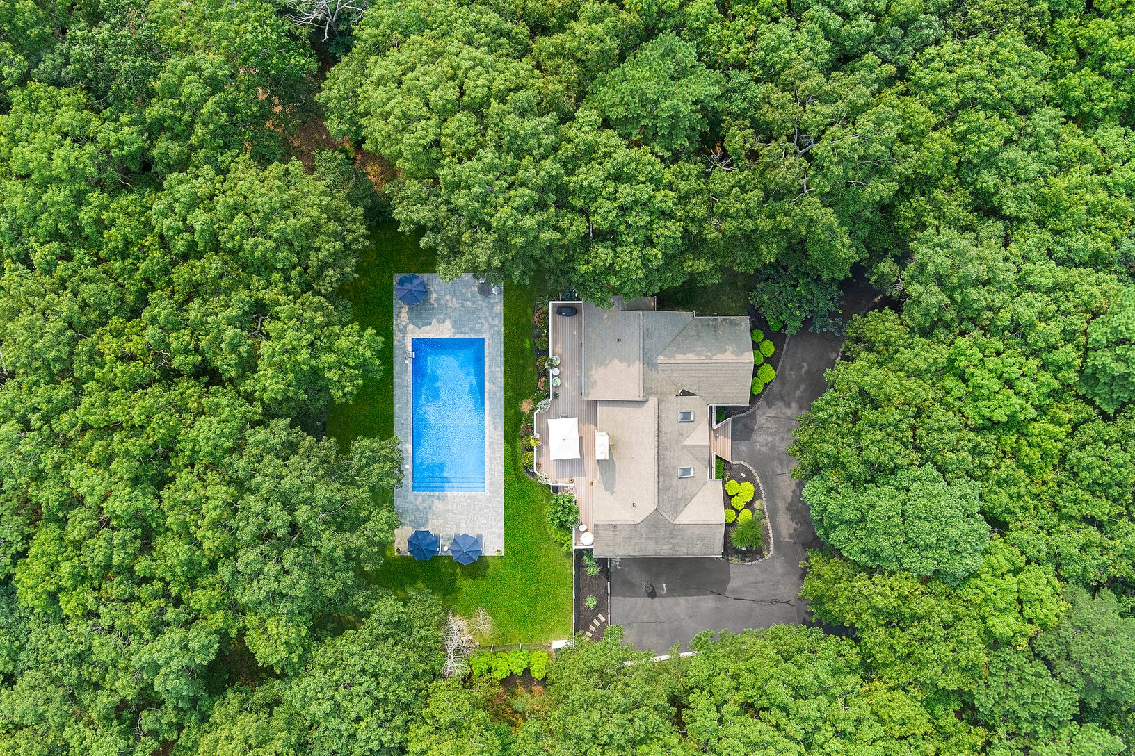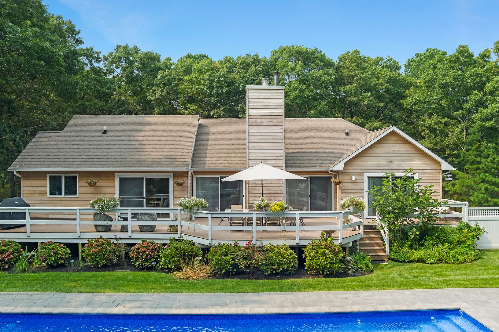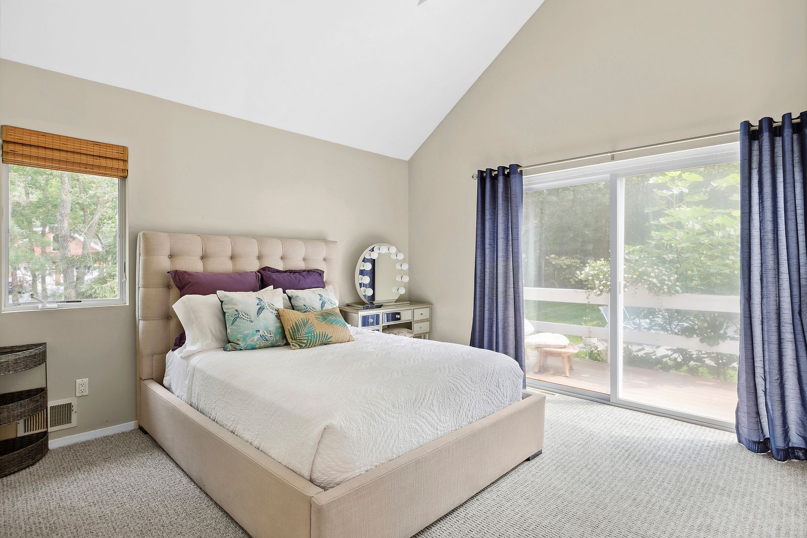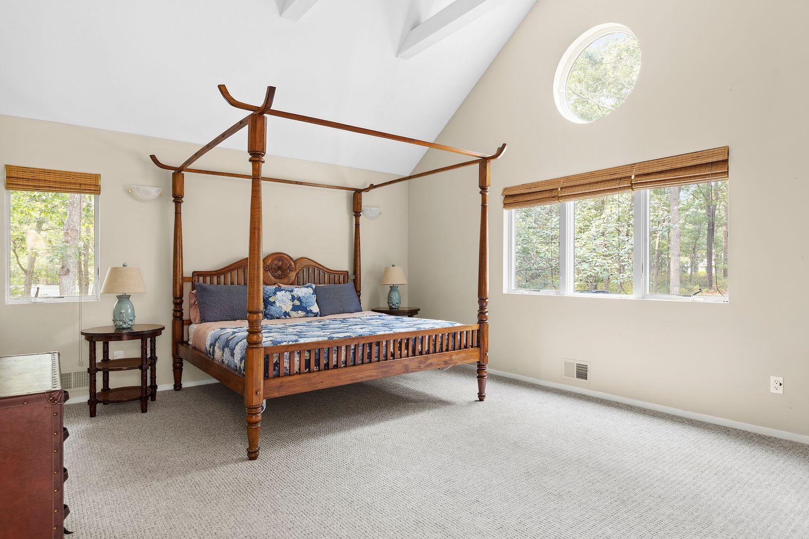 From the vast circular driveway, a charming front porch greets guests. Through the double doors, you are introduced to a great room with soaring 16-foot ceilings and skylights. A wood-burning fireplace flanked by glass sliders c