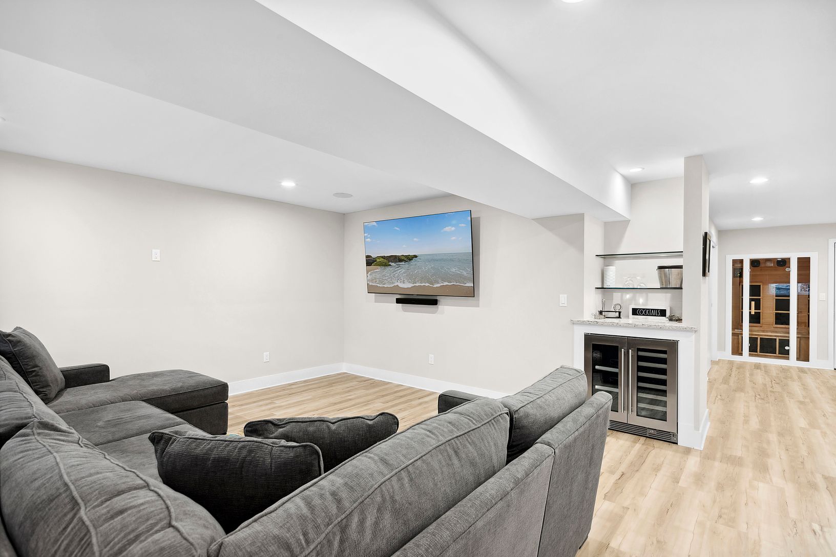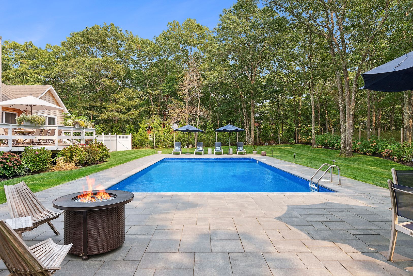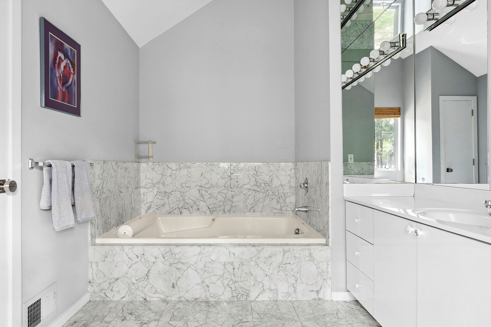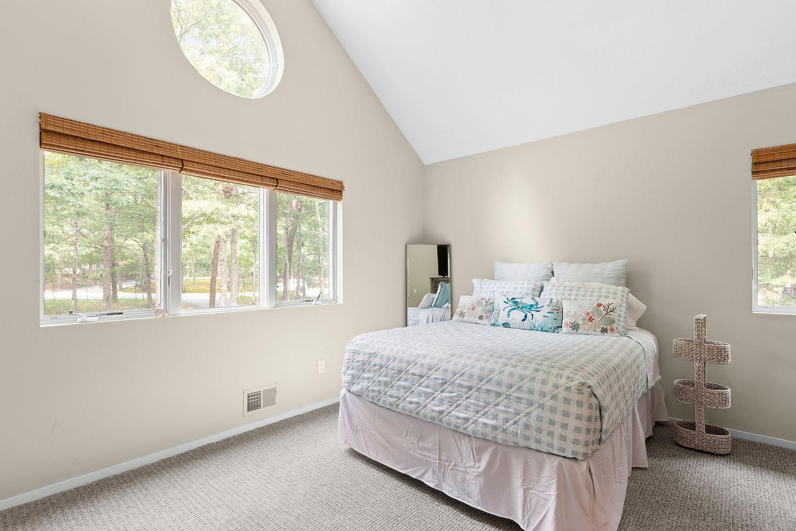 From the vast circular driveway, a charming front porch greets guests. Through the double doors, you are introduced to a great room with soaring 16-foot ceilings and skylights. A wood-burning fireplace flanked by glass sliders c