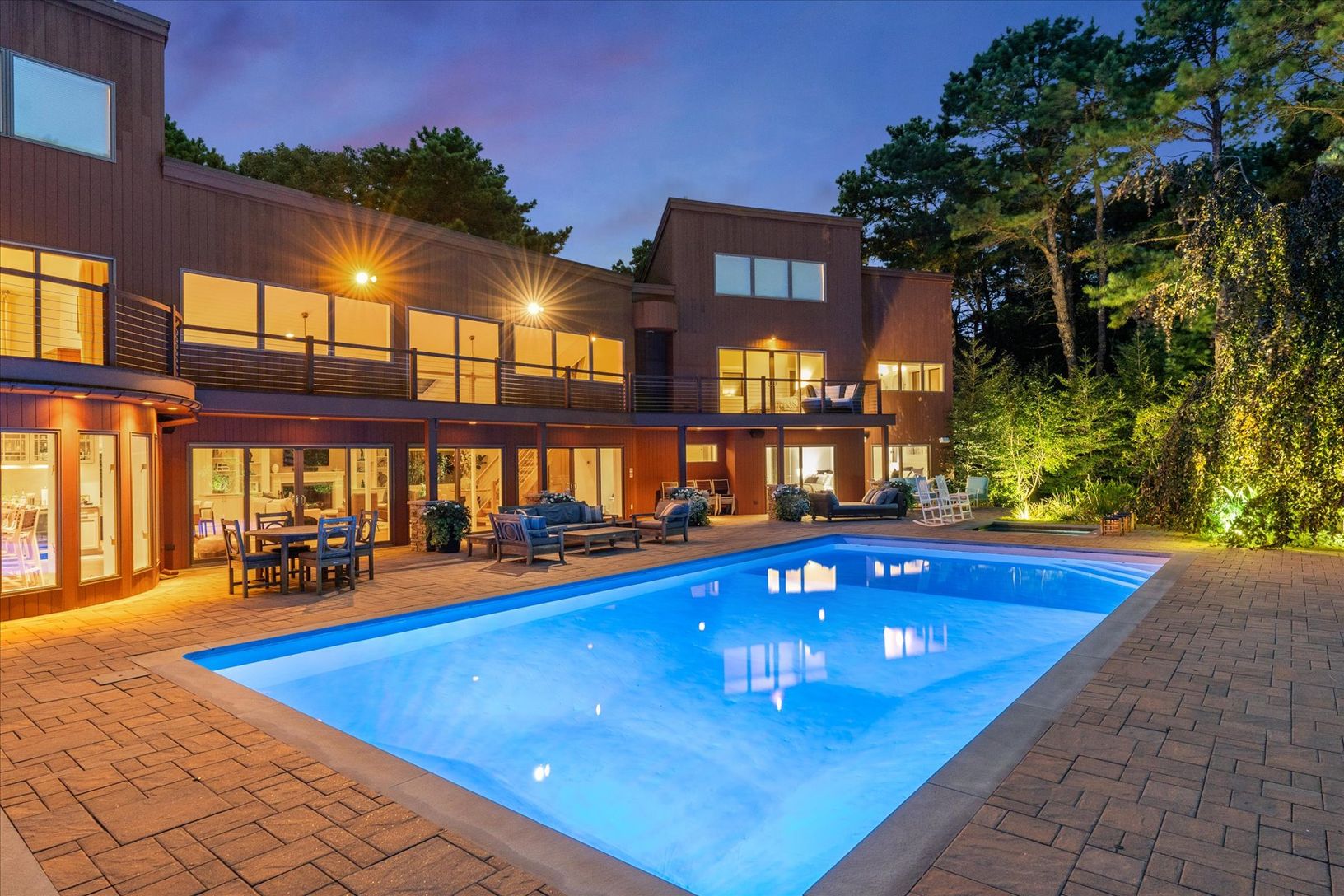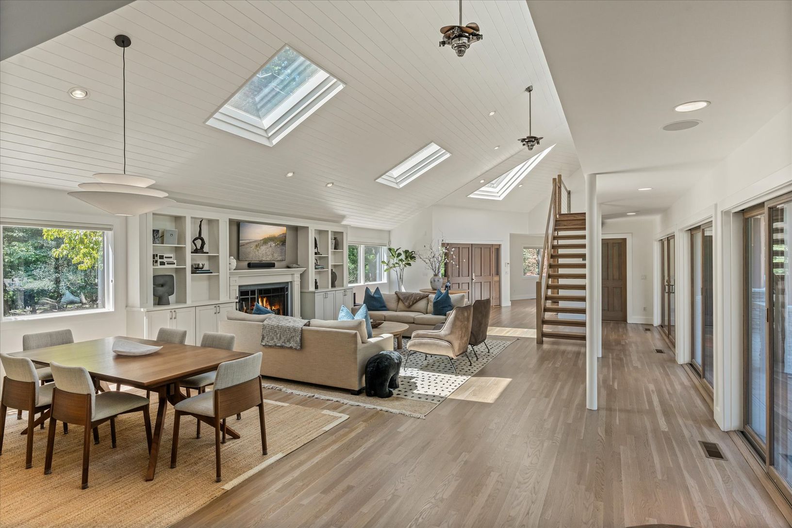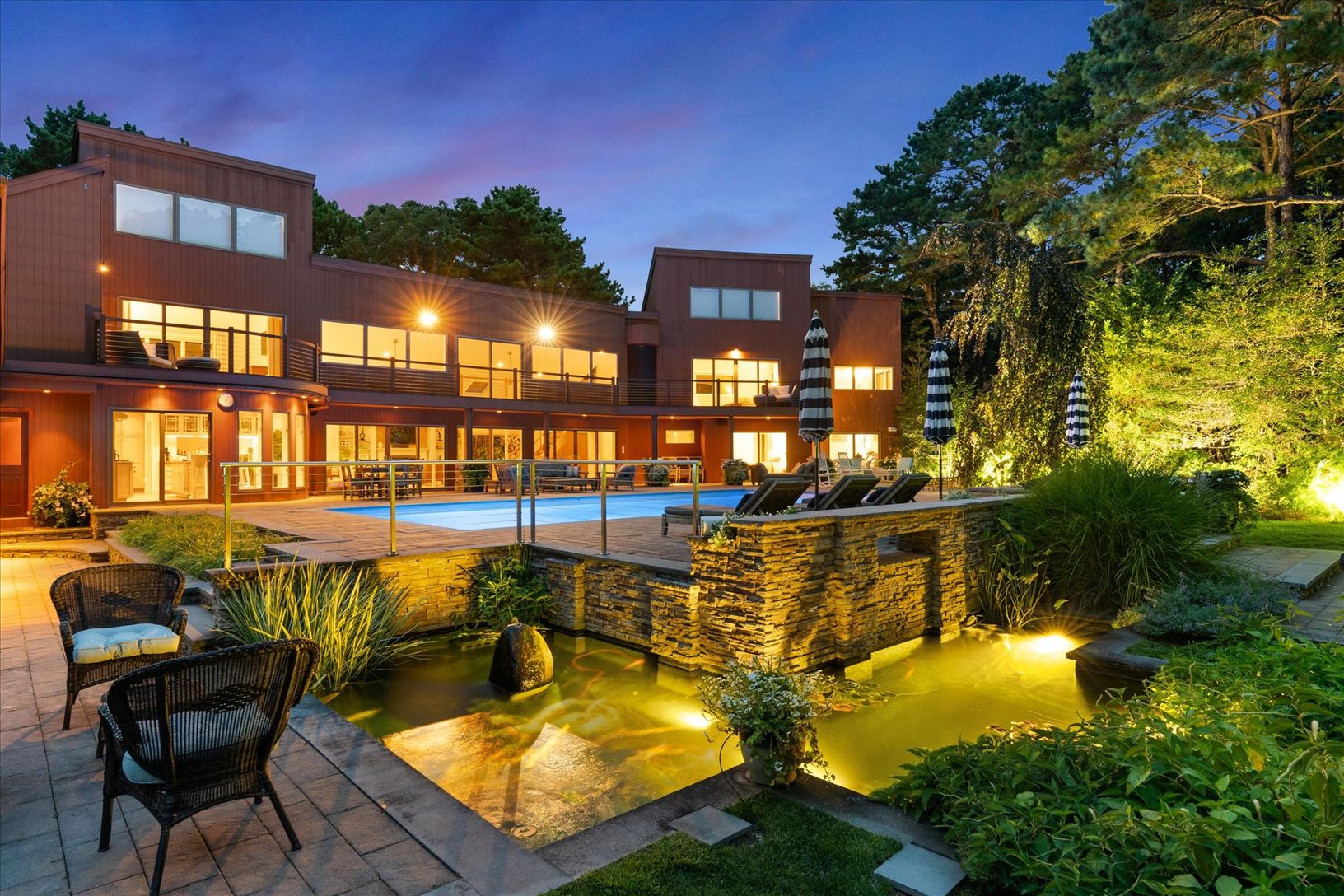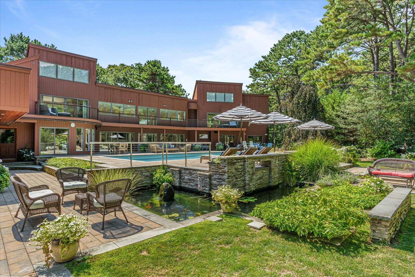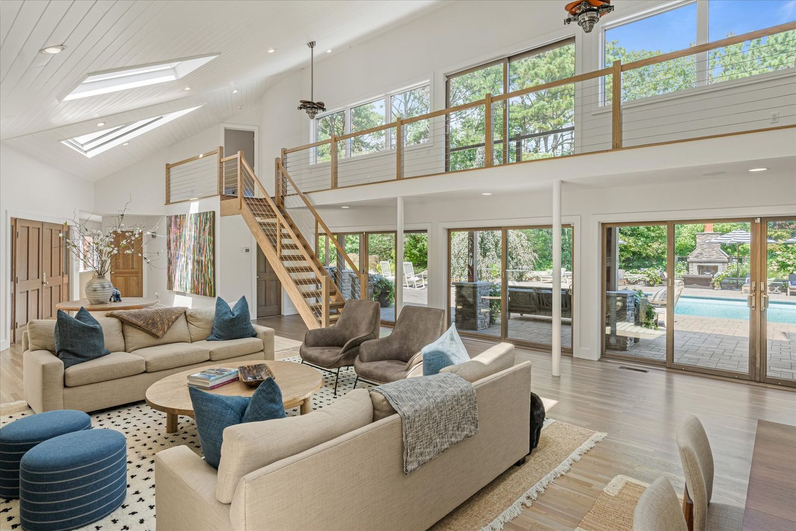 An extraordinary, spacious home bathed in light for family and entertaining and wrapped in mature vegetation awaits at 2 Eagle Close in East Quogue. The fully-renovated private oasis on a 1.4 acre corner lot boasts 5 bedrooms, including two spacious primary suites upstairs with private balconies, 5 baths, two half baths and 3 laundry rooms, one on each floor. Inside, the open floor plan offers breathtaking views of the meticulously redesigned