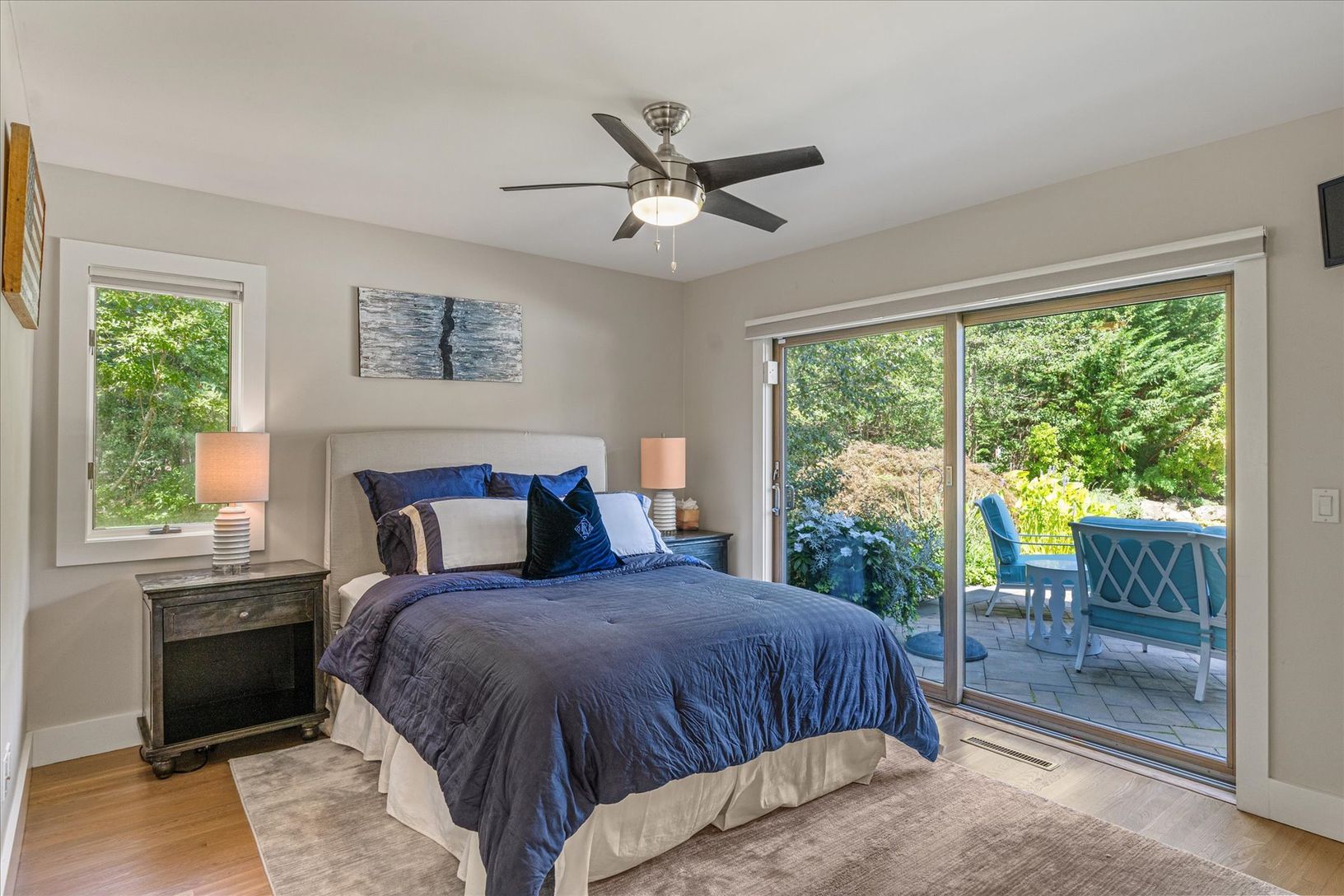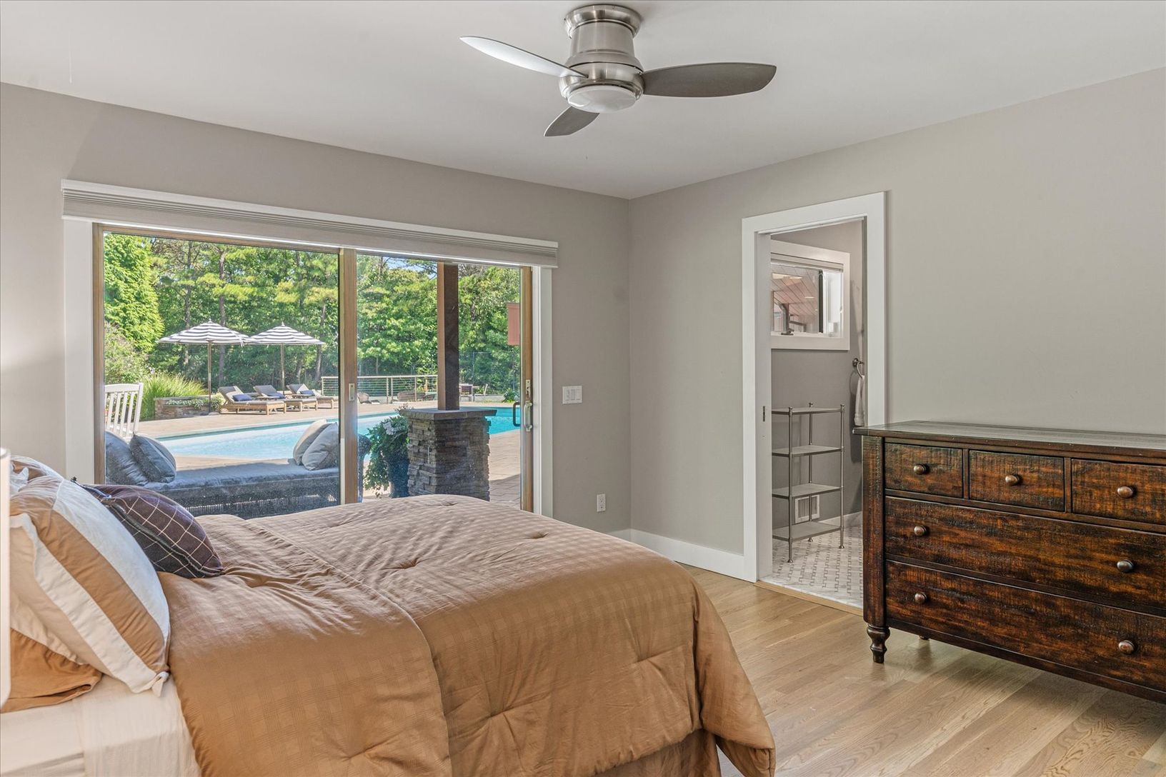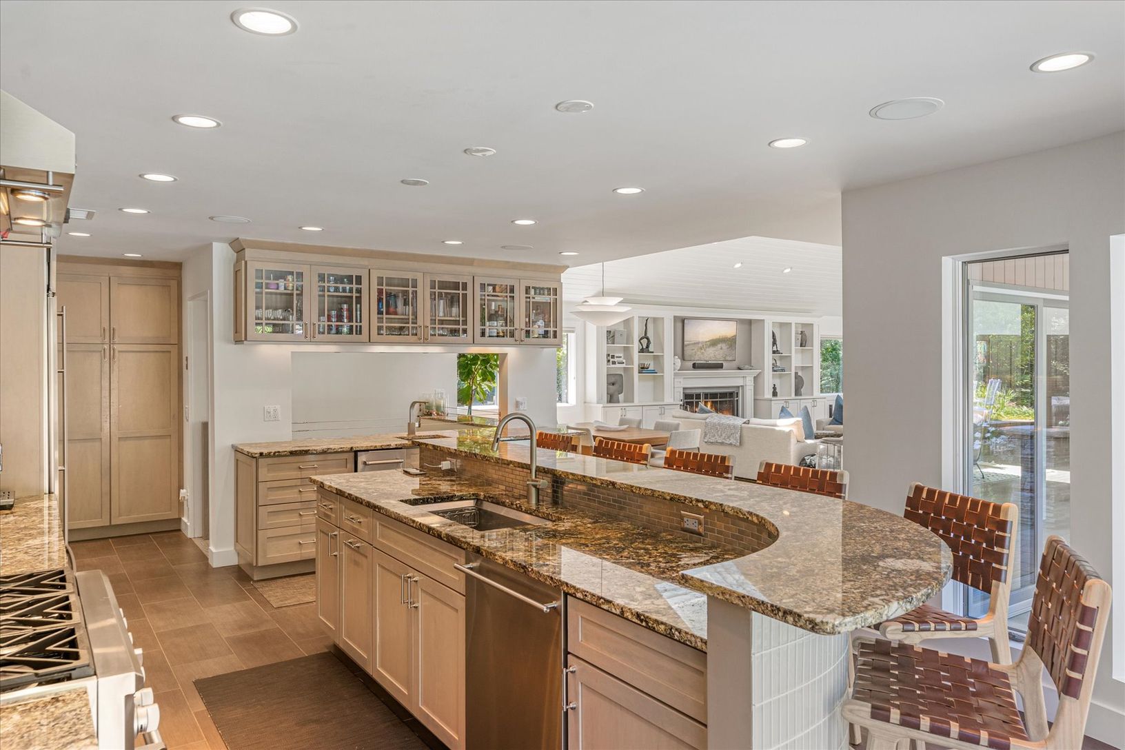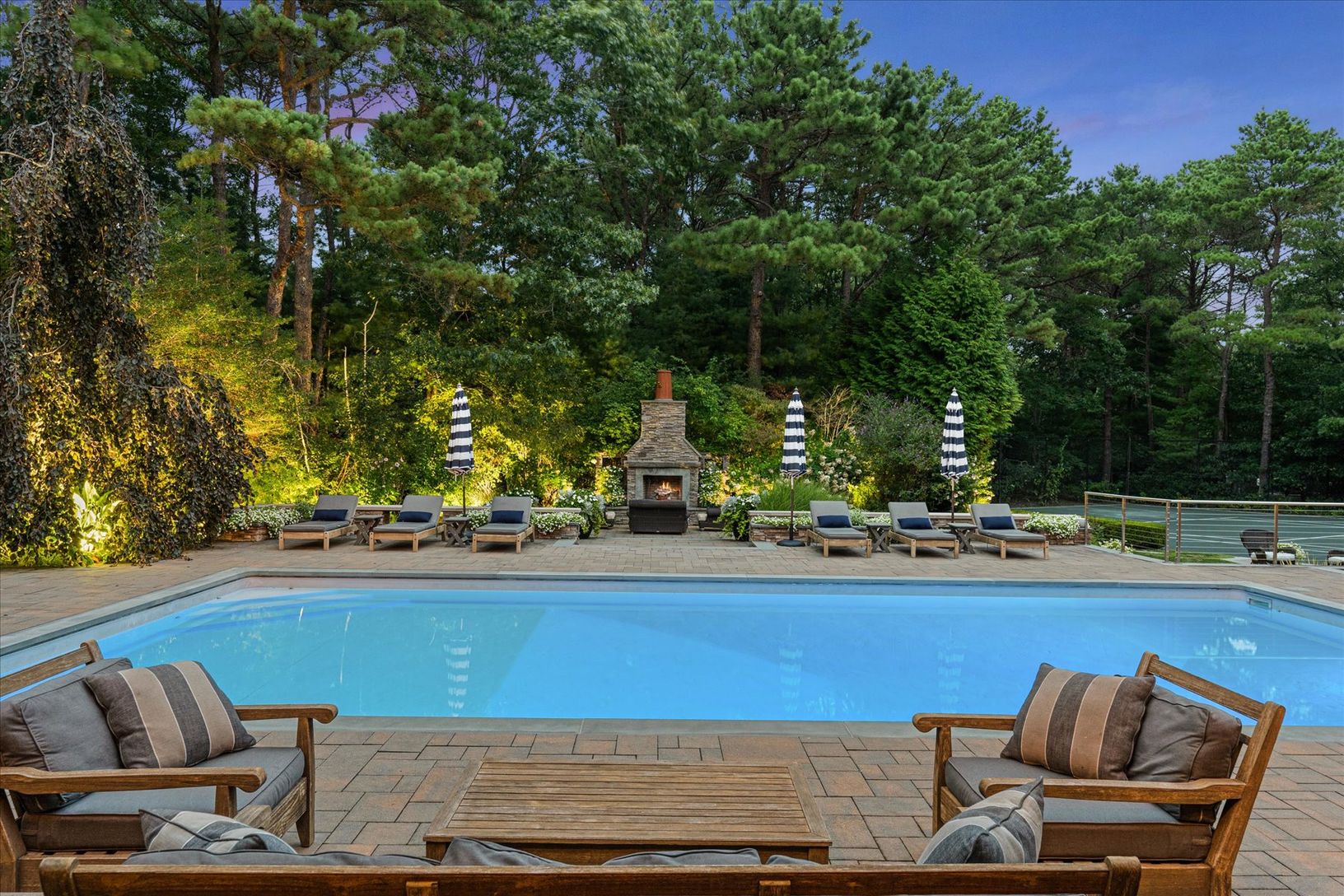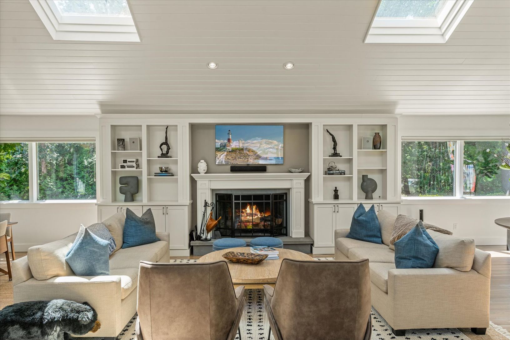 An extraordinary, spacious home bathed in light for family and entertaining and wrapped in mature vegetation awaits at 2 Eagle Close in East Quogue. The fully-renovated private oasis on a 1.4 acre corner lot boasts 5 bedrooms, including two spacious primary suites upstairs with private balconies, 5 baths, two half baths and 3 laundry rooms, one on each floor. Inside, the open floor plan offers breathtaking views of the meticulously redesigned