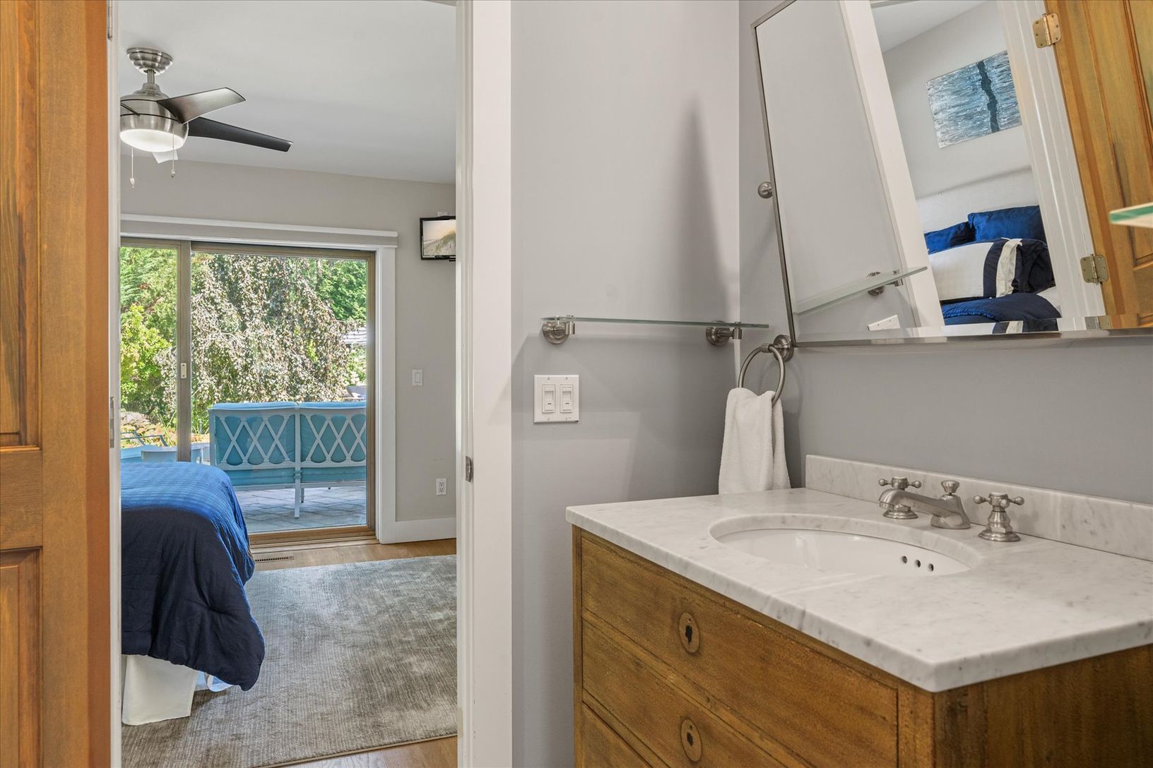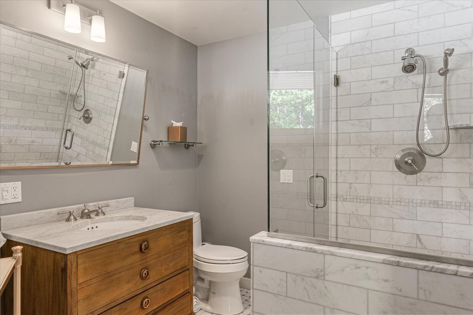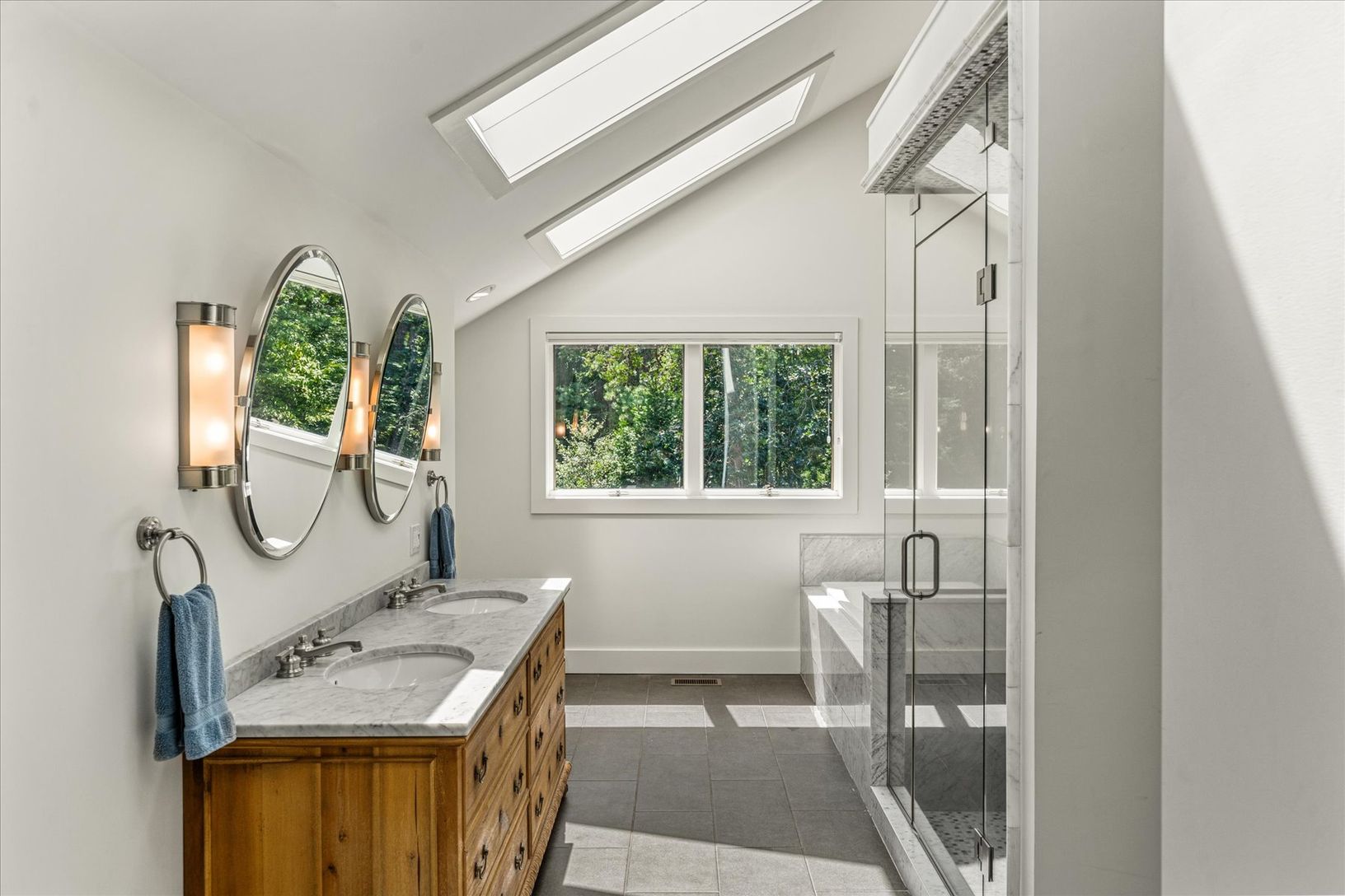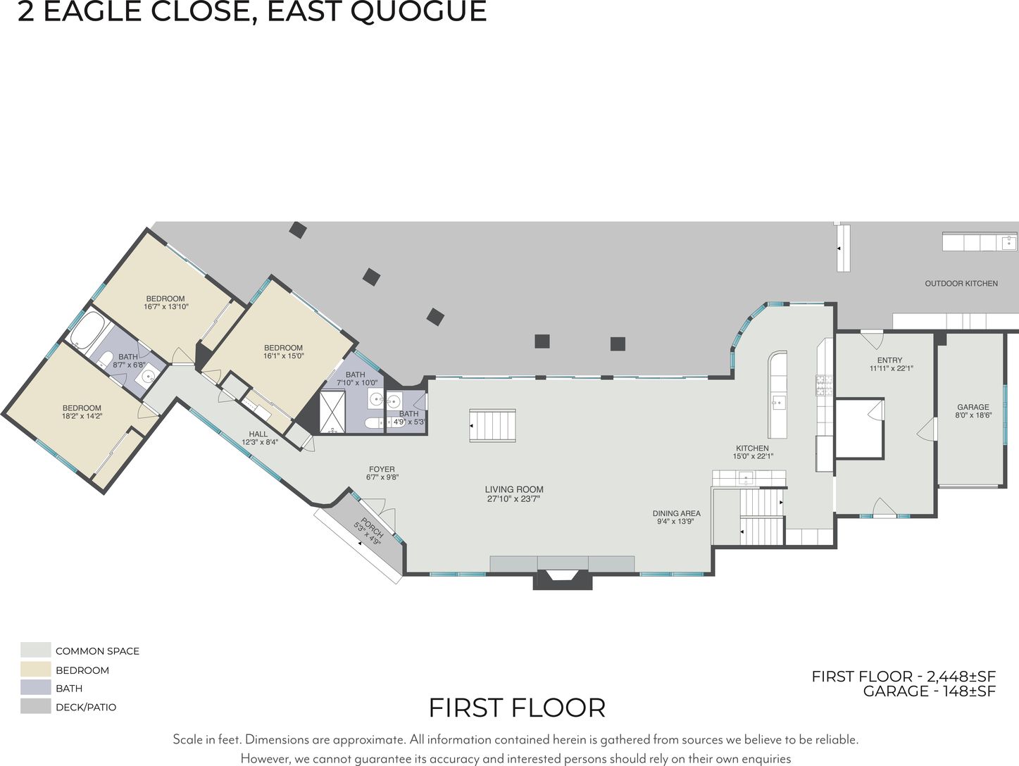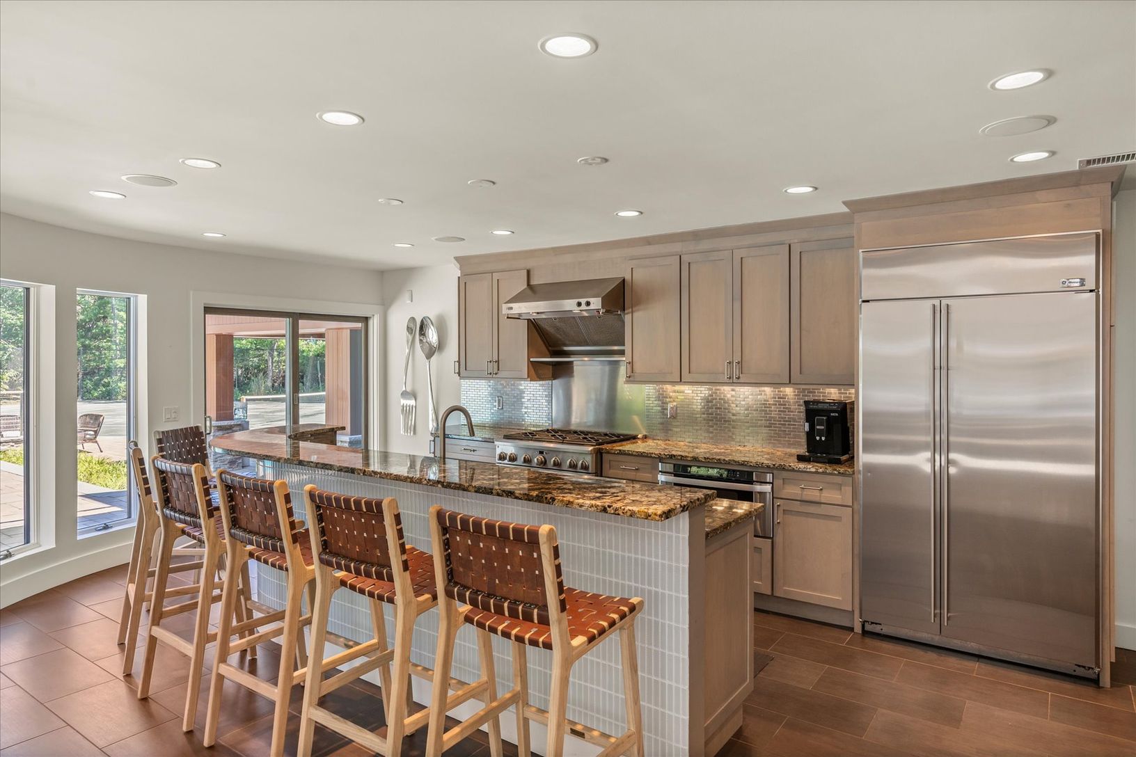 An extraordinary, spacious home bathed in light for family and entertaining and wrapped in mature vegetation awaits at 2 Eagle Close in East Quogue. The fully-renovated private oasis on a 1.4 acre corner lot boasts 5 bedrooms, including two spacious primary suites upstairs with private balconies, 5 baths, two half baths and 3 laundry rooms, one on each floor. Inside, the open floor plan offers breathtaking views of the meticulously redesigned