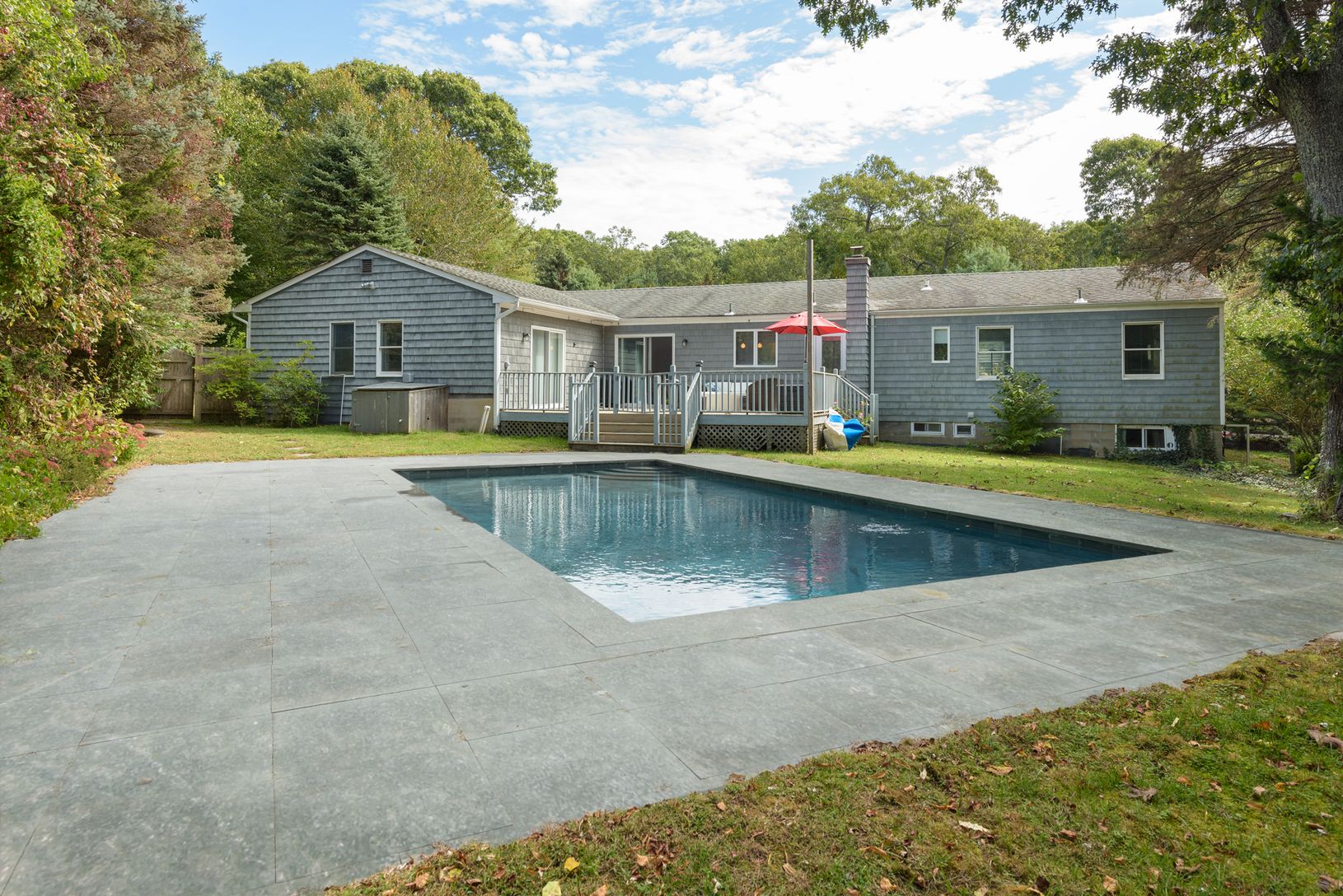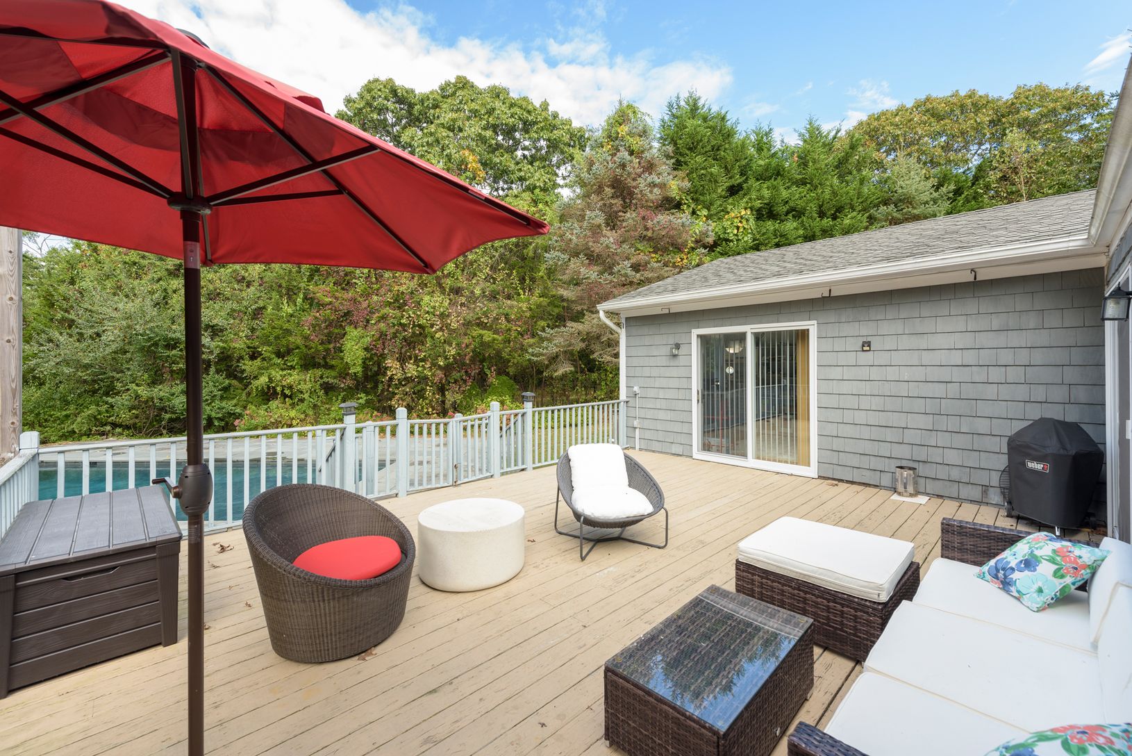 Located in East Hampton's highly sought-after Clearwater Beach area, with a community private beach and marina, this lovely one-level four bedroom, four bath home offers endless opportunities. The bright, open floor plan kitchen area leads to a sun-filled back deck, which overlooks an expansive backyard and heated gunite pool with bluestone decking. The home boasts a large master bedroom suite with wood-burning fireplace and en-suite bath. The