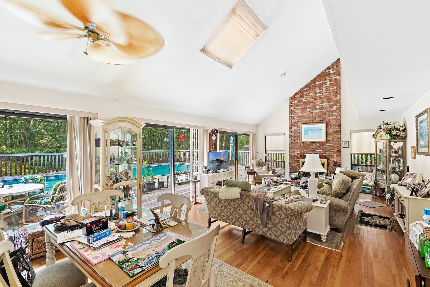 Moments to North Sea Harbor and the Great Peconic Bay! Minutes to Southampton Village and famed ocean beaches. On a secluded dead end street this .62 acre three bedroom and two bathroom awaits you filled with an abundance of natural light. Perfect for entertaining the open concept main floor has a large living room with wood burning fireplace a lovely dining space and kitchen with sliding doors out to a large deck and pool. Also on the first f