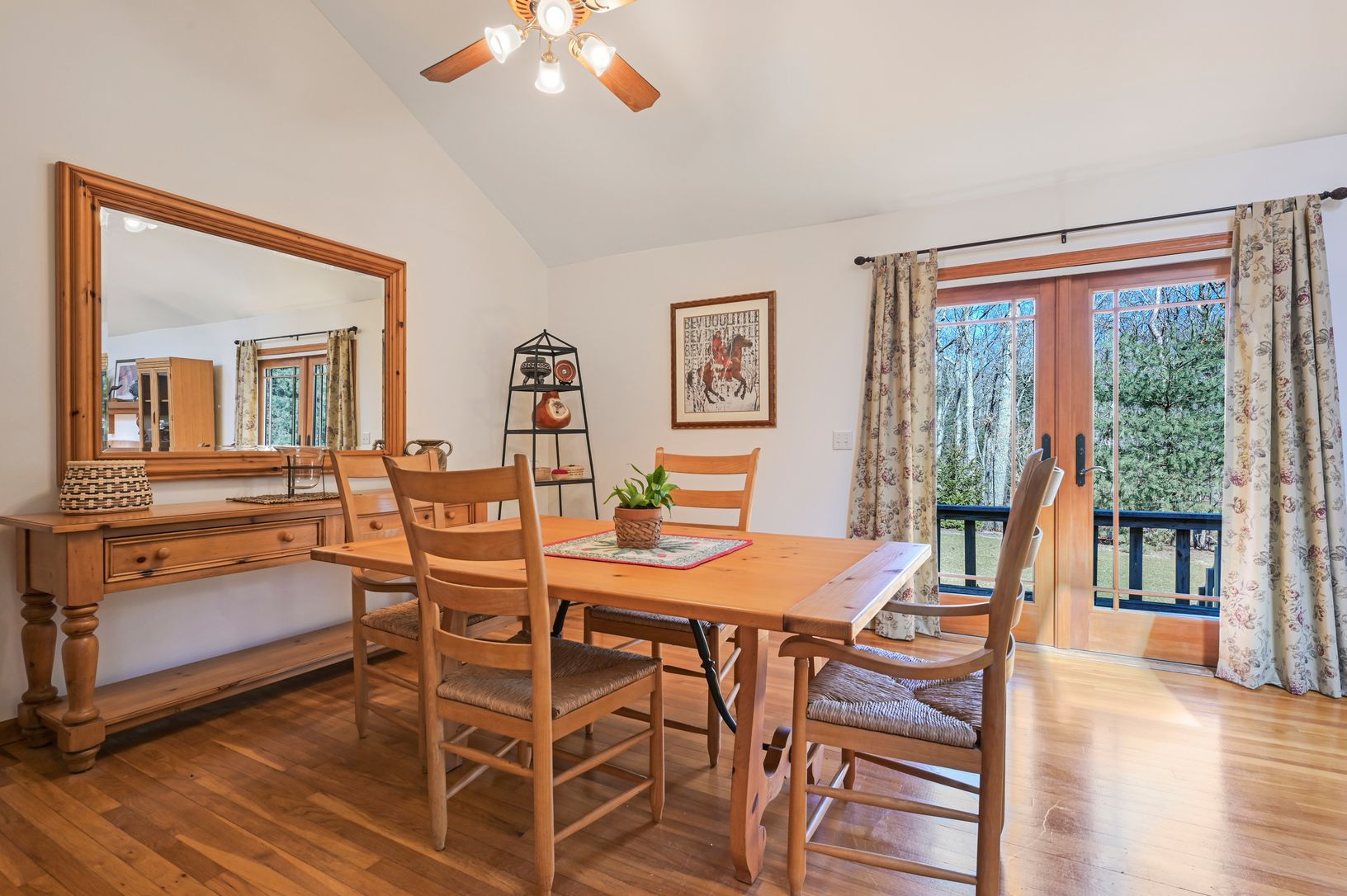 The open floor plan incorporates the dining and living areas with a fireplace and large windows and French doors that open to the deck overlooking the back yard. The large eat-in kitchen has stainless steel appliances and flows into the dining area. The home offers a spacious mast
