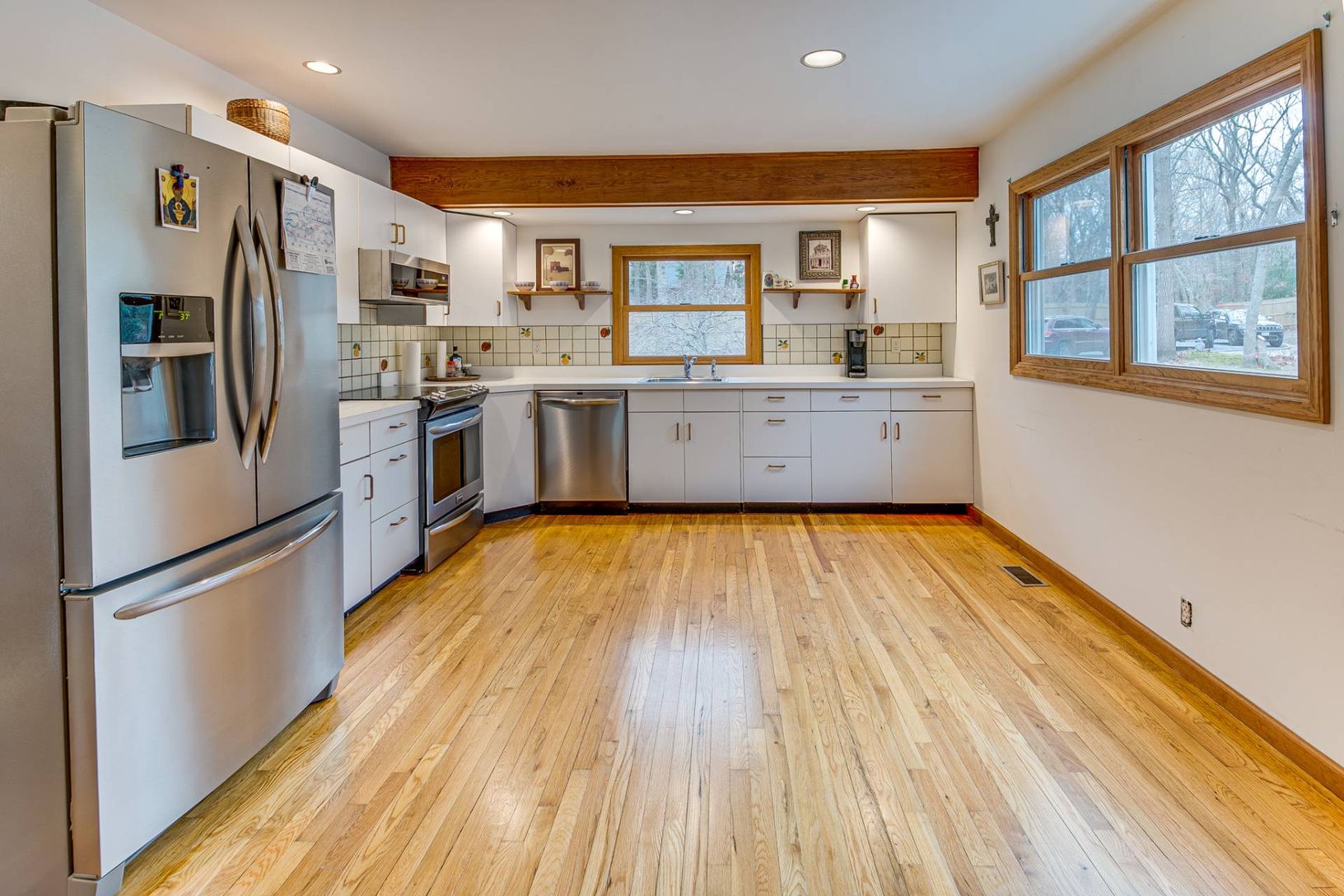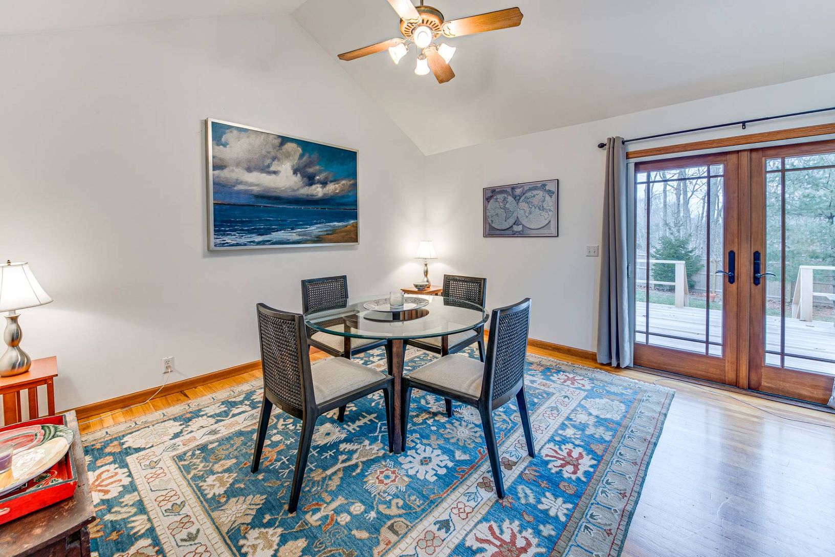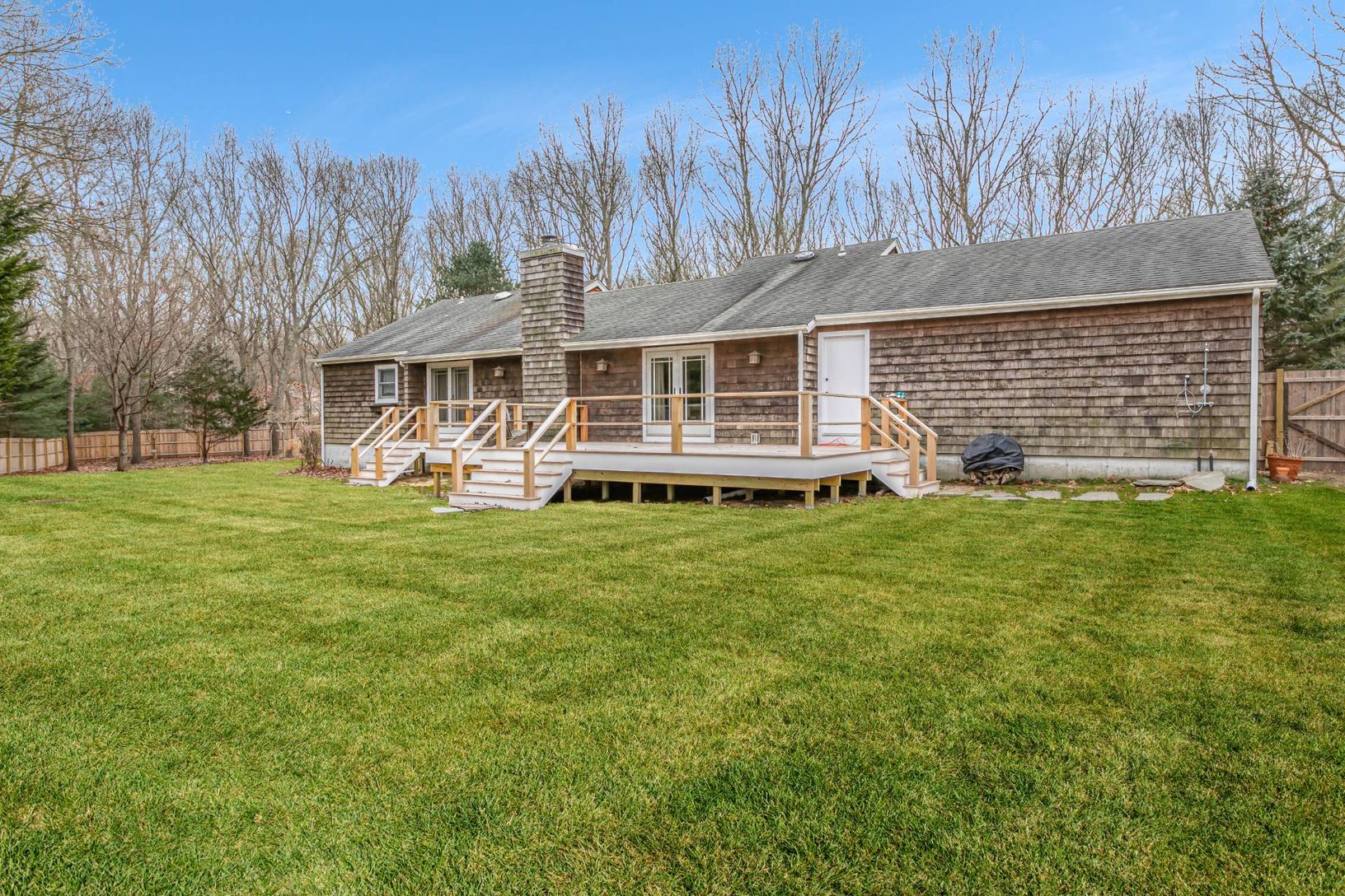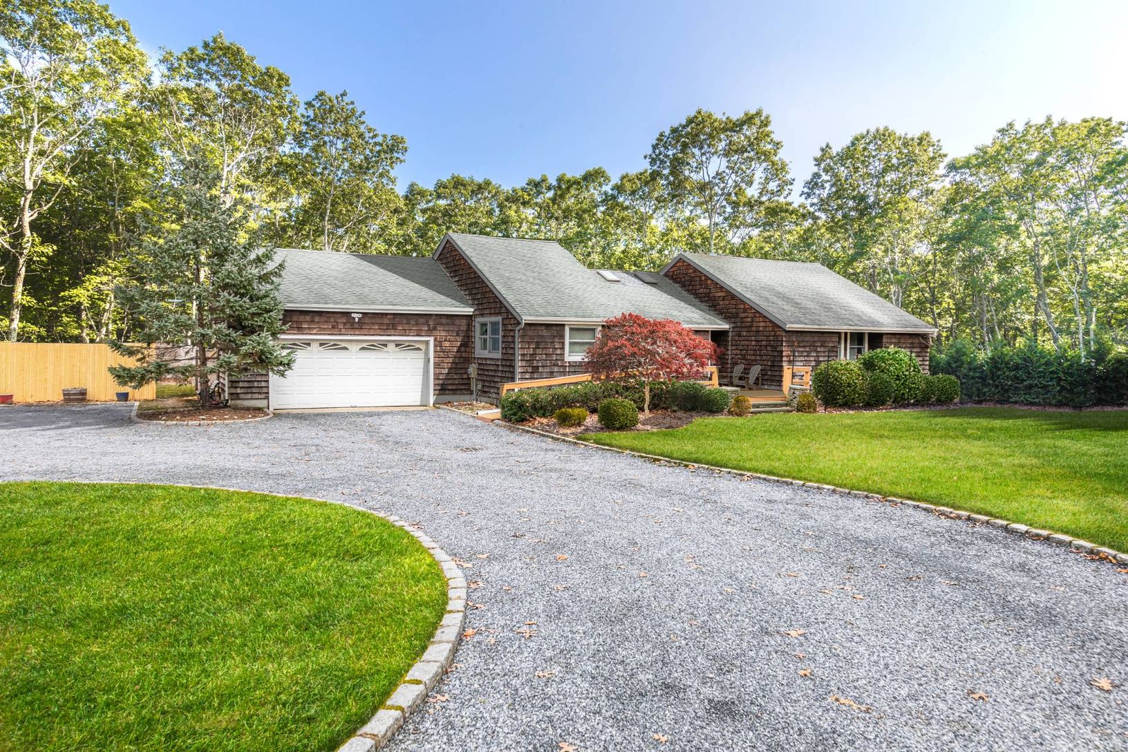 This one level ranch with cathedral ceilings is situated at the end of a private road affording the owner the utmost in privacy, yet located within a three minute drive of Southampton Village. The spacious one acre parcel is fully clearable, but has many large, mature trees that you will want to keep. Recent improvements include 6' high privacy fencing around the entire perimeter of the property; a beautiful entry gate; and expansive new mahog