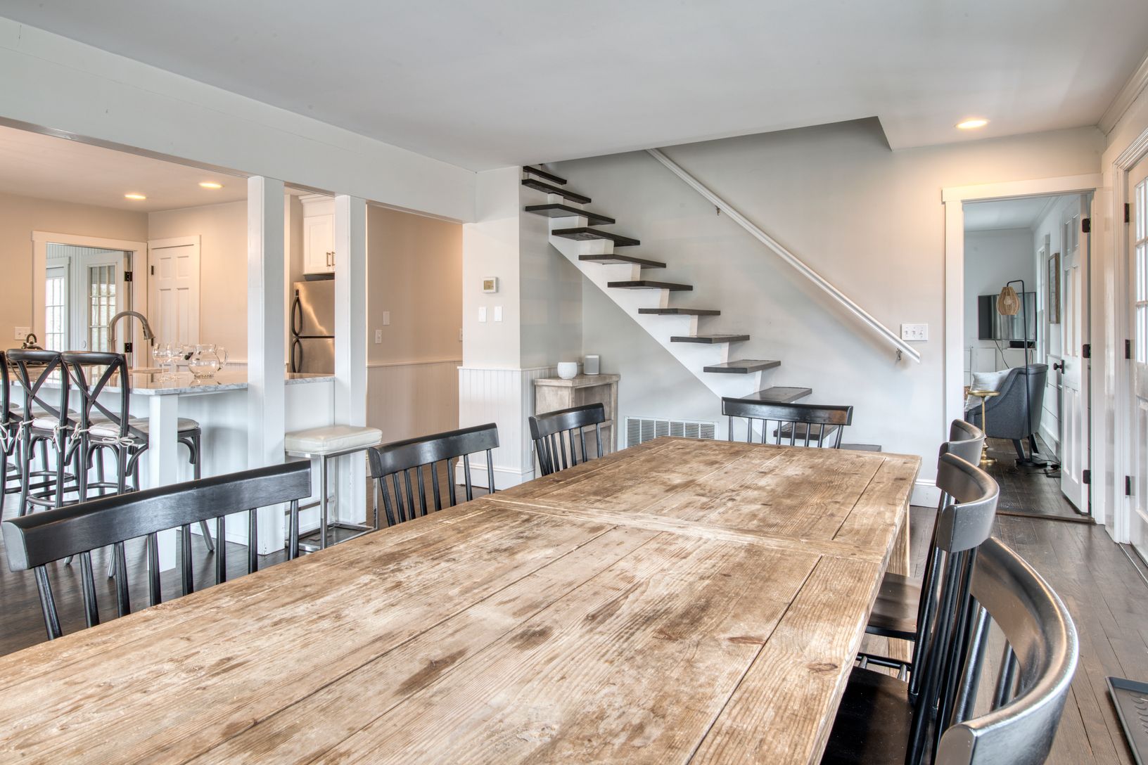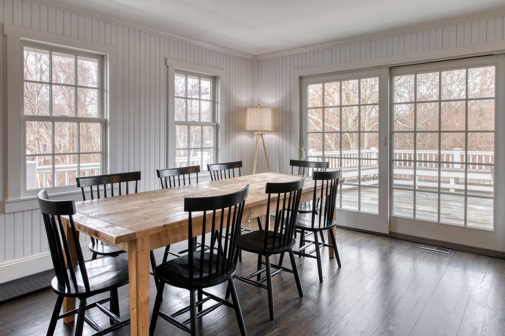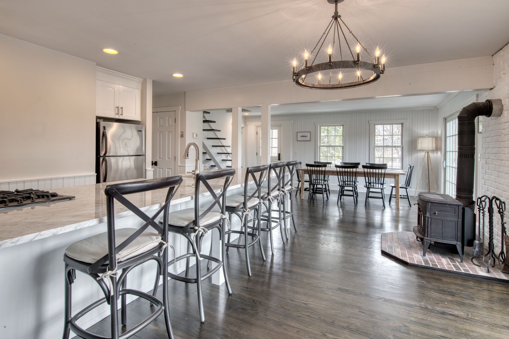Modern and Pristine light filled 2200sf 5 bedroom Beach House in Shelter Island's South Ferry Hills. The open floor plan highlights the oversized marble center island kitchen with seating for 5 and french doors leading out to a huge mahogany deck for entertaining and casual lounging. The first floor also includes a den, a formal living area with walls of windows a primary bedroom and bath. while a secondary den offers plenty of space for enter