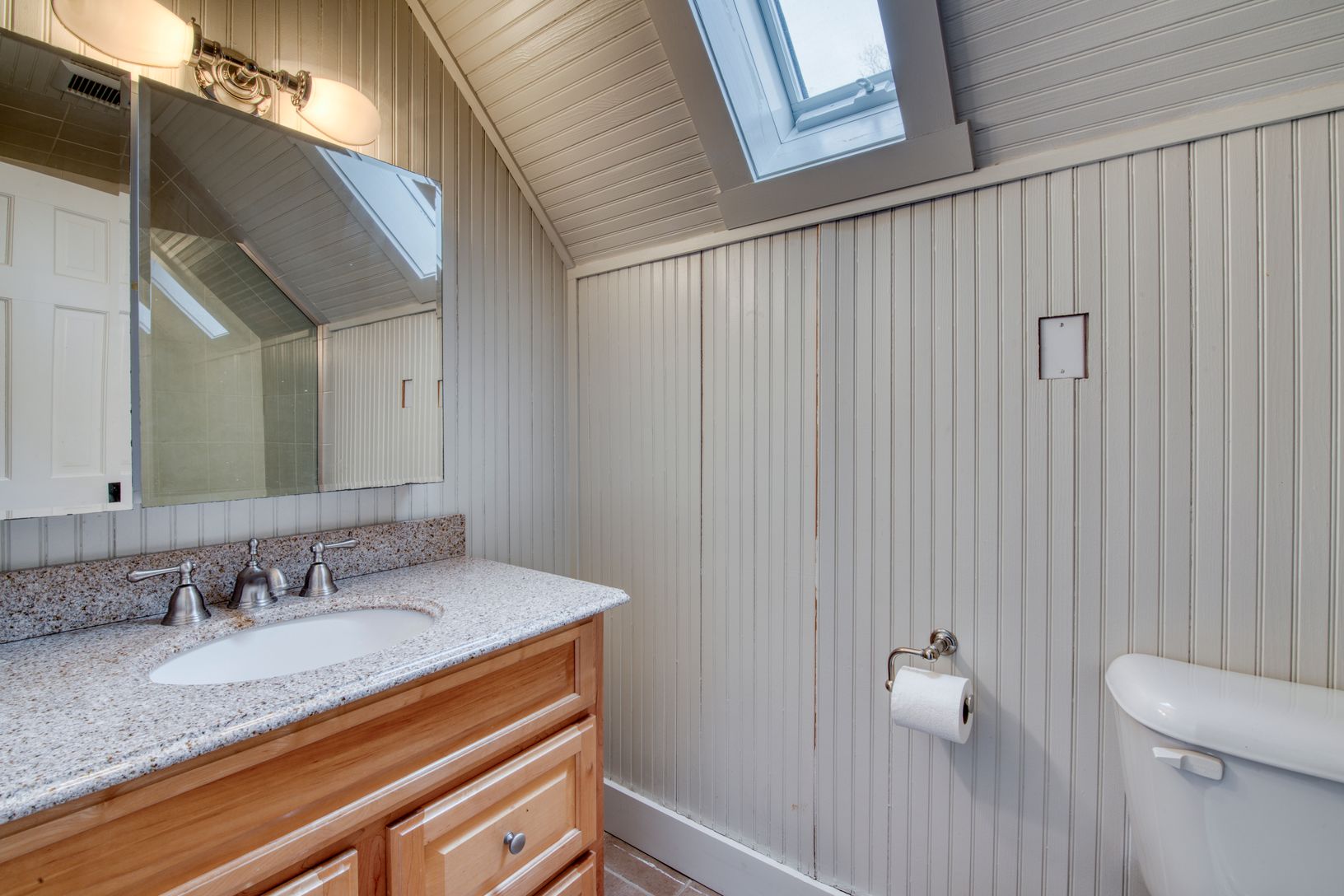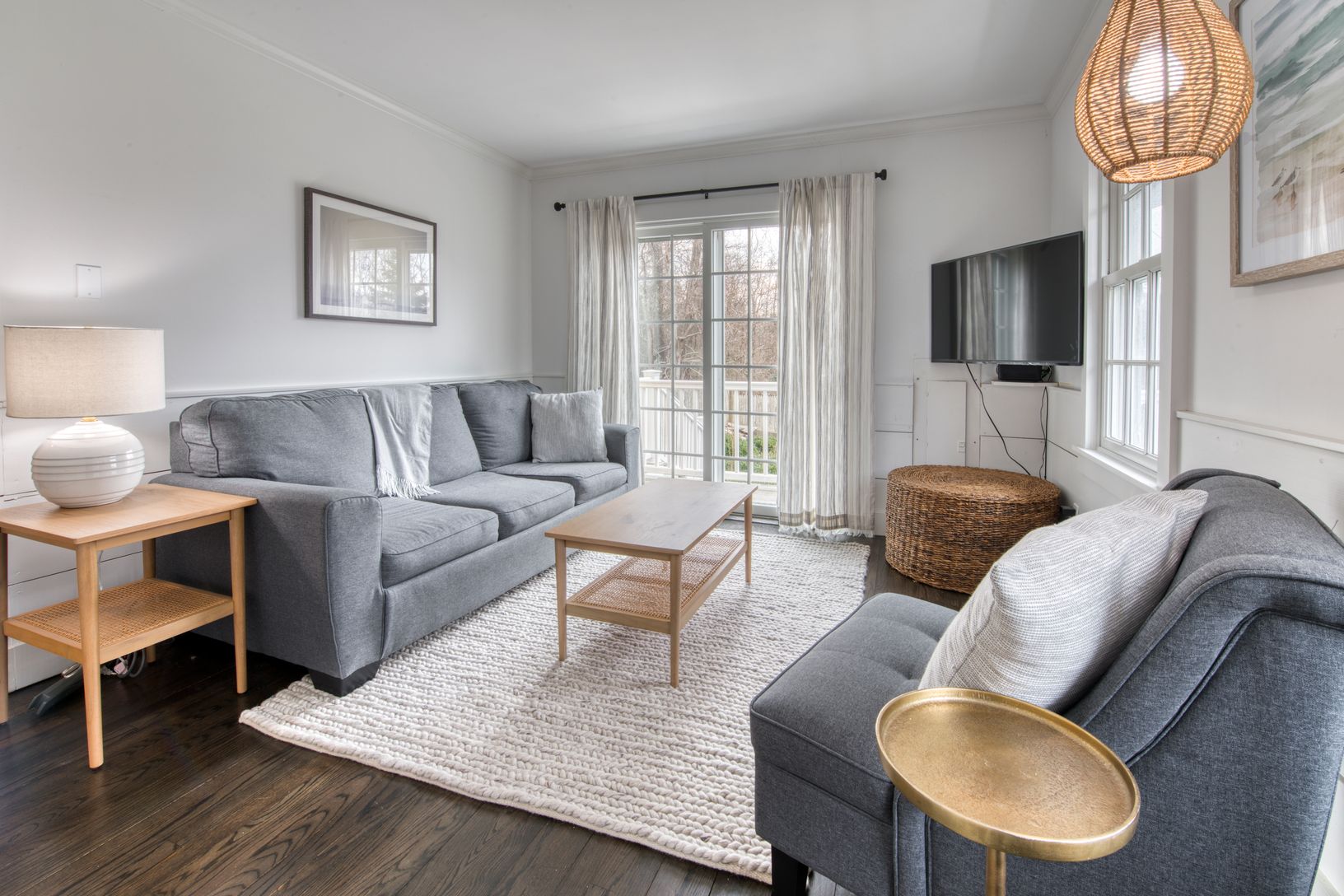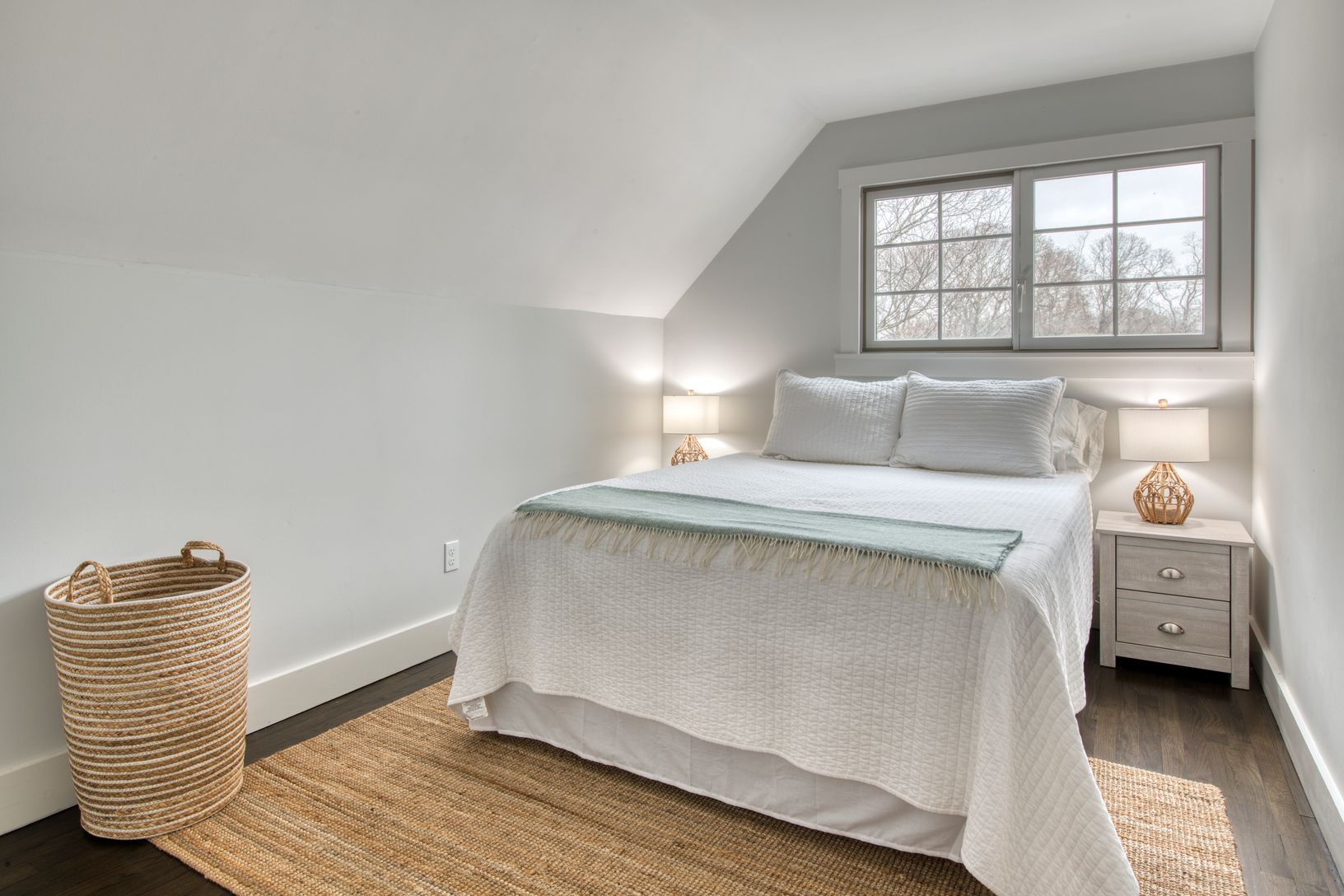 Modern and Pristine light filled 2200sf 5 bedroom Beach House in Shelter Island's South Ferry Hills. The open floor plan highlights the oversized marble center island kitchen with seating for 5 and french doors leading out to a huge mahogany deck for entertaining and casual lounging. The first floor also includes a den, a formal living area with walls of windows a primary bedroom and bath. while a secondary den offers plenty of space for enter