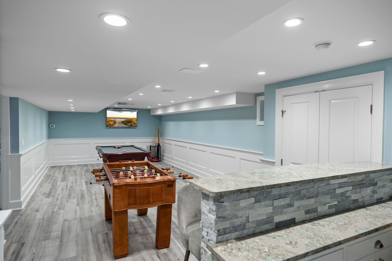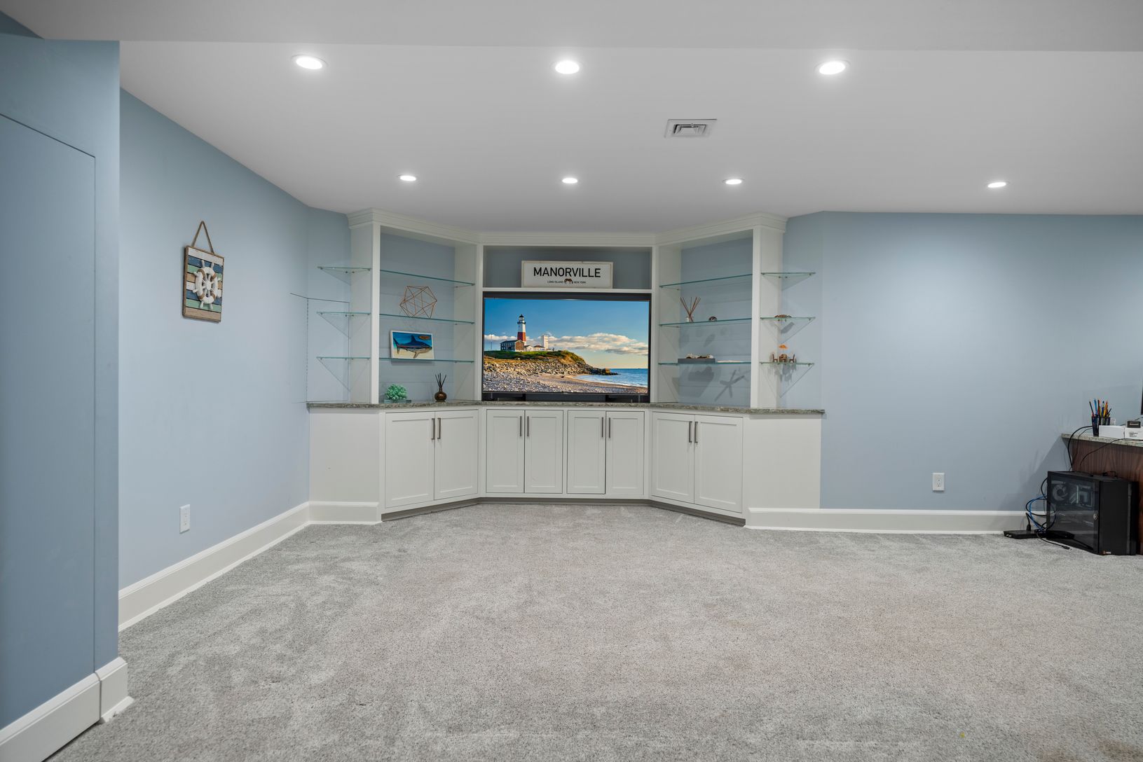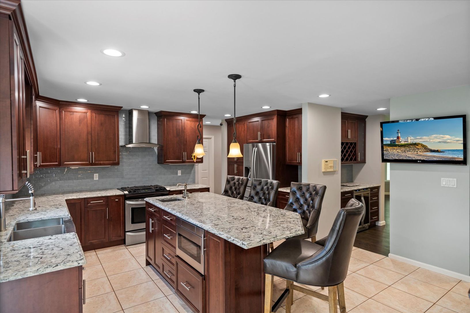 Welcome to this exceptional 5-bedroom, 4.5-bathroom residence nestled on a full acre in the heart of Manorville. Thoughtfully designed for both everyday living and elevated entertaining, this home offers over 4,000 sq ft of beautifully finished space—including a fully finished lower level and a backyard retreat that feels like a private resort. The first floor welcomes you with a classic front porch, a sun-drenched living room, a cozy den with
