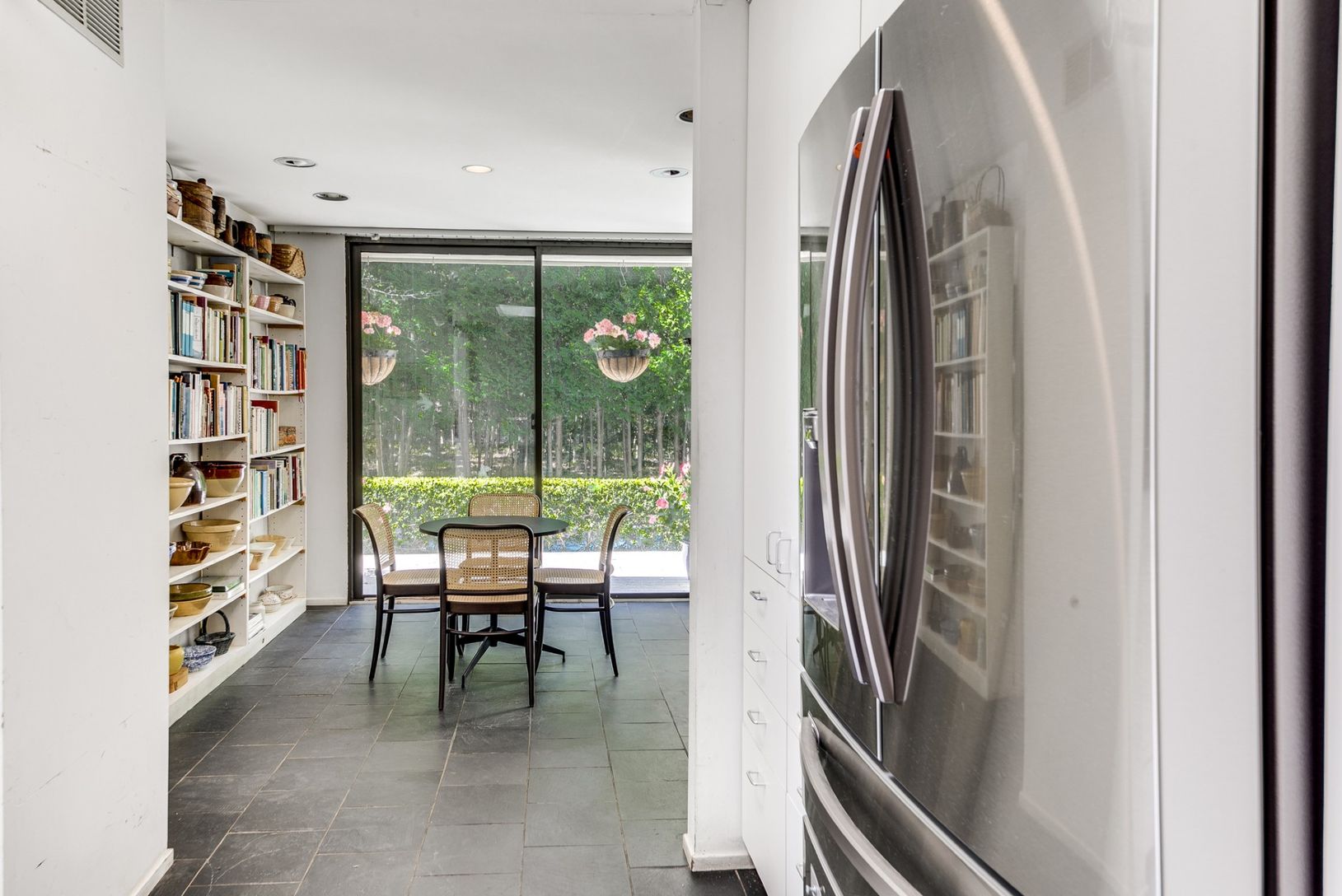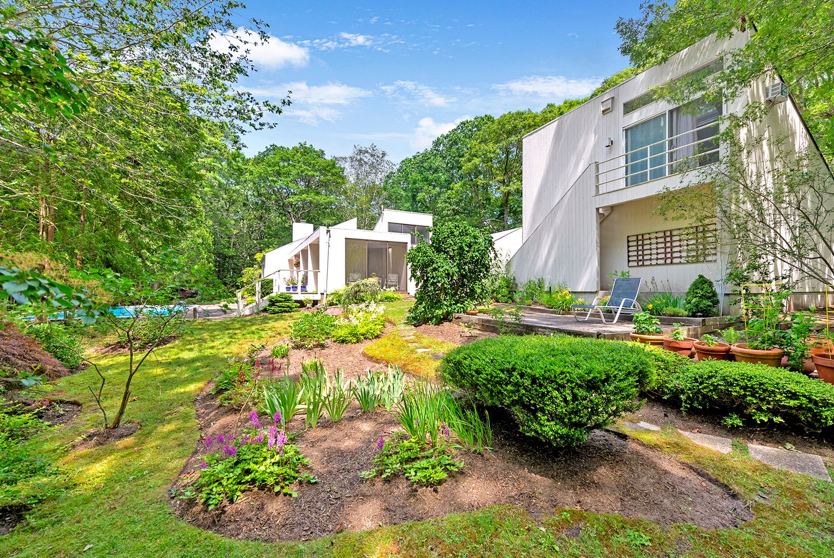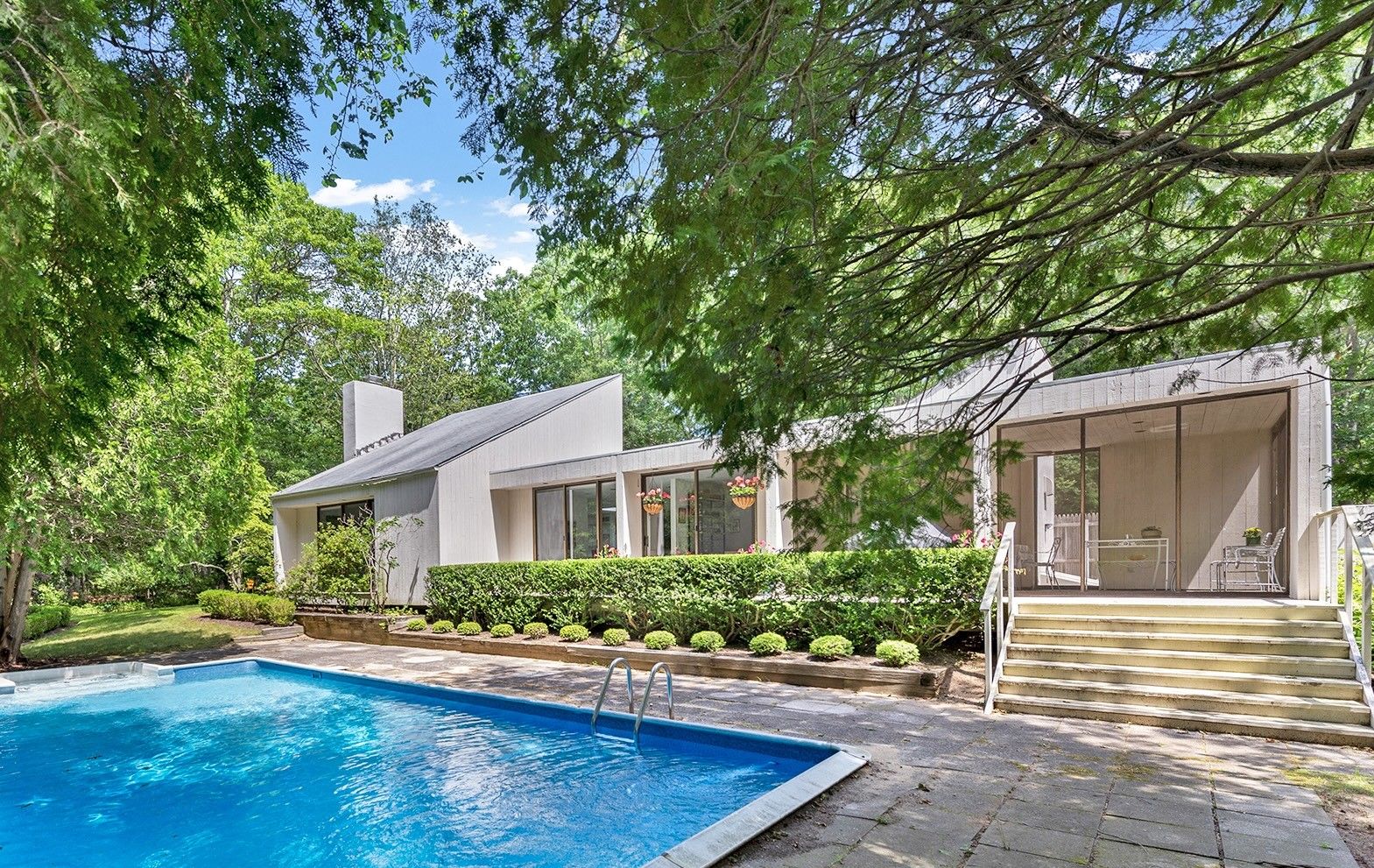 This modern style home sits on a 1.5 acre lot bordered by reserve and is located just outside the village of East Hampton in the highly desirable neighborhood of Old Orchard. The existing one-story structure was created by award winning designer, architect and author Albert Herbert. It has a mid-century modern aesthetic with simple geometric forms, expansive glass panes, cathedral ceilings, slate floors, and functional built-ins throughout. As
