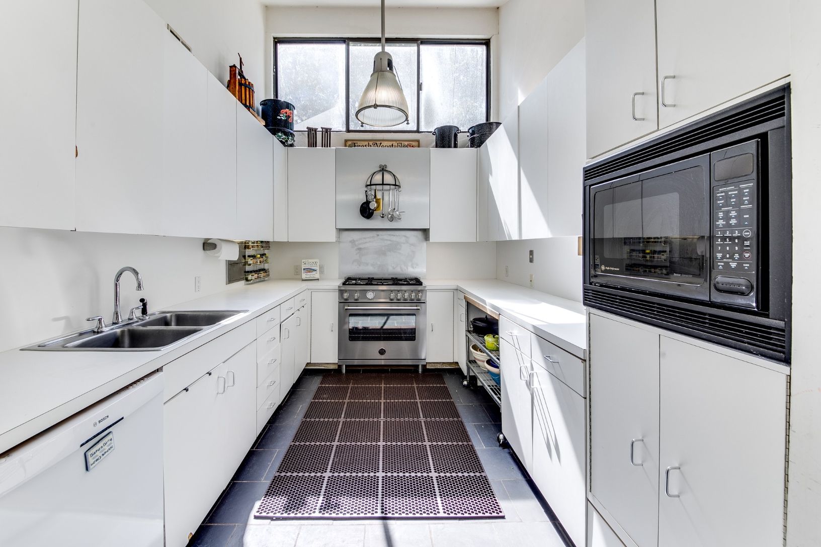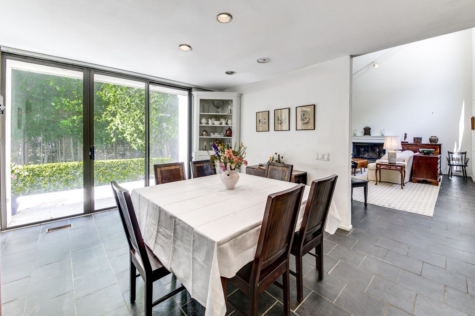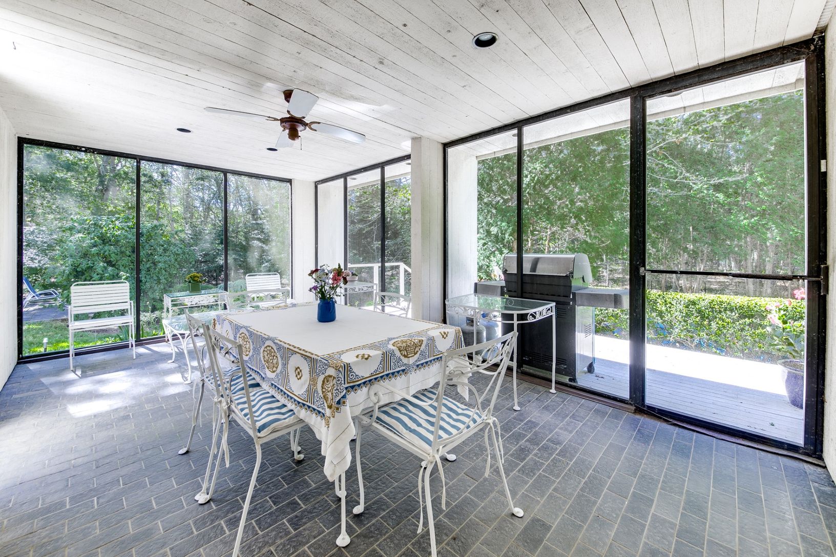 This modern style home sits on a 1.5 acre lot bordered by reserve and is located just outside the village of East Hampton in the highly desirable neighborhood of Old Orchard. The existing one-story structure was created by award winning designer, architect and author Albert Herbert. It has a mid-century modern aesthetic with simple geometric forms, expansive glass panes, cathedral ceilings, slate floors, and functional built-ins throughout. As
