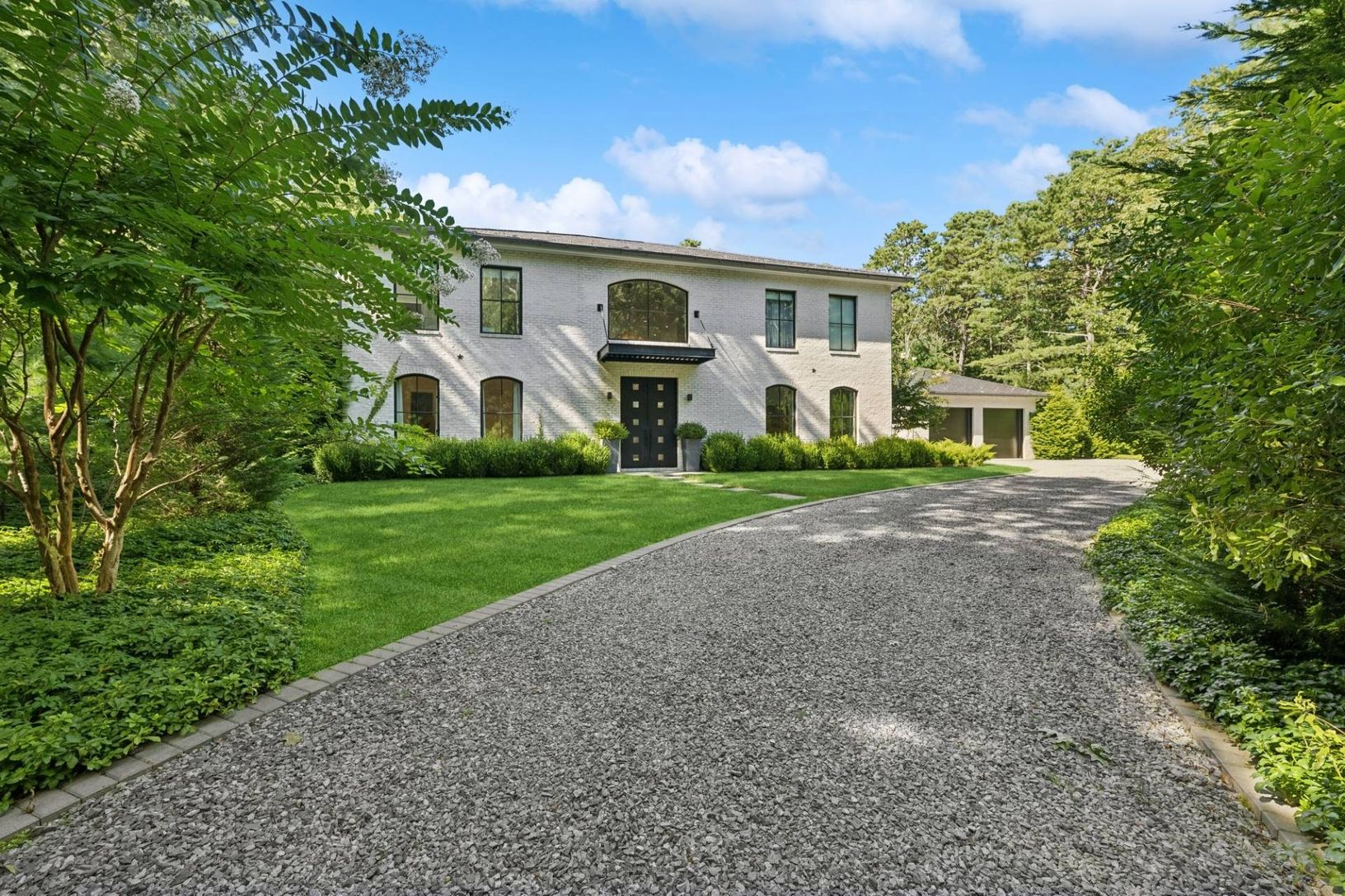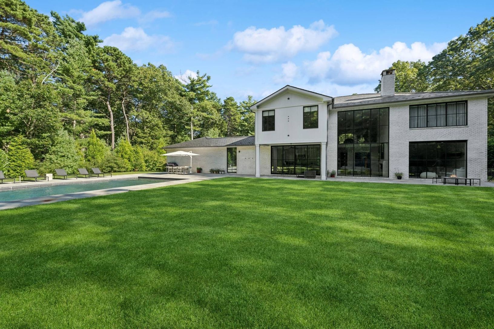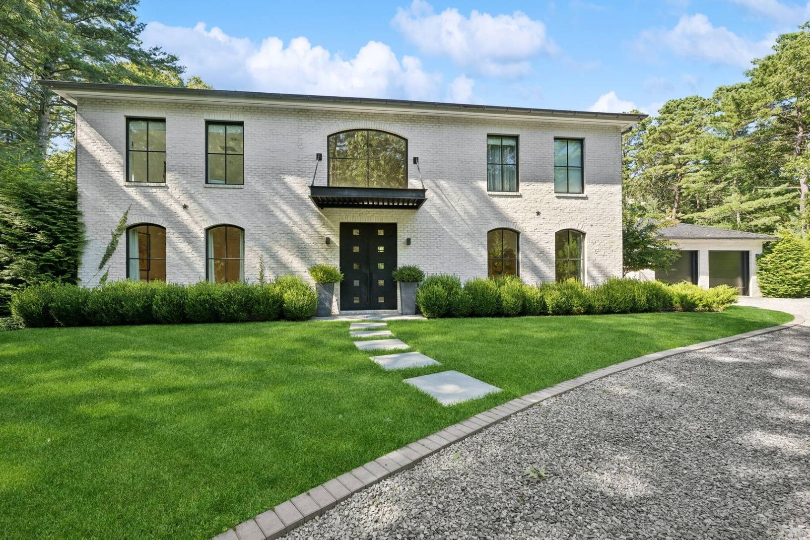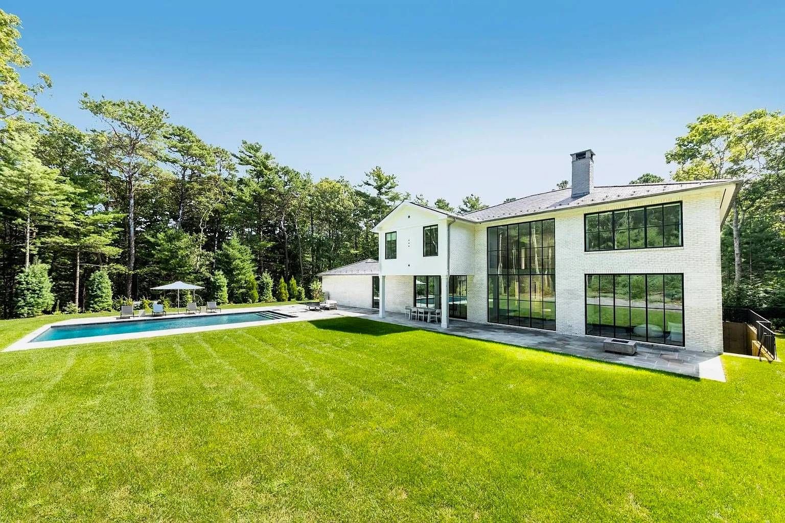 Set off a quiet cul-de-sac on a beautiful 1.67 acre lot surrounded my mature pine forest, this sleek and sophisticated five bedroom white brick home provides a refreshing break from the norm. A two-story wall of glass greets one upon entrance and drenches the great room with fireplace in warm natural light. The eat-in kitchen is open and airy and boasts the top of the line amenities any chef would dream of. A set of expansive sliding glass doo