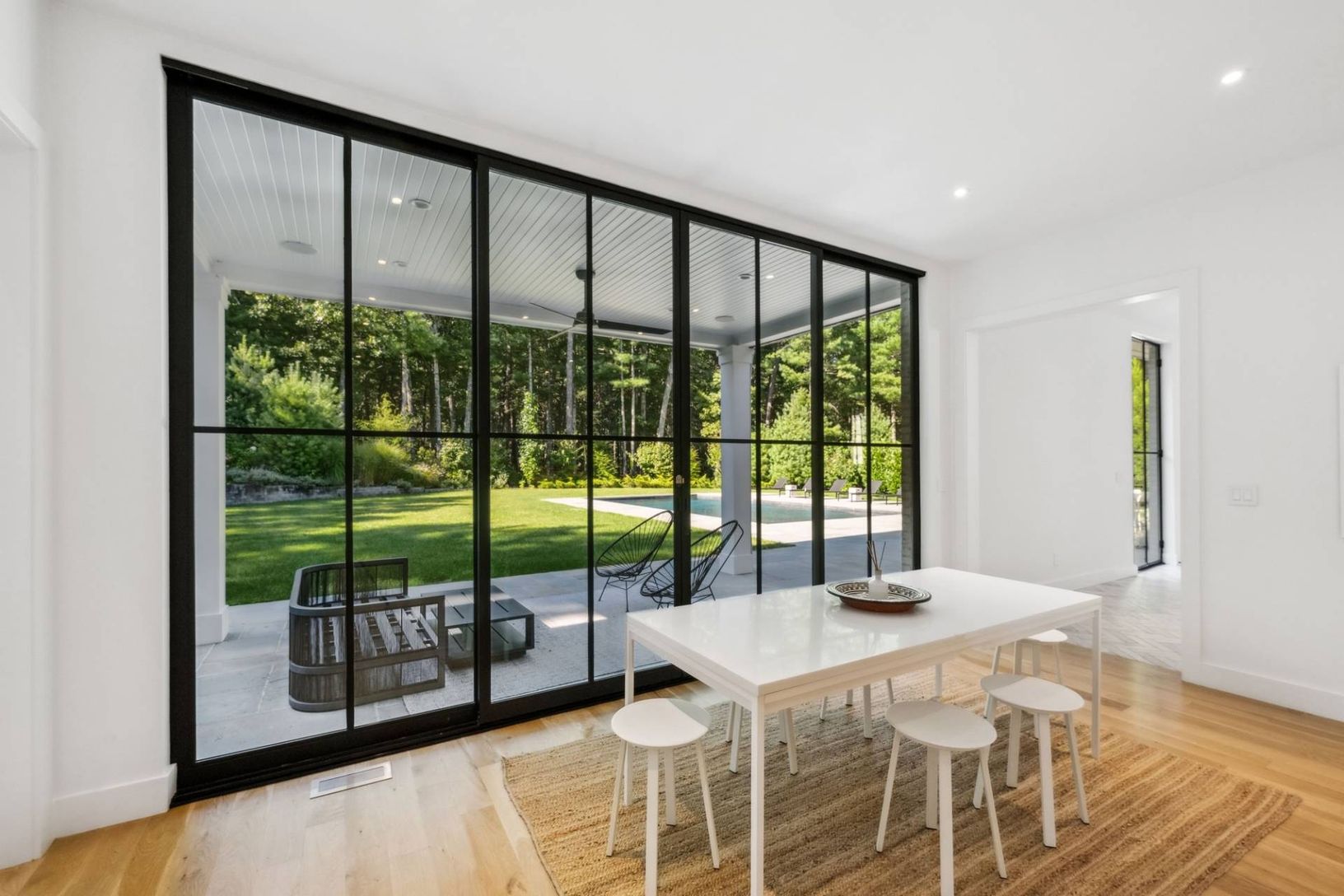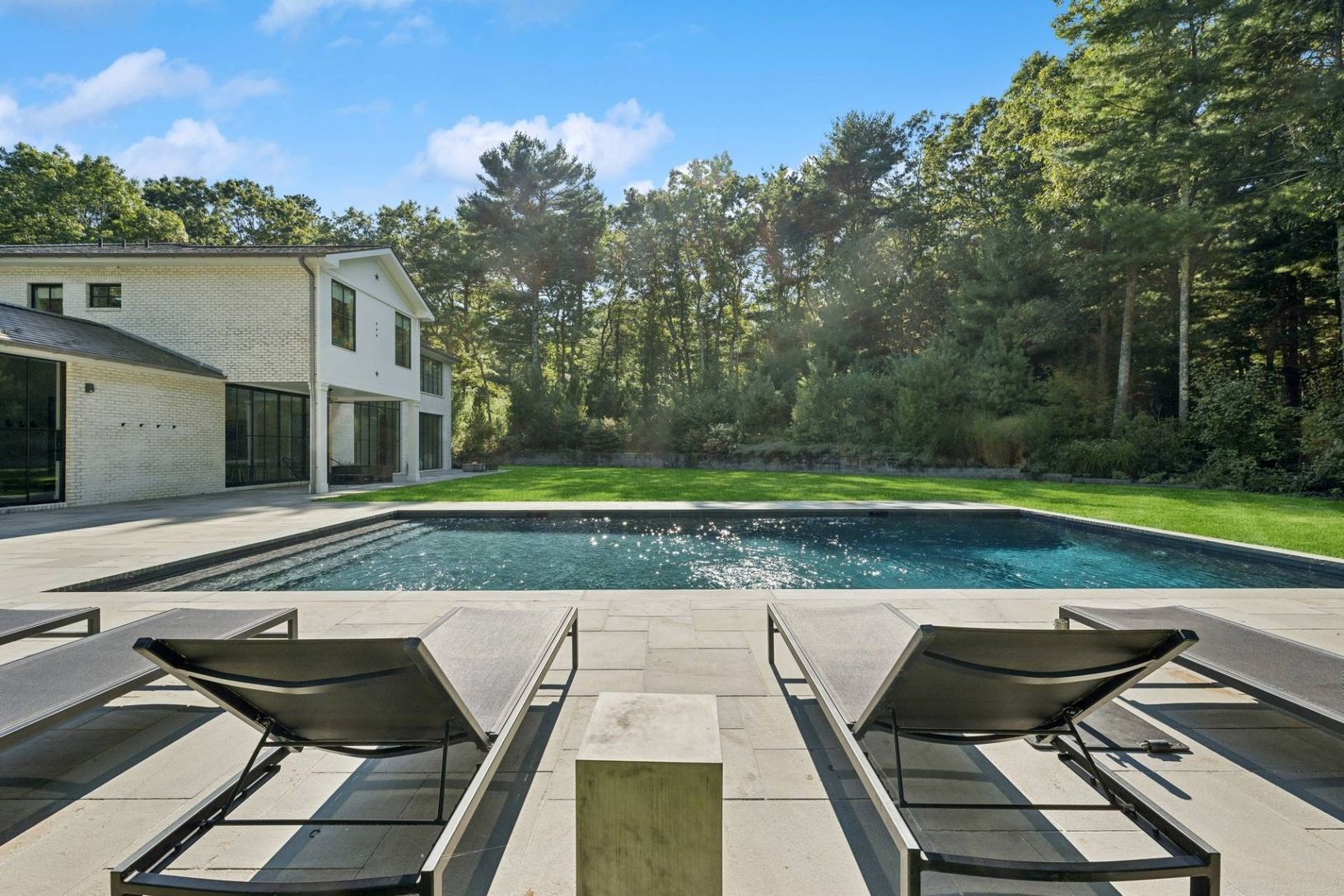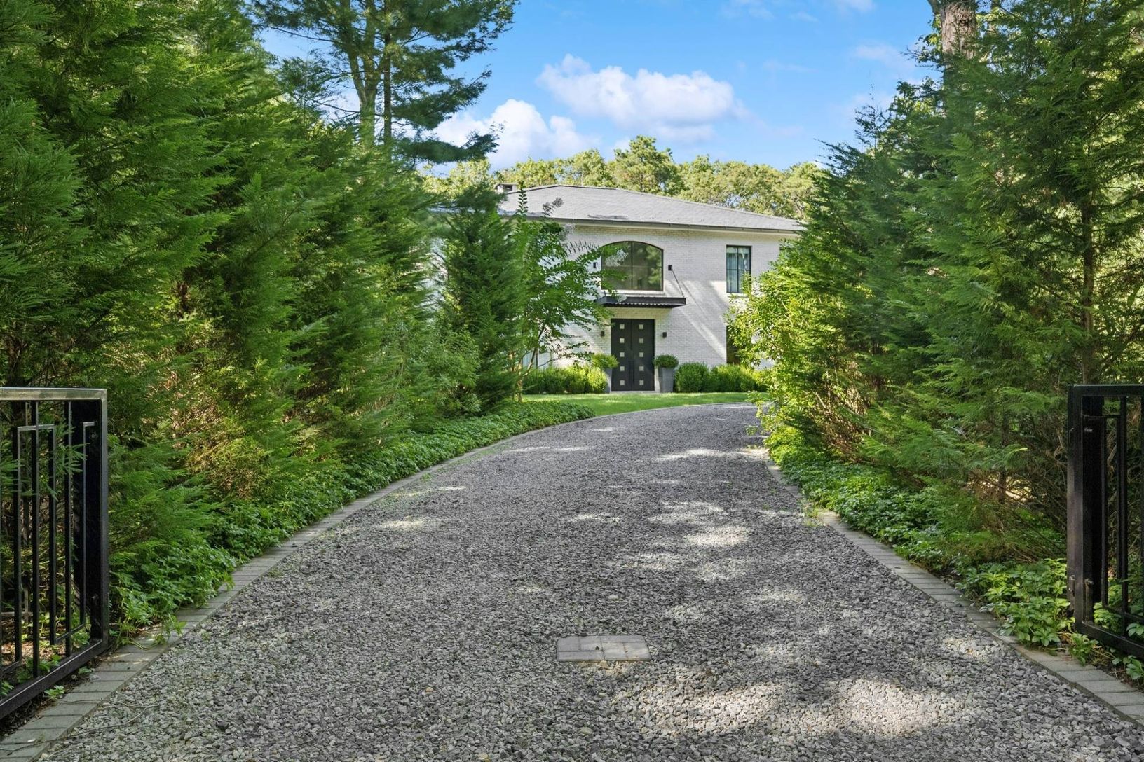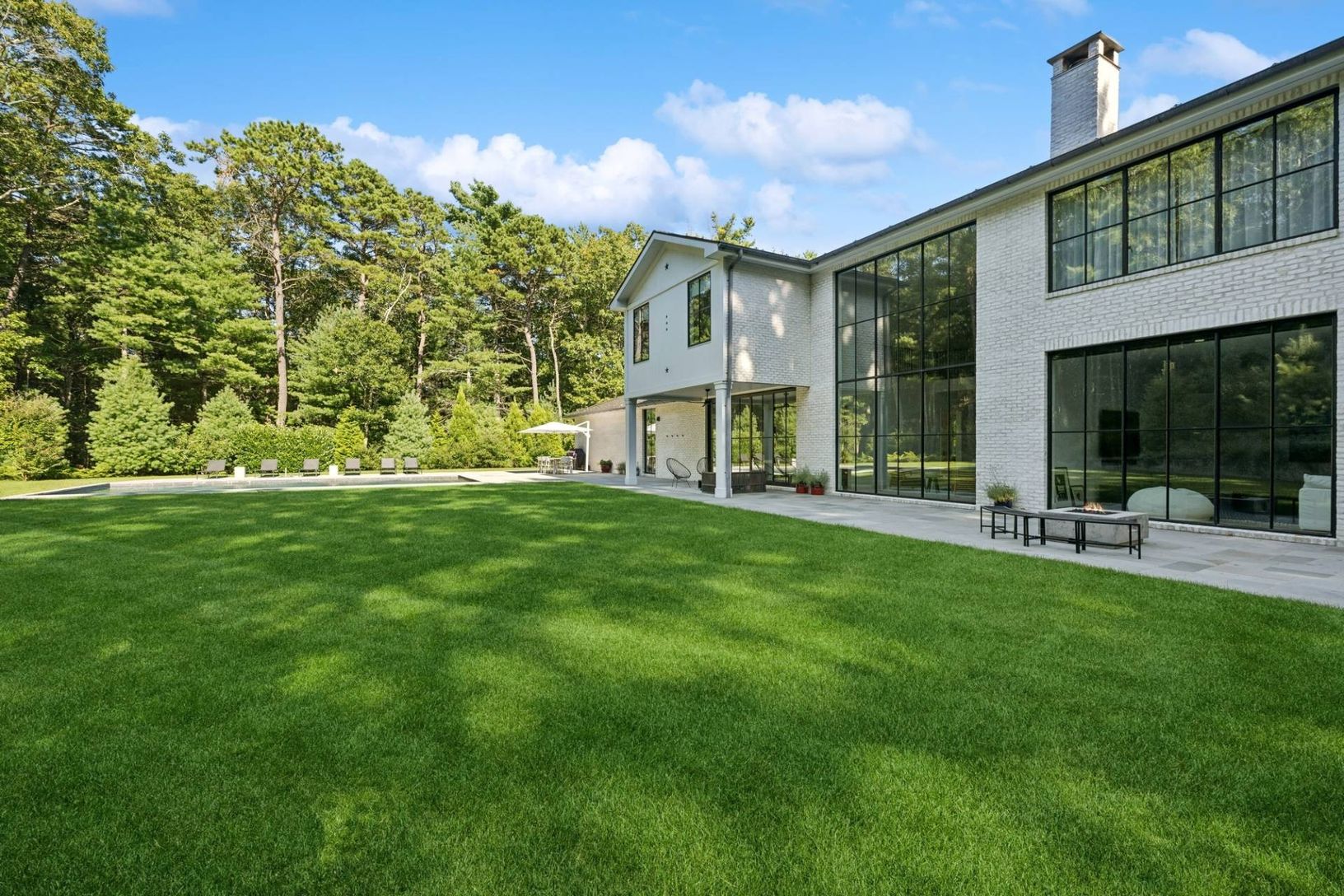 Set off a quiet cul-de-sac on a beautiful 1.67 acre lot surrounded my mature pine forest, this sleek and sophisticated five bedroom white brick home provides a refreshing break from the norm. A two-story wall of glass greets one upon entrance and drenches the great room with fireplace in warm natural light. The eat-in kitchen is open and airy and boasts the top of the line amenities any chef would dream of. A set of expansive sliding glass doo