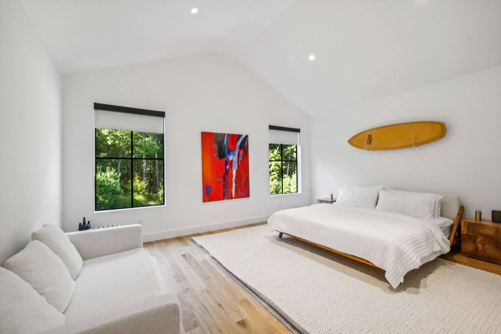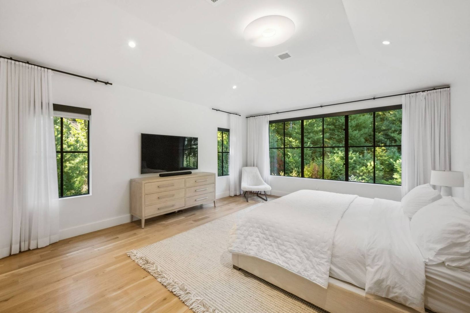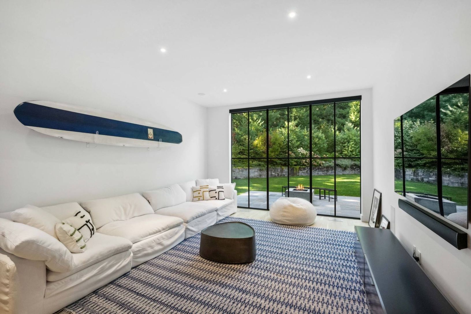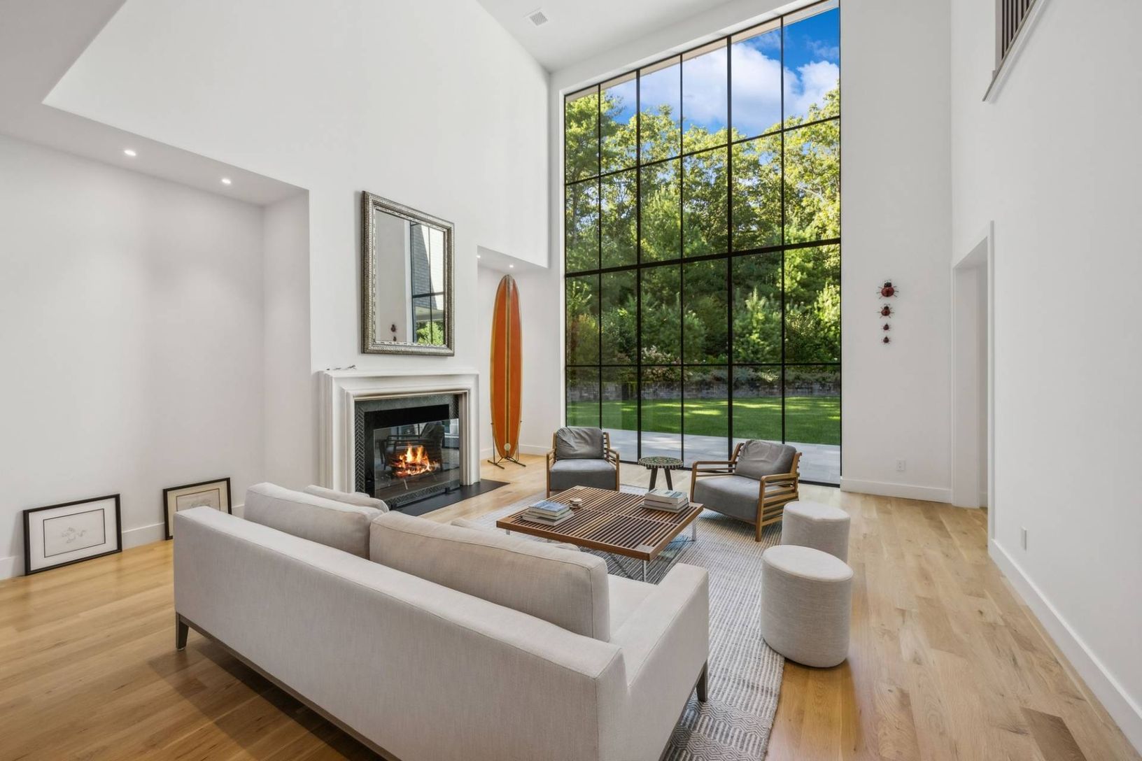 Set off a quiet cul-de-sac on a beautiful 1.67 acre lot surrounded my mature pine forest, this sleek and sophisticated five bedroom white brick home provides a refreshing break from the norm. A two-story wall of glass greets one upon entrance and drenches the great room with fireplace in warm natural light. The eat-in kitchen is open and airy and boasts the top of the line amenities any chef would dream of. A set of expansive sliding glass doo