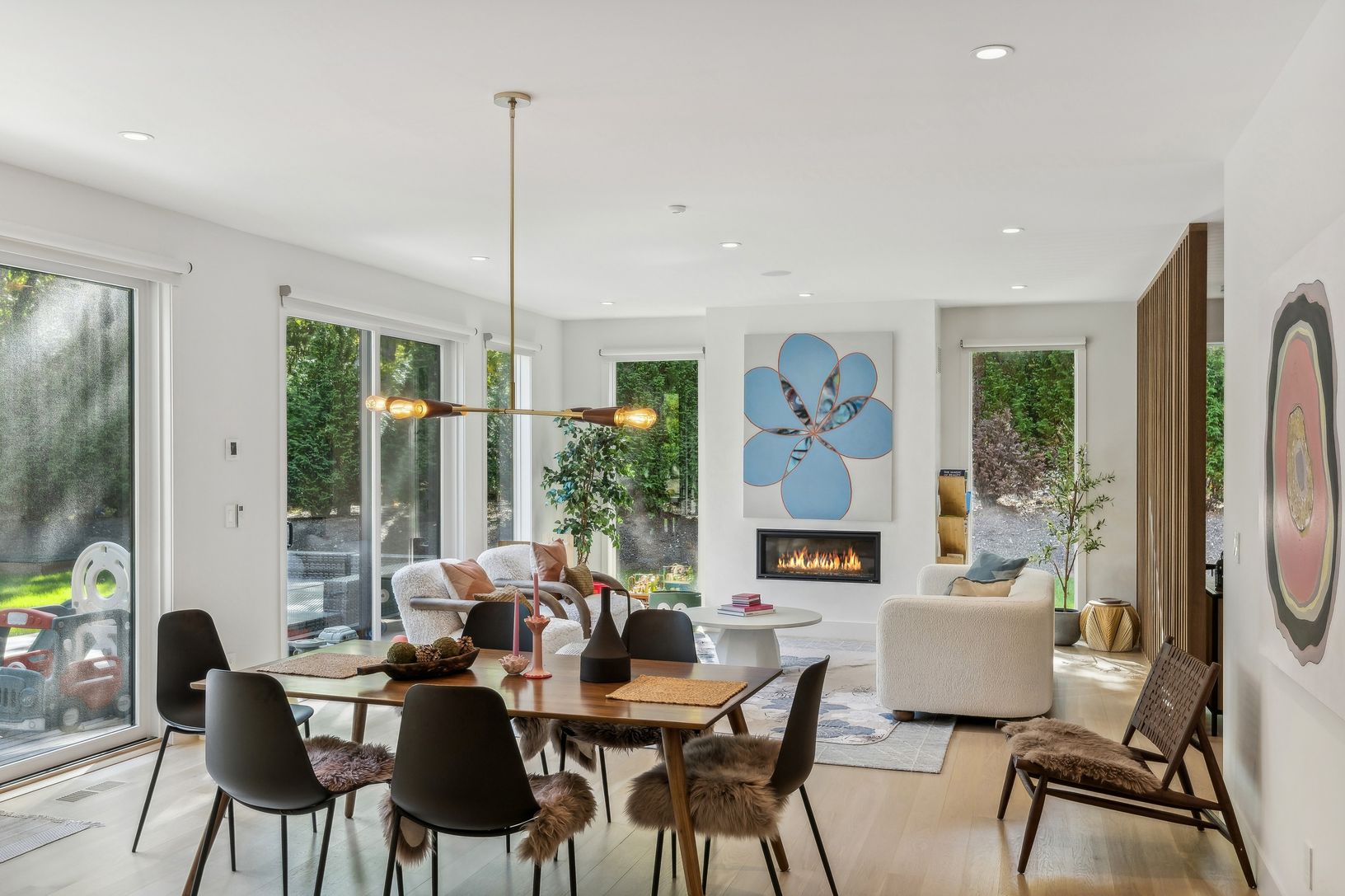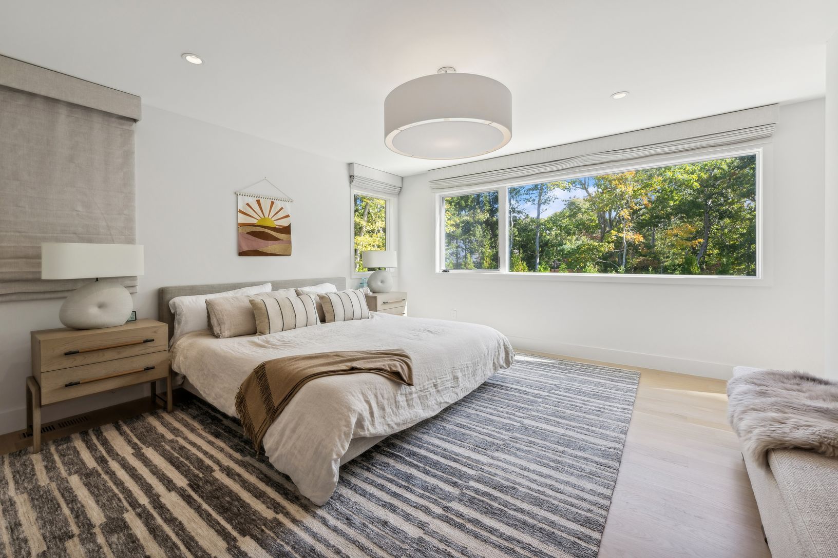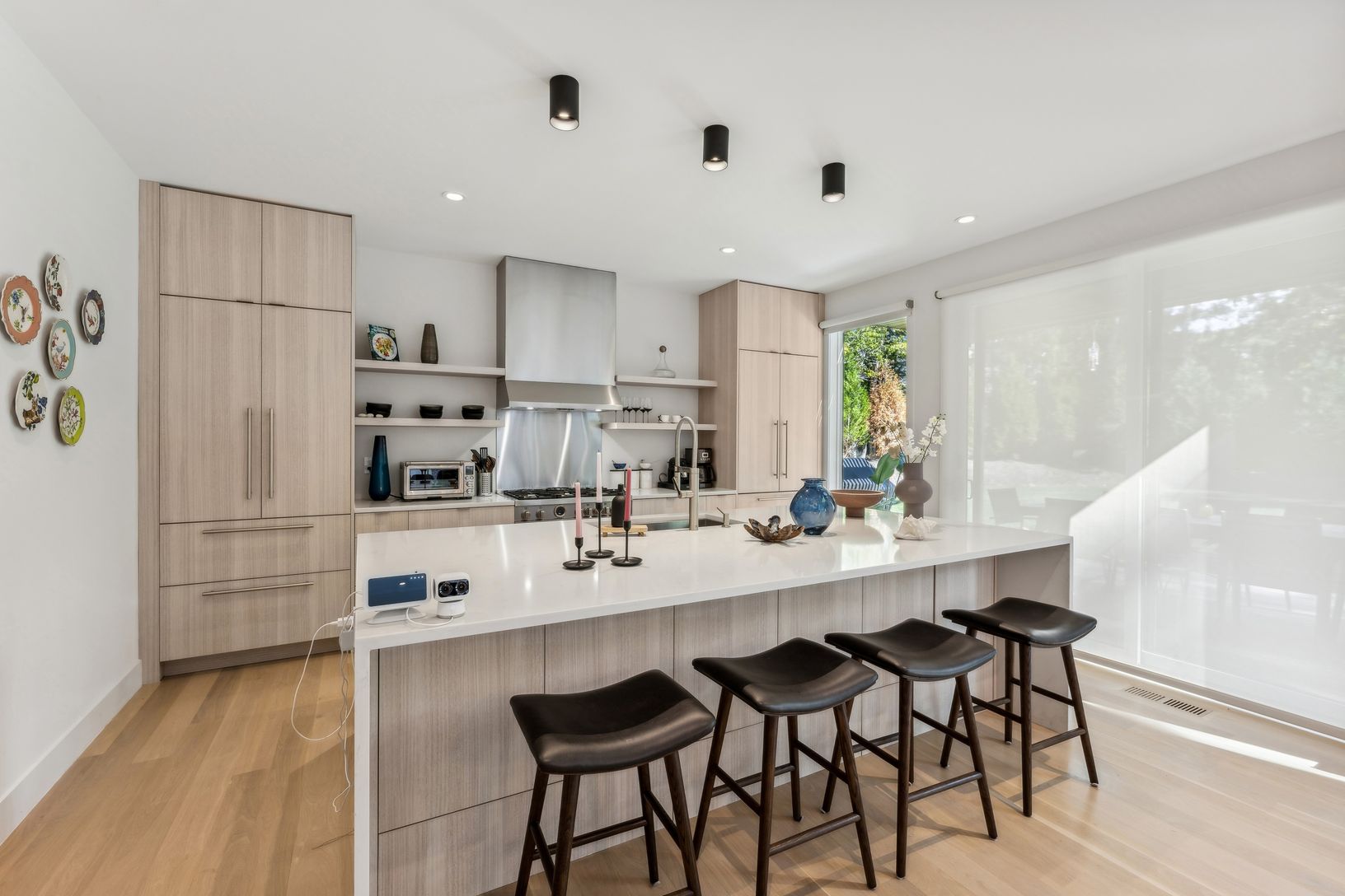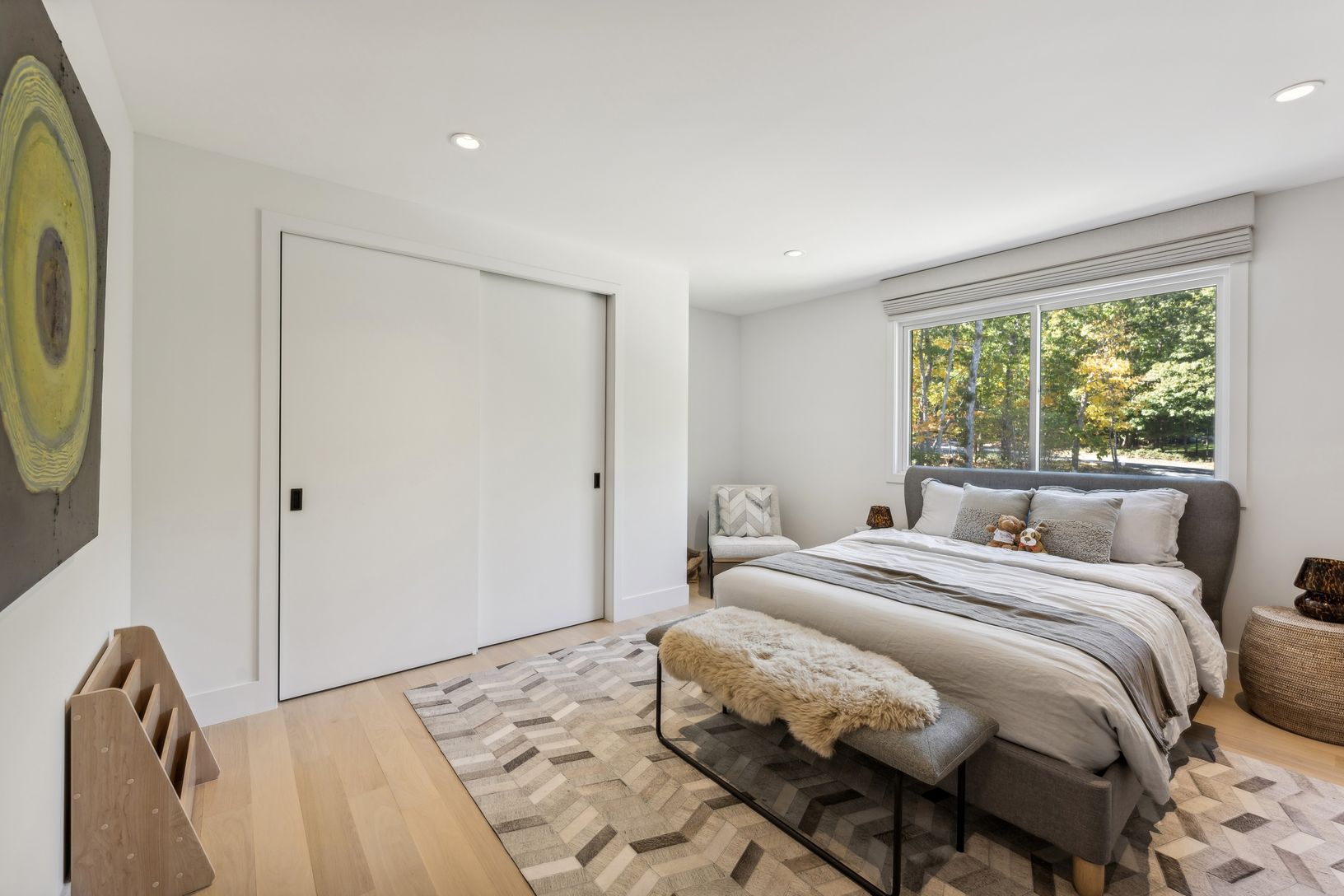 Discover a remarkable modern residence available for rent, designed for those who appreciate both elegance and sustainability. This spacious home spans around 4,000 sq. ft., featuring a sophisticated blend of contemporary architecture and inviting interiors. Arrive via a charming crushed stone driveway, leading to a striking facade of glass and cedar. Upon entering, you'll find a stunning floating steel staircase that sets the tone for this ex